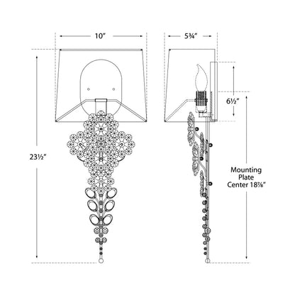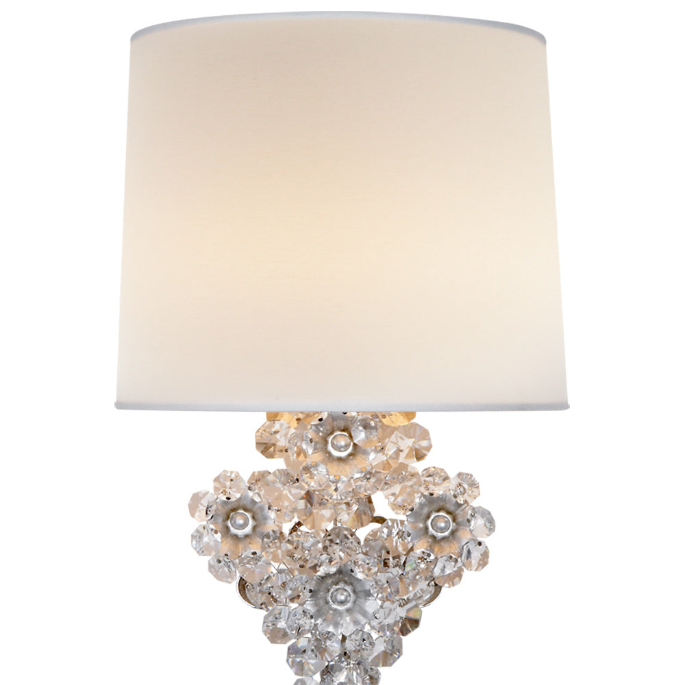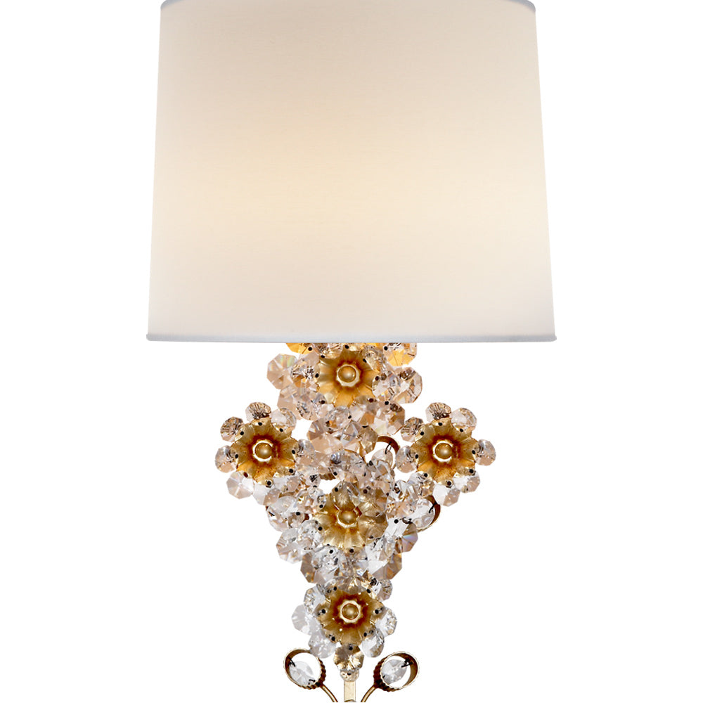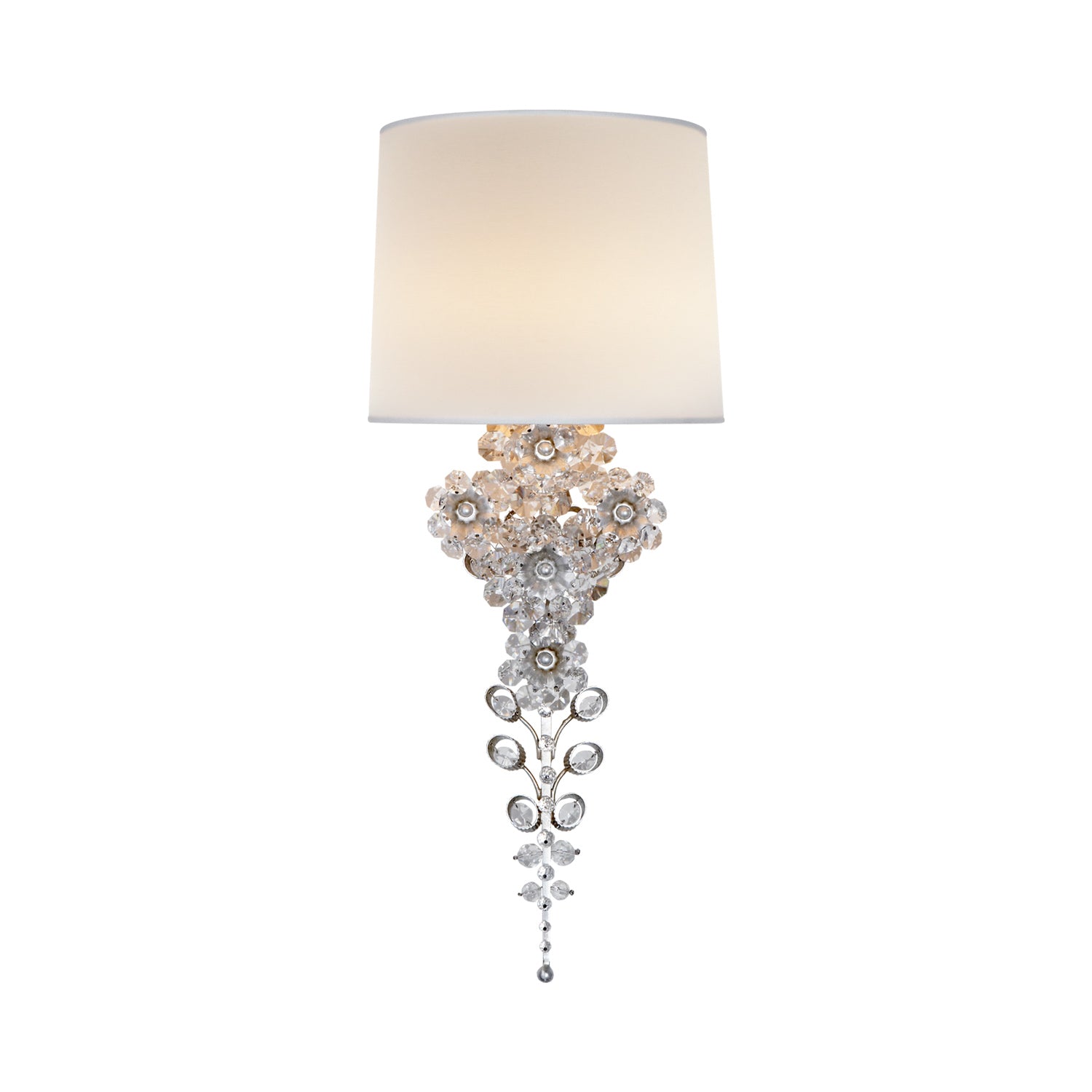 Sparkling botanical patterns offer an expressive vintage flair to the Claret Tail Wall Light from Visual Comfort Signature. Breathtakingly beautiful, this traditional wall light scintillates across the wall with its glittering crystal blooms and metallic petals. A rectangular shield shade covered in a soft linen fabric also emits a soothing glow, refining the luxurious elements.