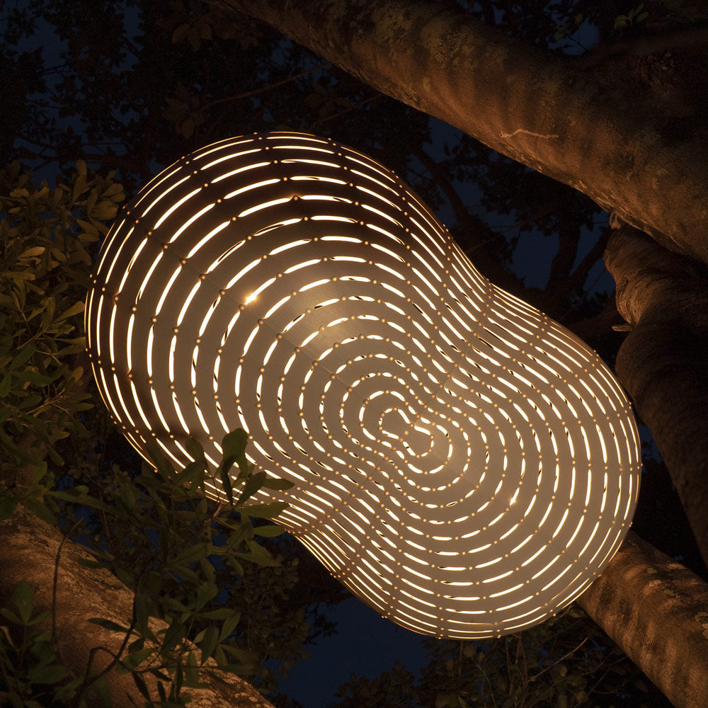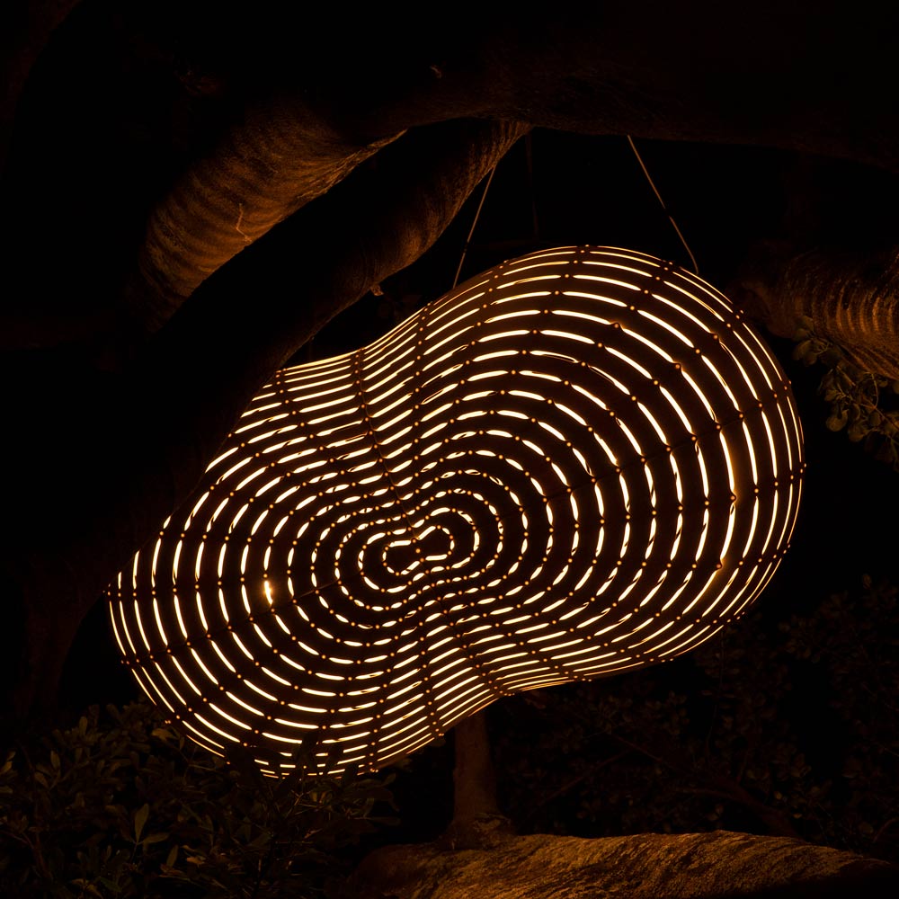An eco-conscious redesign of a classic, the Cloud Pendant Light from David Trubridge is a dynamic choice inspired by the clouds of water vapor that form over islands dotting the vast seas. Organic curves are crafted with slim slices of bamboo veneer, complete with light gaps that create a striking shadow effect when lit.