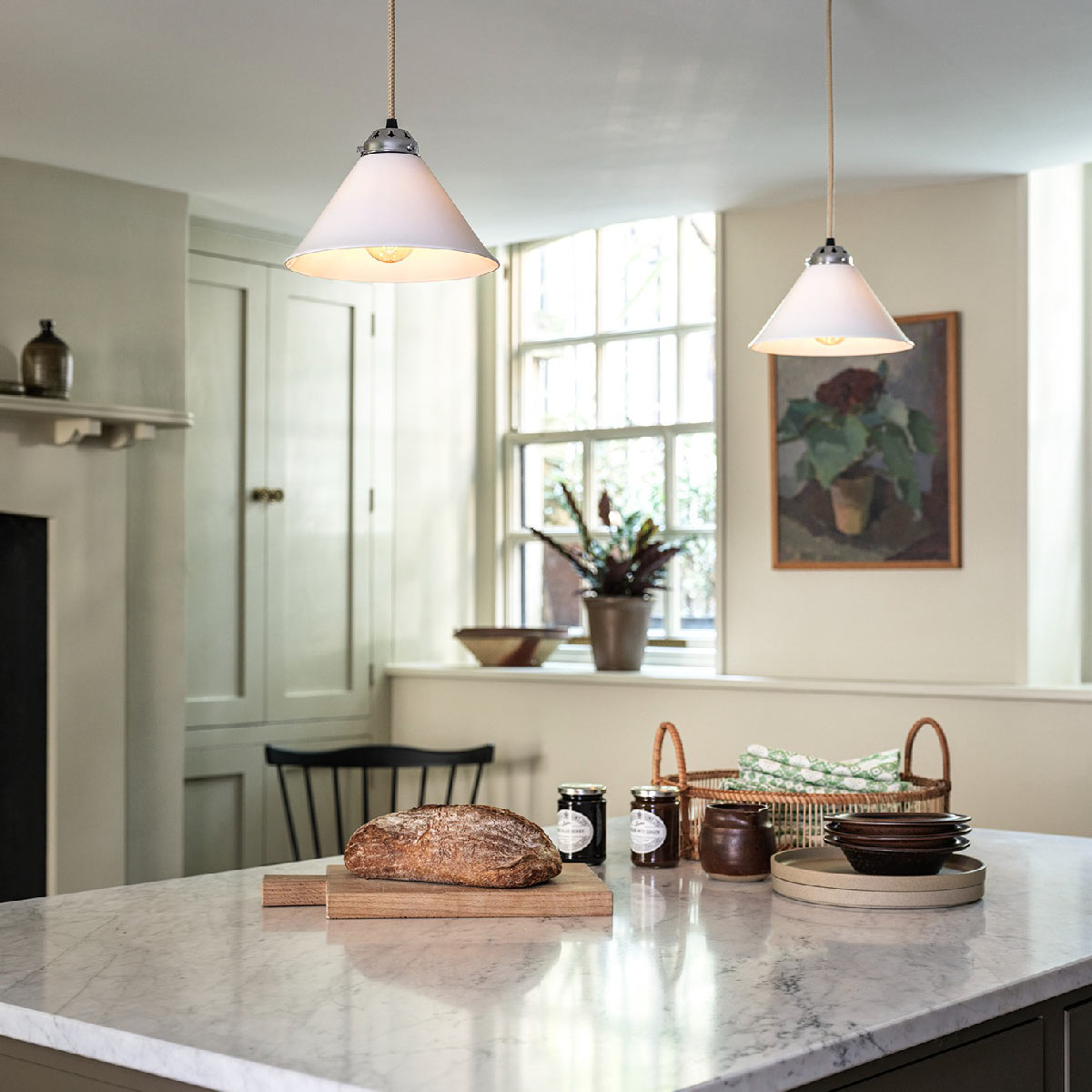 The Cobb Plain Pendant Light from Original BTC sticks to basics in the most charming way, delivering classic modern farmhouse personality. Simple geometric silhouetting follows a glam natural white bone china shade, with rich metal accents and a braided cotton suspension cable becoming part of the style package.