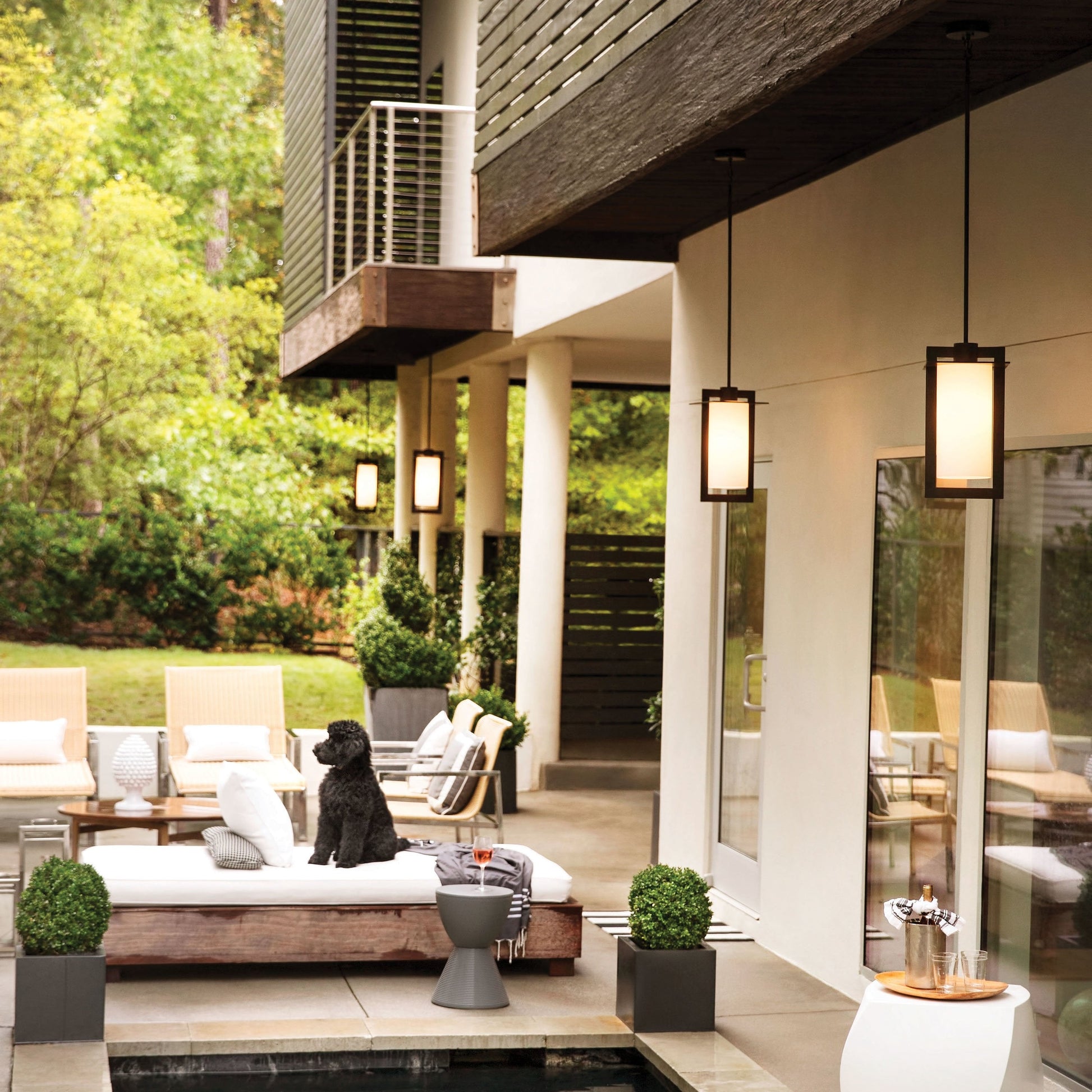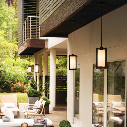 The sleek lines of Colfax Outdoor Pendant Light feature intersecting planes of solid aluminum and a chic cylinder of etched opal glass to create a sophisticated geometric form. The die cast aluminum construction in a Bronze finish brings an Arts & Crafts flair to the transitional design.