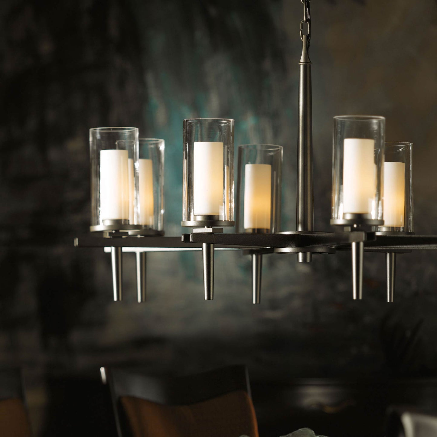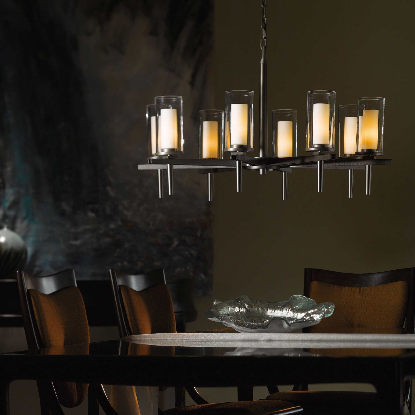 Eight radiating arms capped with two-layer shades decorate the Constellation Chandelier from Hubbardton Forge.