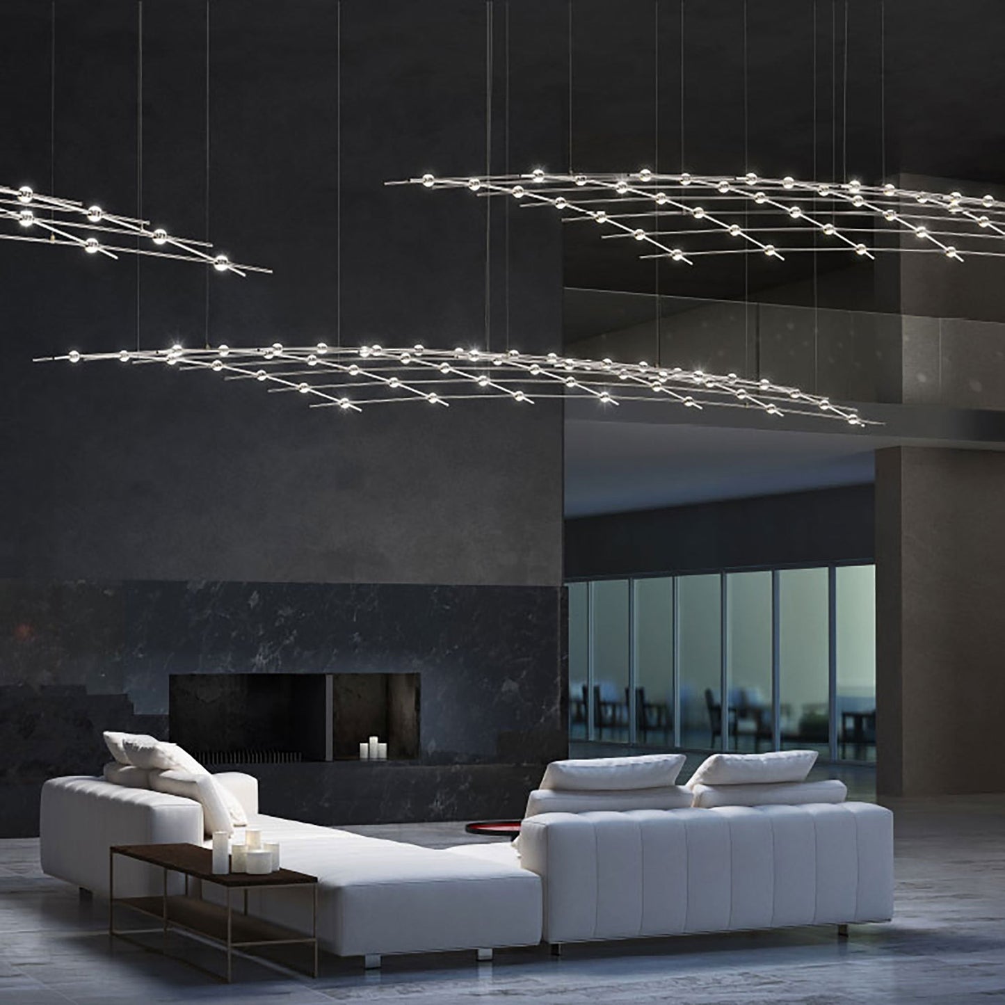Plane geometry adopts a sensual, delicate look as the Constellation® Aquarius Medius LED Pedant Light from Sonneman Lighting plays with astral allure to deliver soft lighting in a modern space.