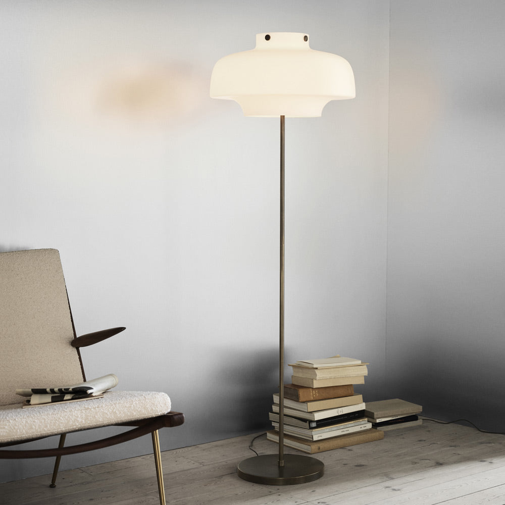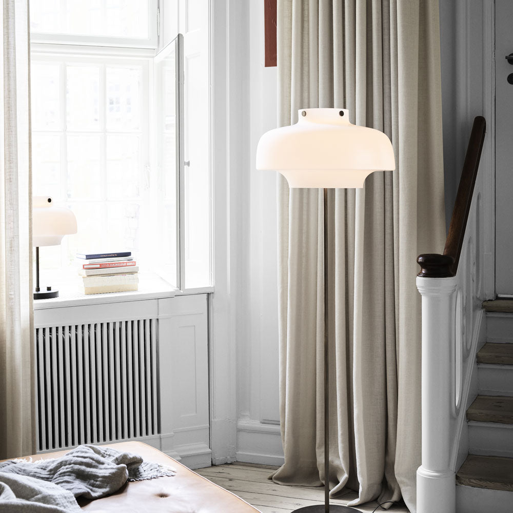 Artisan style repackages a retro flavor to bring an inspired glam look to the Copenhagen SC14 Floor Lamp from &Tradition. Decadence is tempered with simplicity as this stylish lamp highlights a shapely shade fashioned of mouth-blown opal glass, and a coordinating extruded metal frame with a minimalist motif.