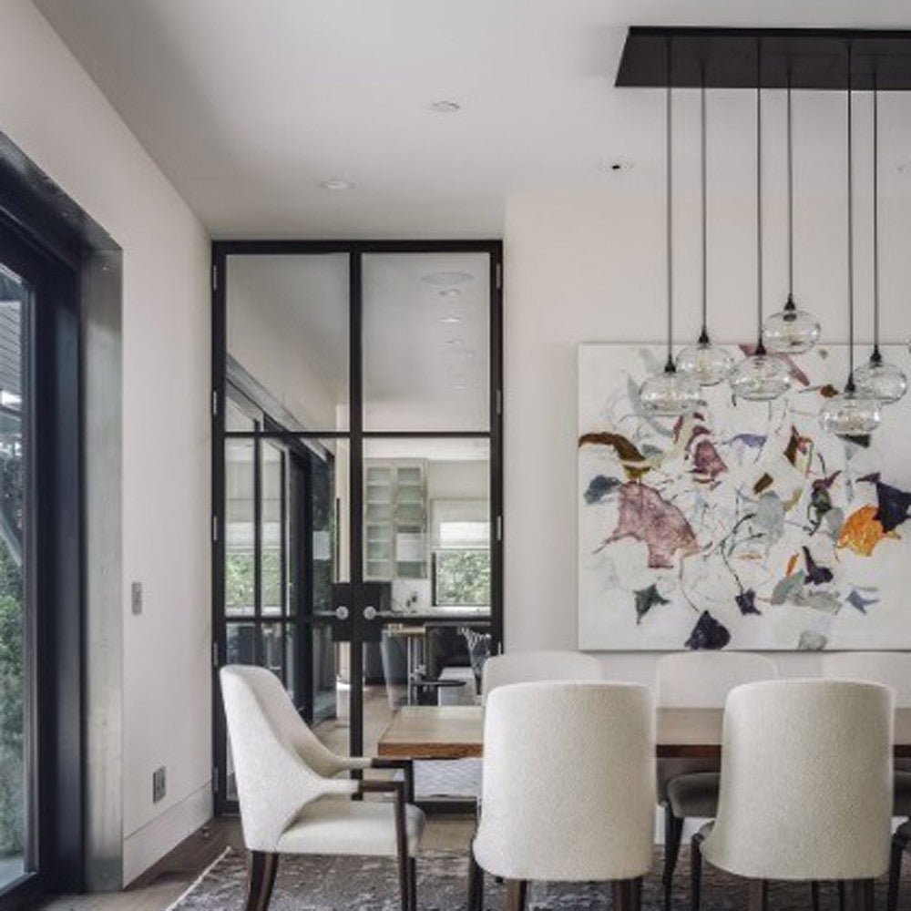 A visually delightful presentation of aligned blown glass shades transforms the Coppa Linear Pendant Light from Hammerton Studio into a work of fine art, ideal for lighting up a custom kitchen island or entertaining space. Choose a custom blend of metallic metal finishes and glass metal finishes to create a complementary look that emulates gallery-inspired art with an orderly silhouette.
