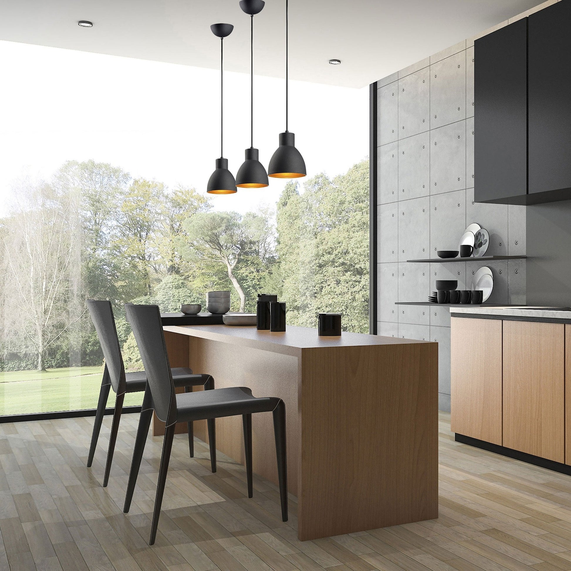 Spun metal shades in various sizes are perfect for budget installations. Available in Black with gold interior and Satin Nickle with white interior, these pendants are very stylish.