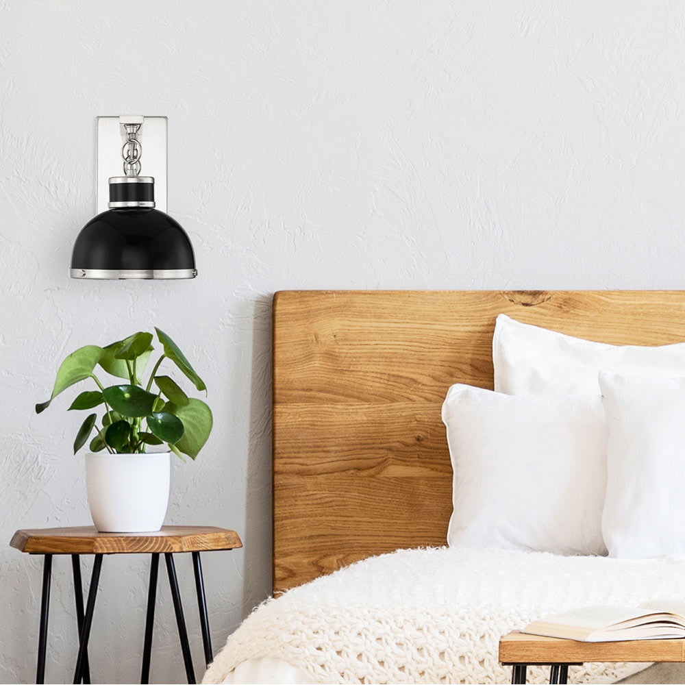 A sophisticated upgrade of industrial design ambiance plays out in the Corning Wall Light from Savoy House. Choose this elegant fixture for its simplicity and visually pleasing dome shade fashioned of metal with banded metal accents. Ambient downlighting is plentiful, and softened through a base diffuser.
