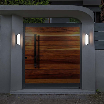 A glowing ambiance and intriguing geometric details highlight the Corte Outdoor LED Wall Light from dweLED.