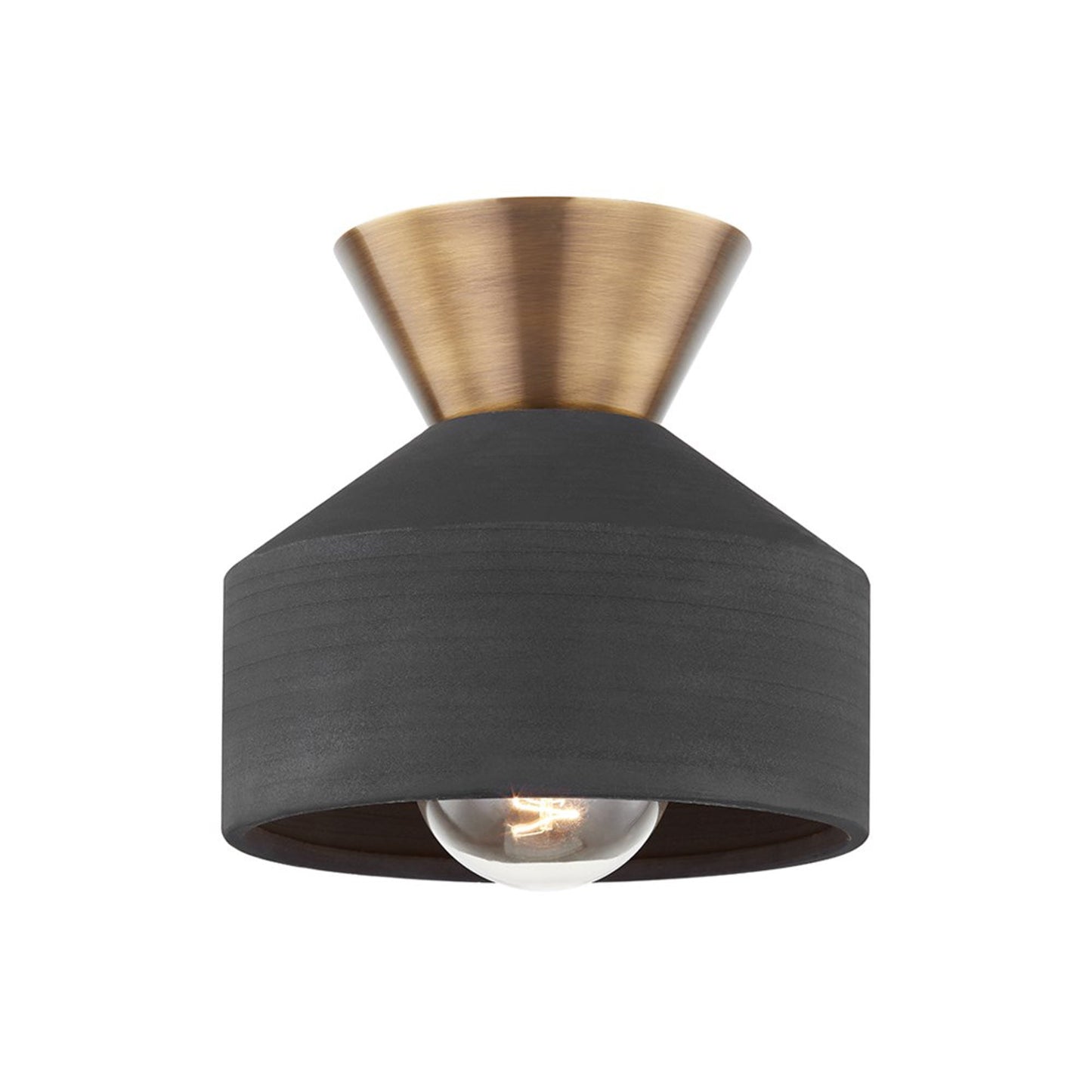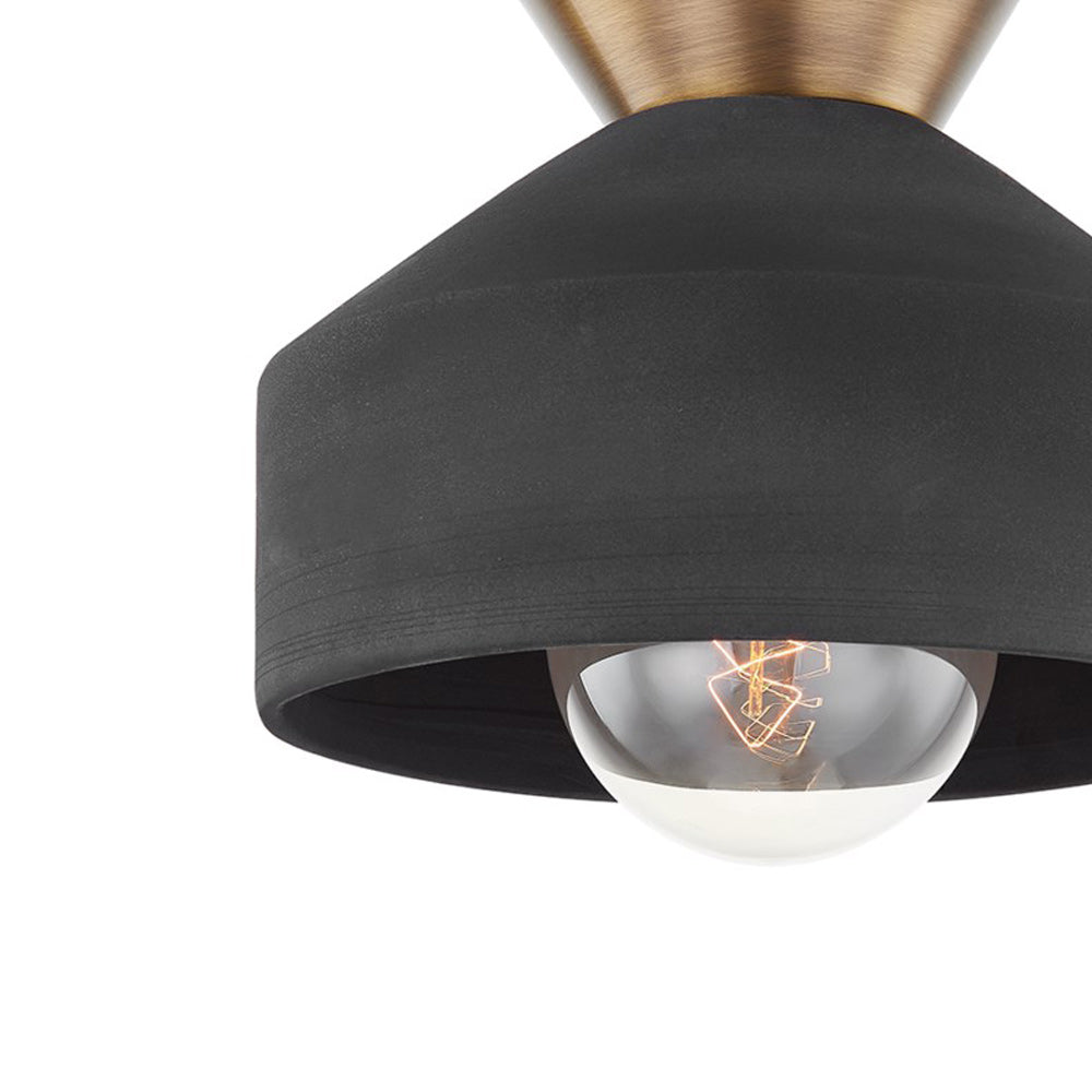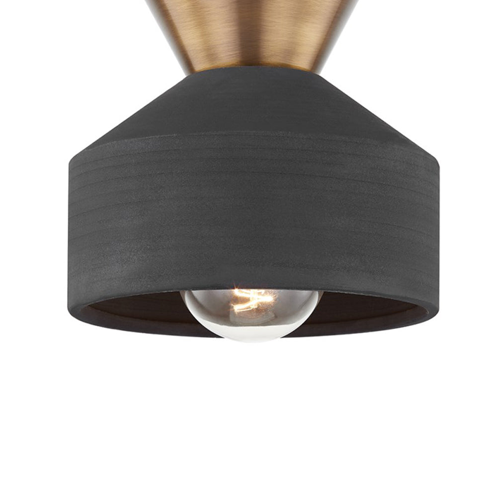 Dramatic design efforts result in a compelling fixture with promise to fulfill signature design requirements. A ceramic black shade begins the crafty composition of the Covina Flush Mount Ceiling Light from Troy Lighting, delivering a juxtaposed silhouette with a conical metal canopy showcasing a rich patina brass finish. The coordinating potential of this decadent ceiling light is matched only by its raw beauty.