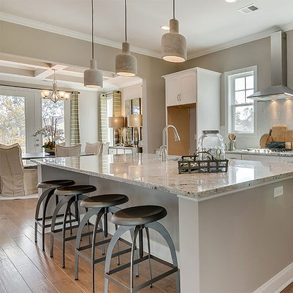 Pendants molded in natural Gray finish concrete cement provide a unique urban contemporary design element Metal Polished Chrome hardware contrasts beautifully with the black fabric covered wire.
