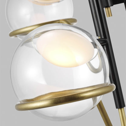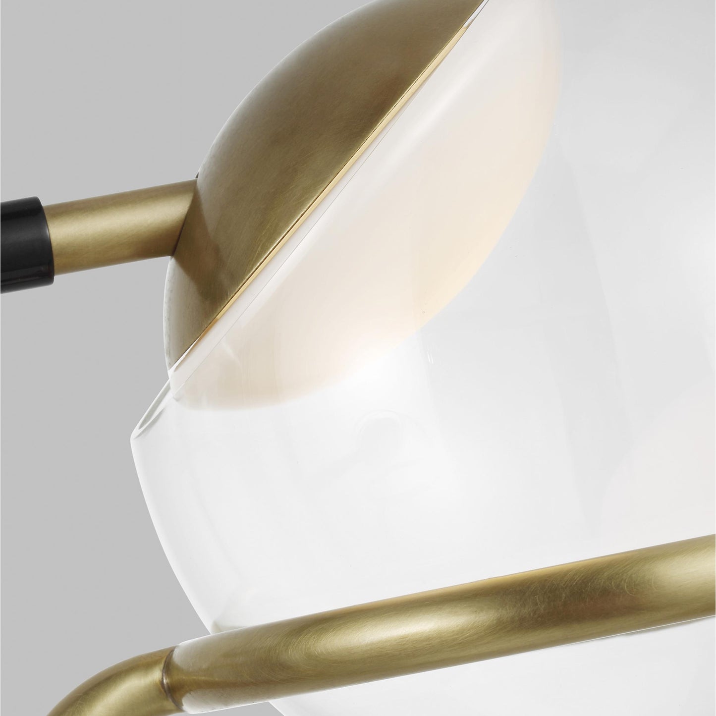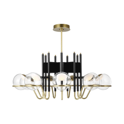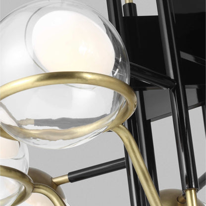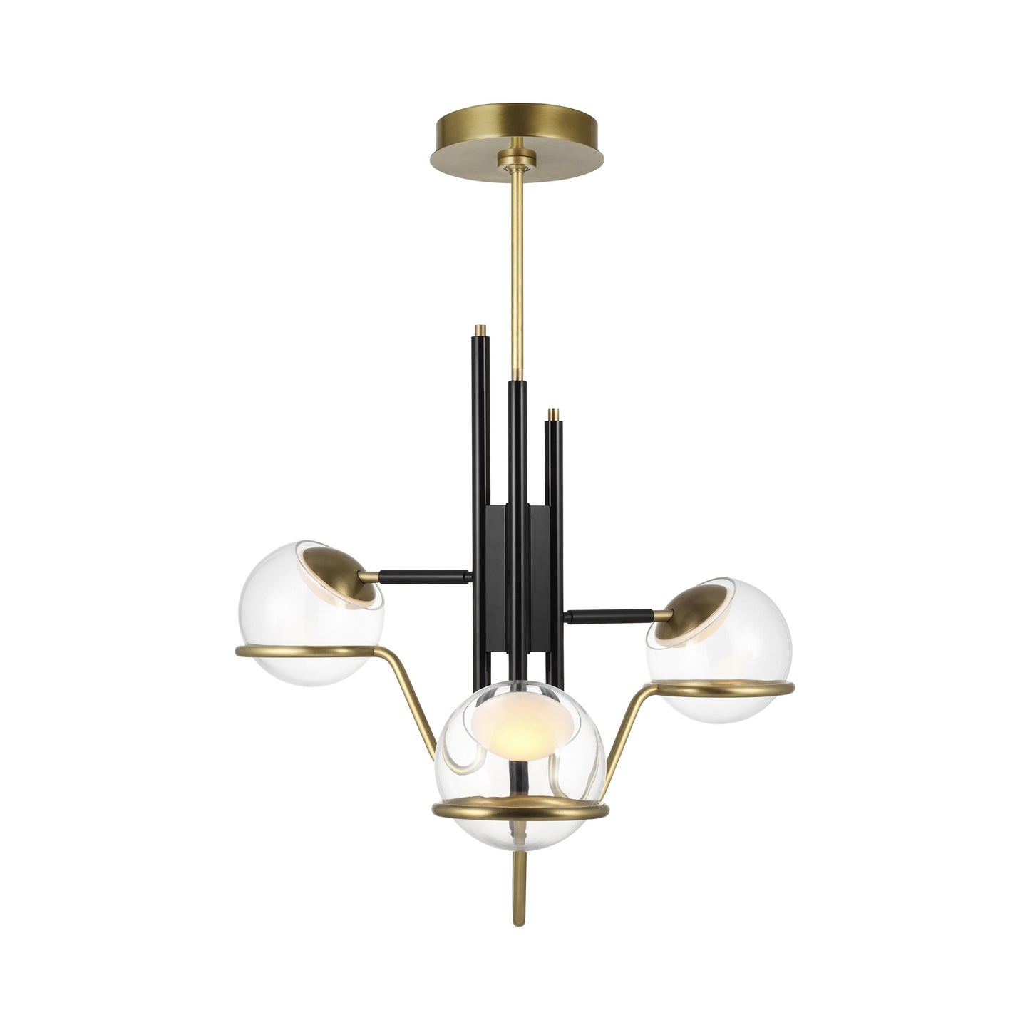 The Crosby LED Chandelier by AvroKO for Visual Comfort Modern blends the radiance of 1970's Italian flair, with a striking yet simple design. Distinctive to its musical delicacy, the glossy black metal armature yields to an elegant brass “harp” holding a glass globe dispersing light fluidly and illuminating any space with perfection.