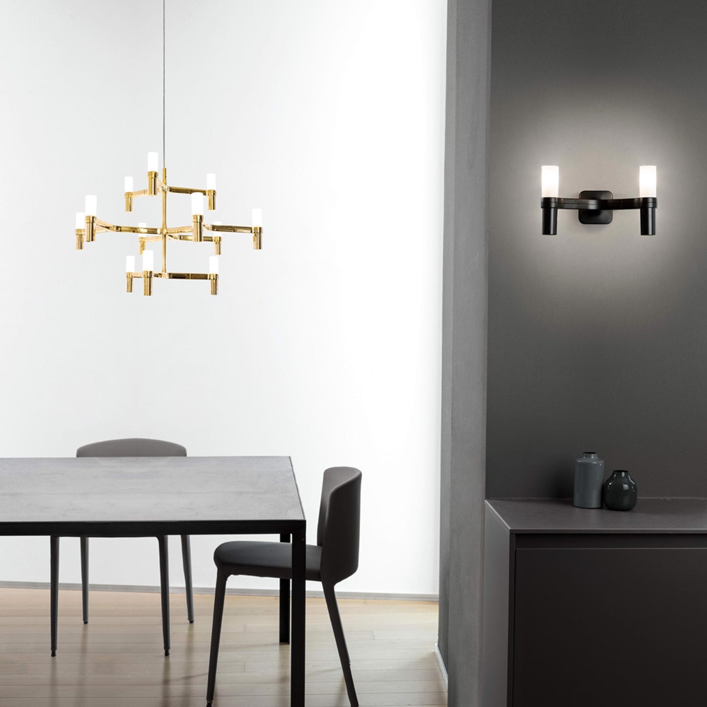 Introduce a modified industrial motif to a modern space with the Crown Minor Pendant Light from NEMO, an exceptional fixture destined to become a stunning focal point. The raw, edgy imagery of piping plays out in stacked rows with extended metal arms holding a collection of shades and bulbs illuminating soft or ambient lighting to live by.