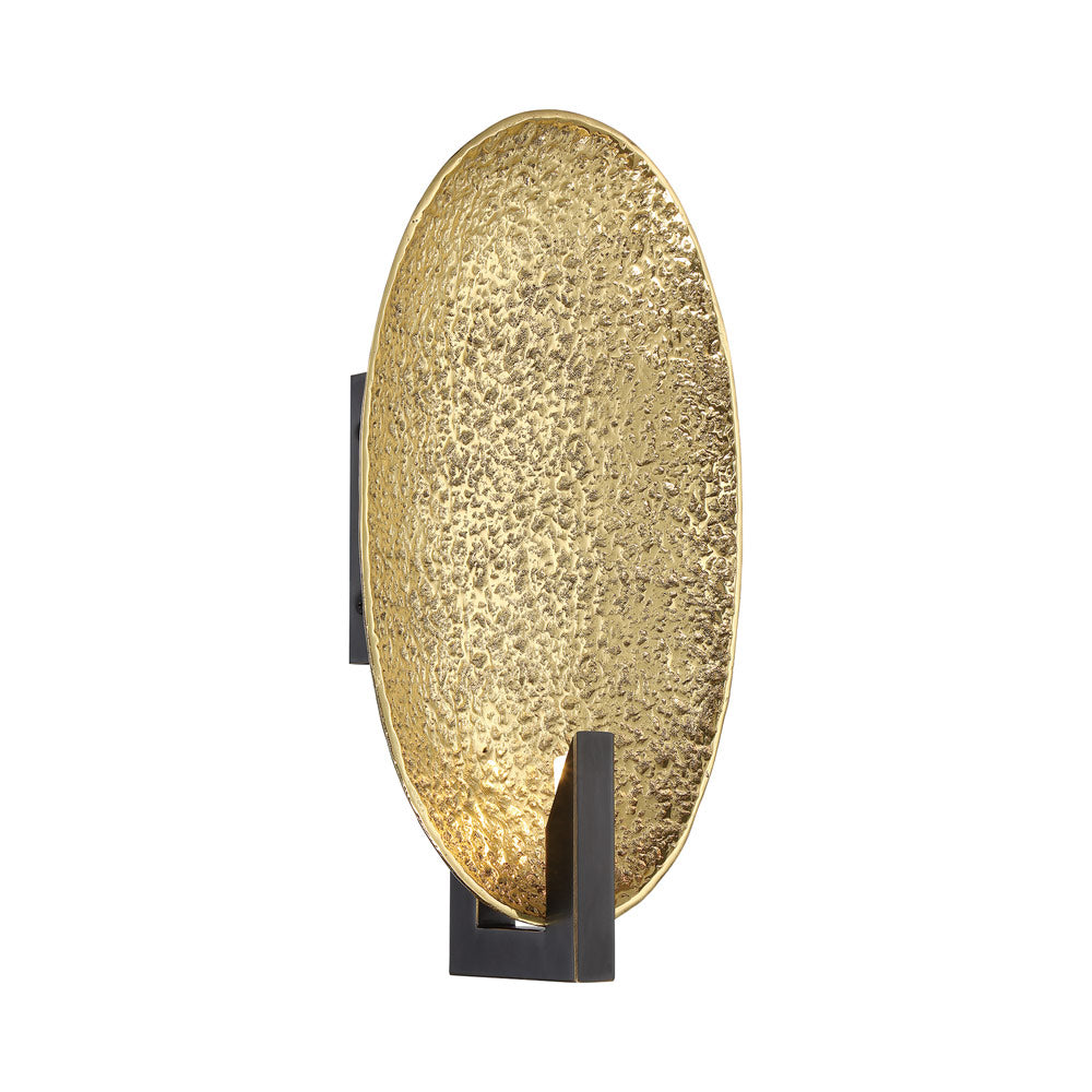 Exquisite texture bounces light in interesting ways for the Daric Wall Light from Metropolitan Lighting. The organic look and feel is created with a shallow oval bowl in polished brass, offering incredible warmth and elegance in a sophisticated living space. A minimalist bracket and wall plate receive a bronze finish that offers contrast that's chic and understated.