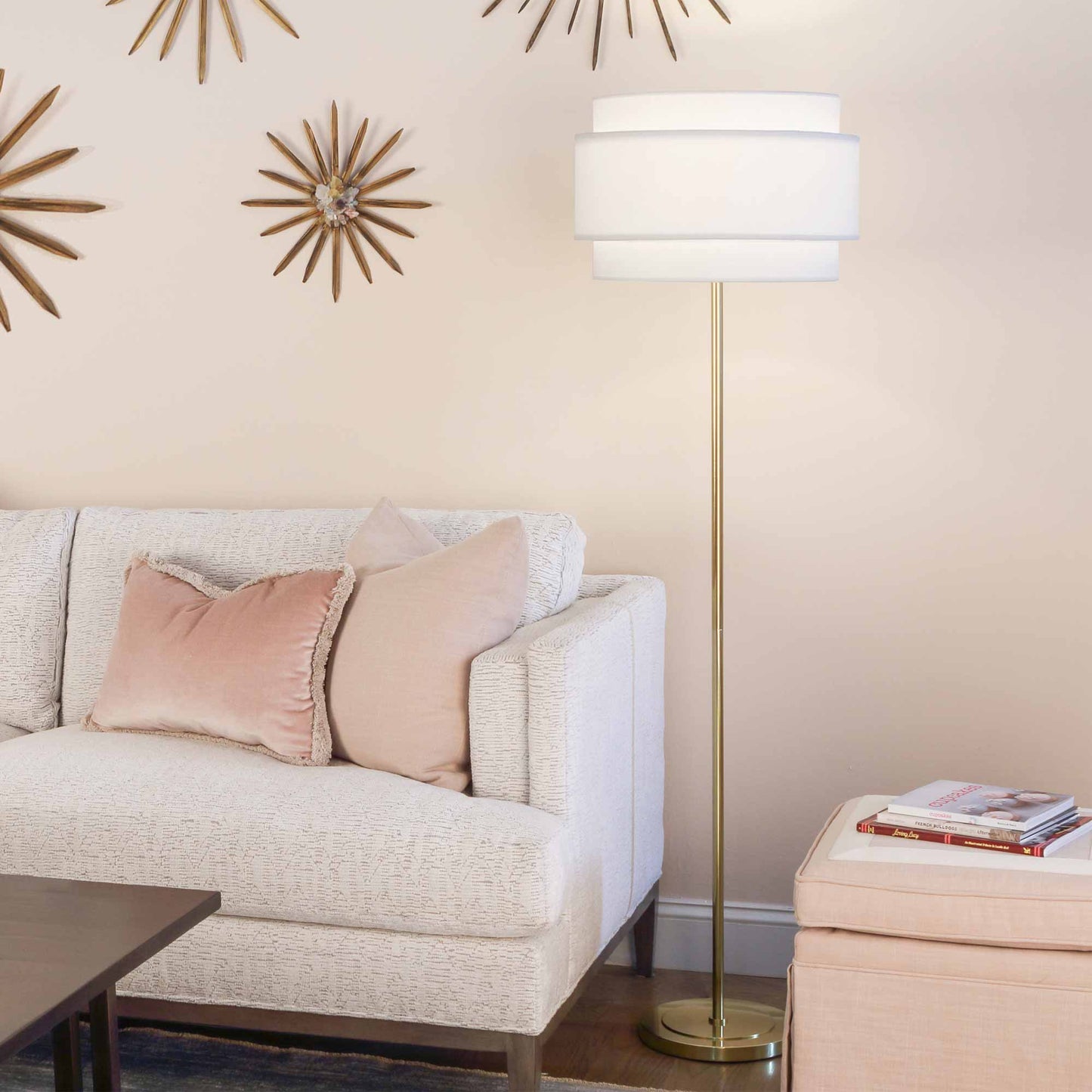 Symmetry and layering add design finesse to the Decker Floor Lamp from Robert Abbey, reflecting on Mid-Century Modern origins and adding ambient lighting perfect for a casual to semi-formal living room or bedroom.