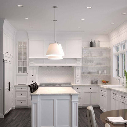 The Devin Pendant from Visual Comfort Modern is an unexpected twist on the classic table lamp silhouette with its clean modern design style. This sophisticated pendant is hand-blown and then finely tailored with either polished nickel or satin gold. A frosted glass shade diffuses the lamping inside. Available lamping options include energy efficient LED or no-lamp, leaving you the option to light this fixture with your preferred lamping. At 5 feet in height this versatile contemporary pendant is a great choice for dining room lighting, living room lighting or family room lighting applications.