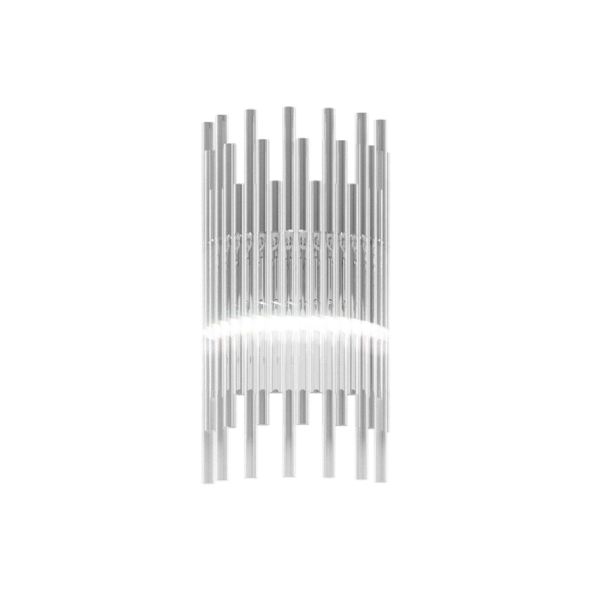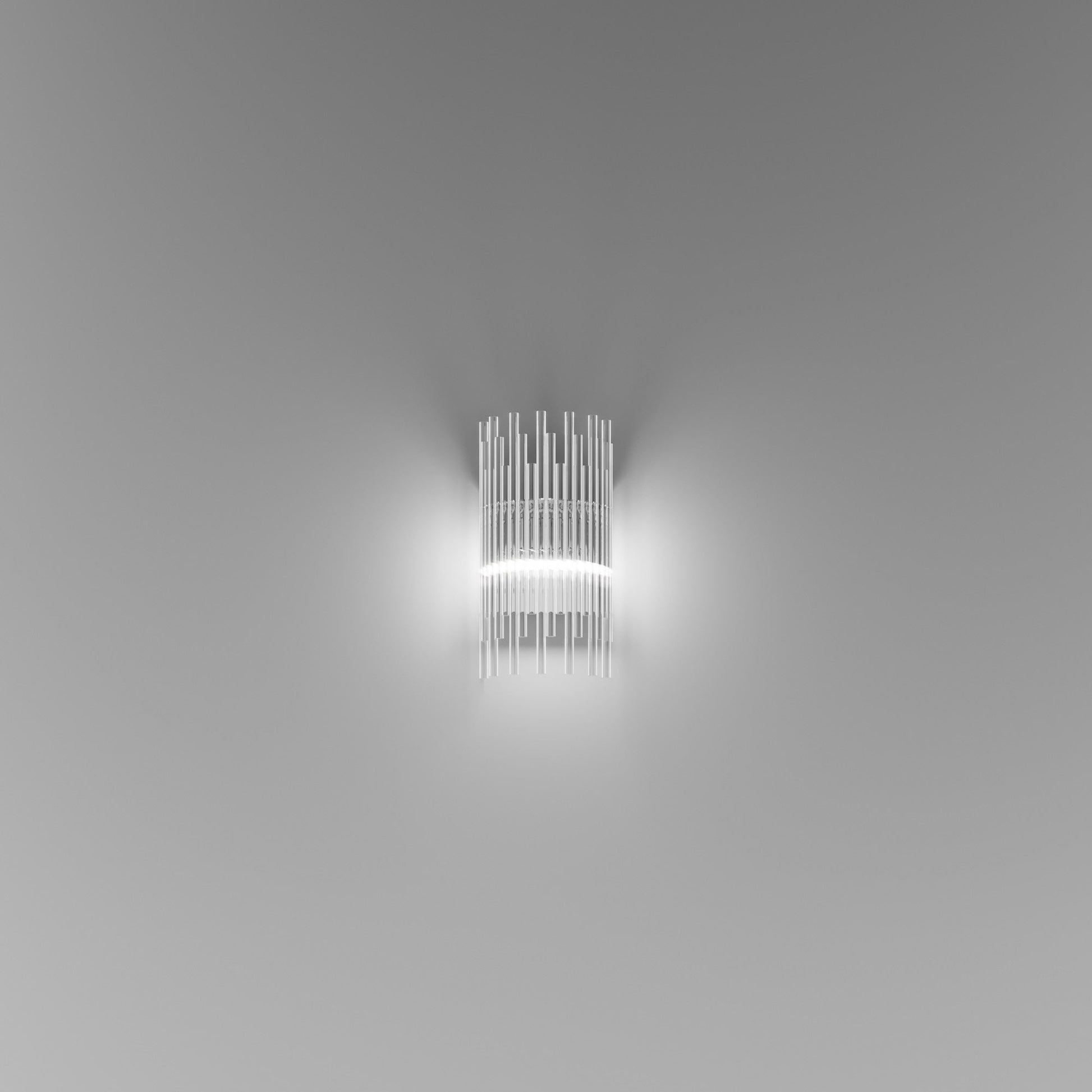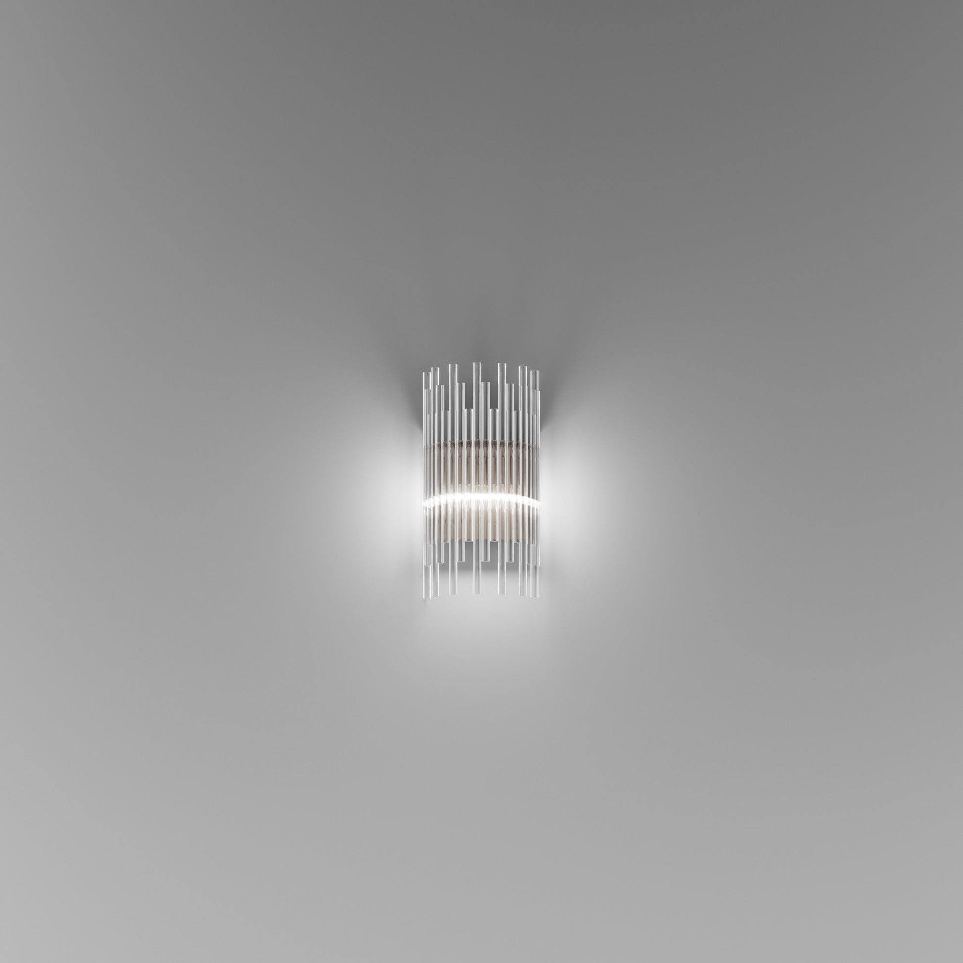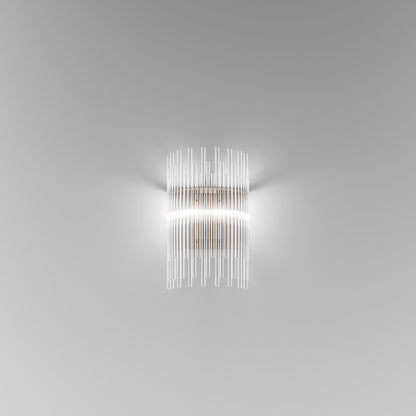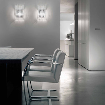 Indulgent glam design creates sheer elegance in lighting. The Diadema Wall Light from Vistosi offers a bit of organic artistry reminiscent of Arctic ice, fashioning graduated strips of clear glass that reflect light with sparkling radiance. This wall light lifts the sophistication level of a modern space with gallery-inspired decadence.