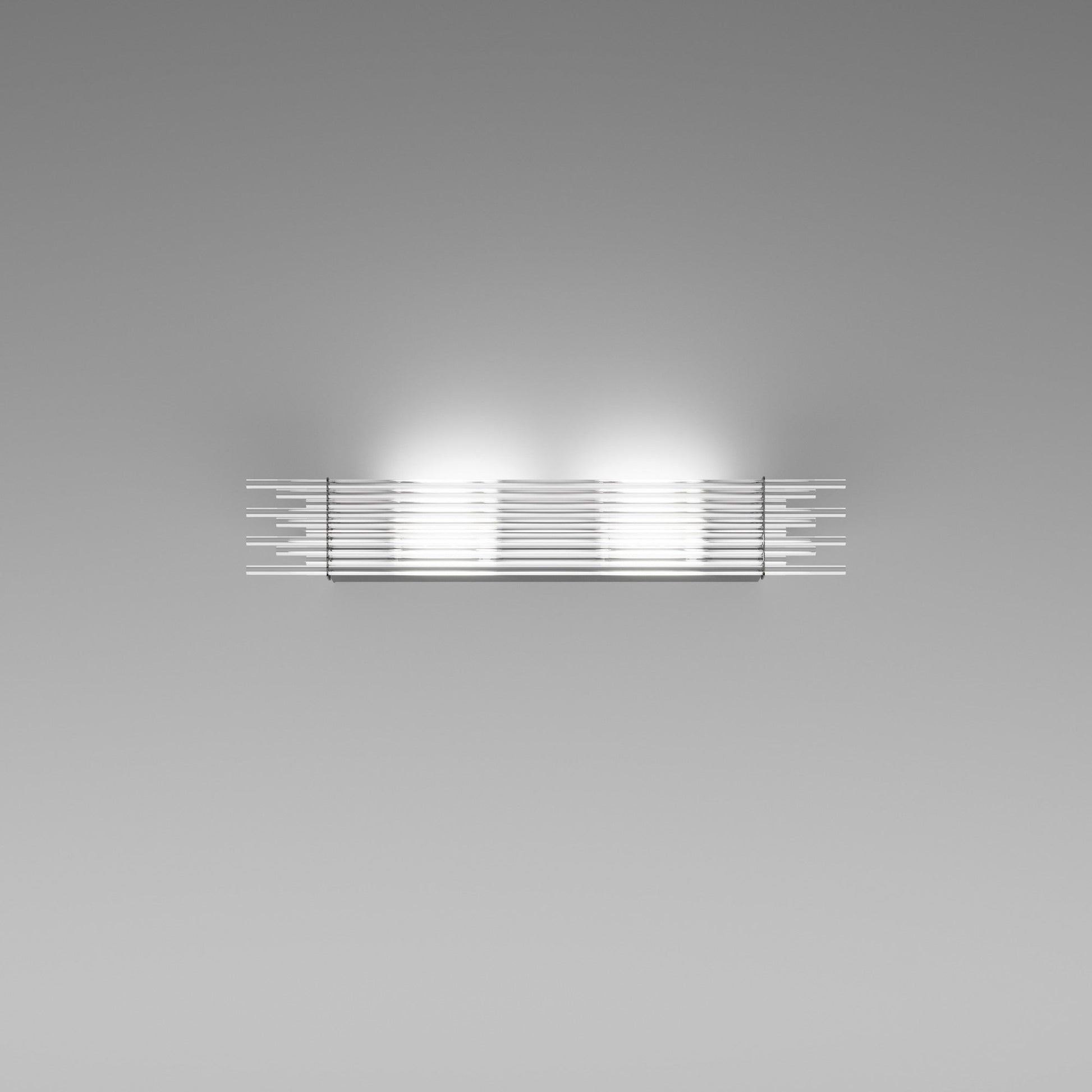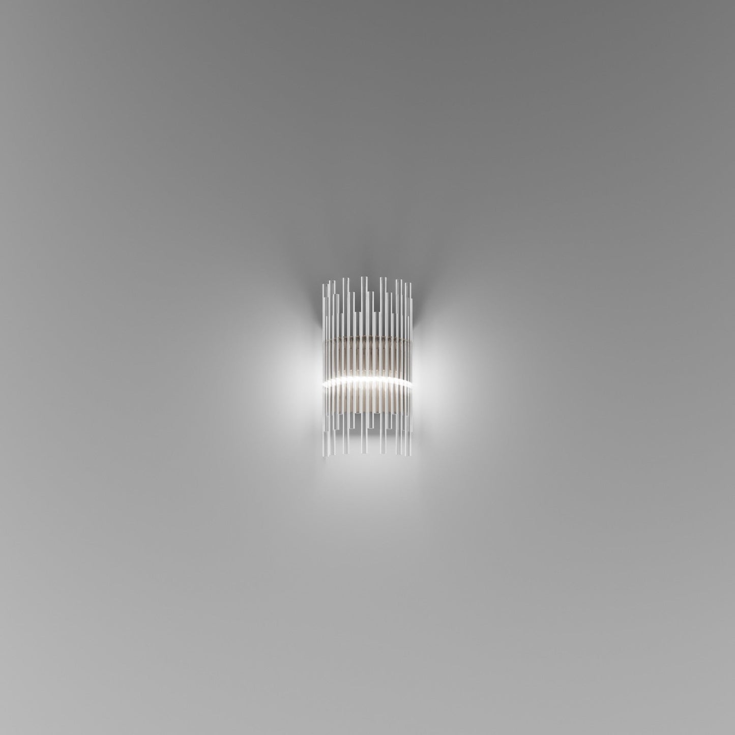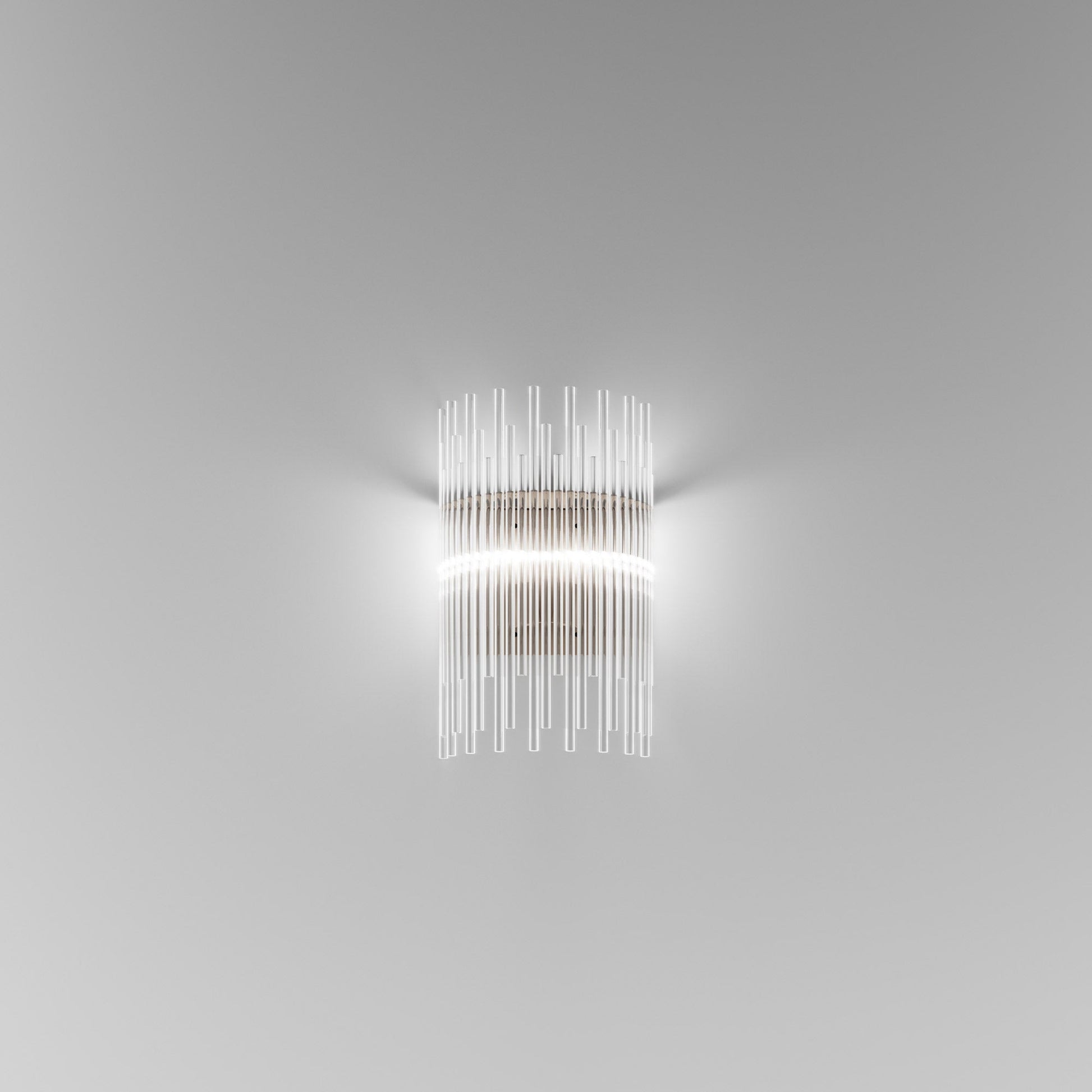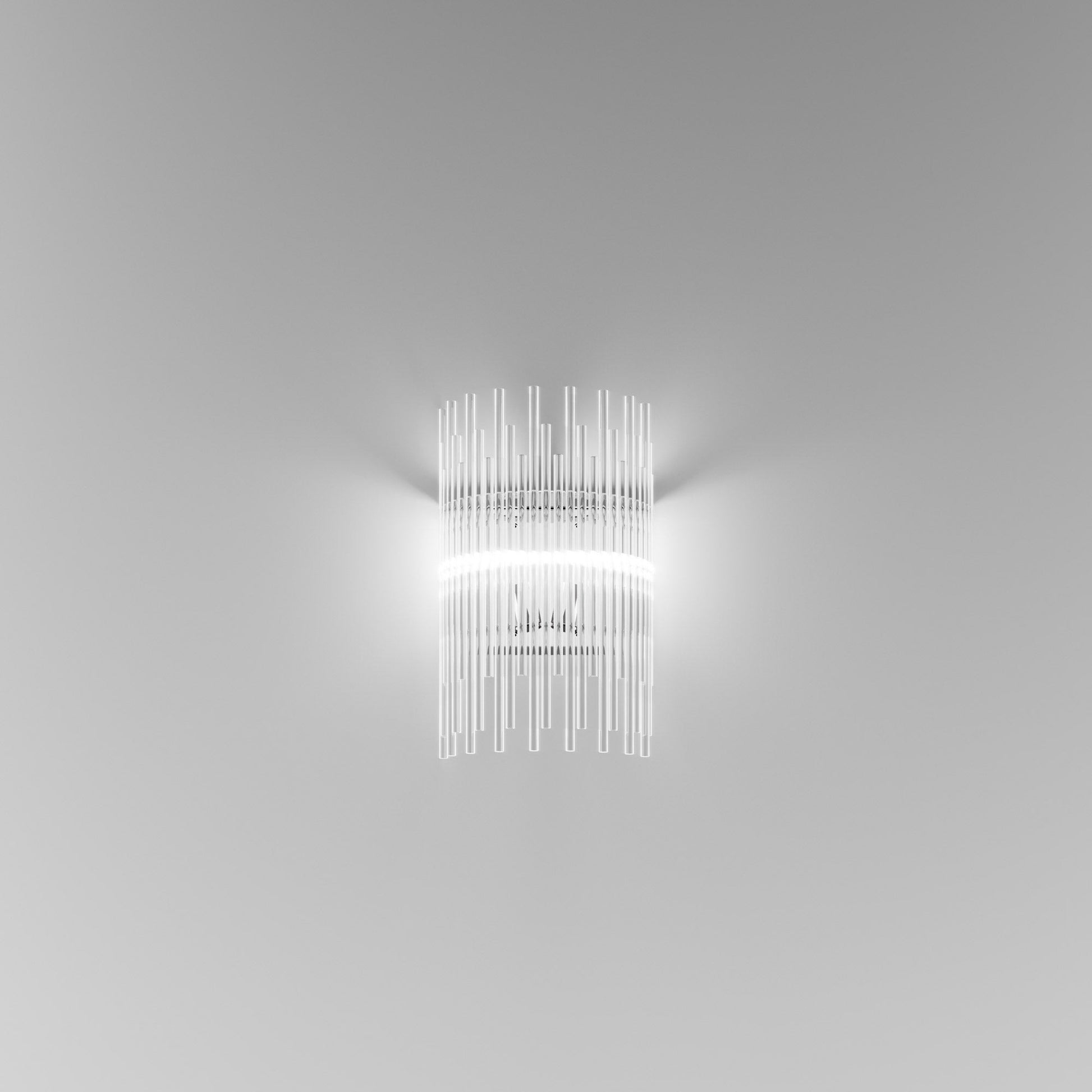 Indulgent glam design creates sheer elegance in lighting. The Diadema Wall Light from Vistosi offers a bit of organic artistry reminiscent of Arctic ice, fashioning graduated strips of clear glass that reflect light with sparkling radiance. This wall light lifts the sophistication level of a modern space with gallery-inspired decadence.