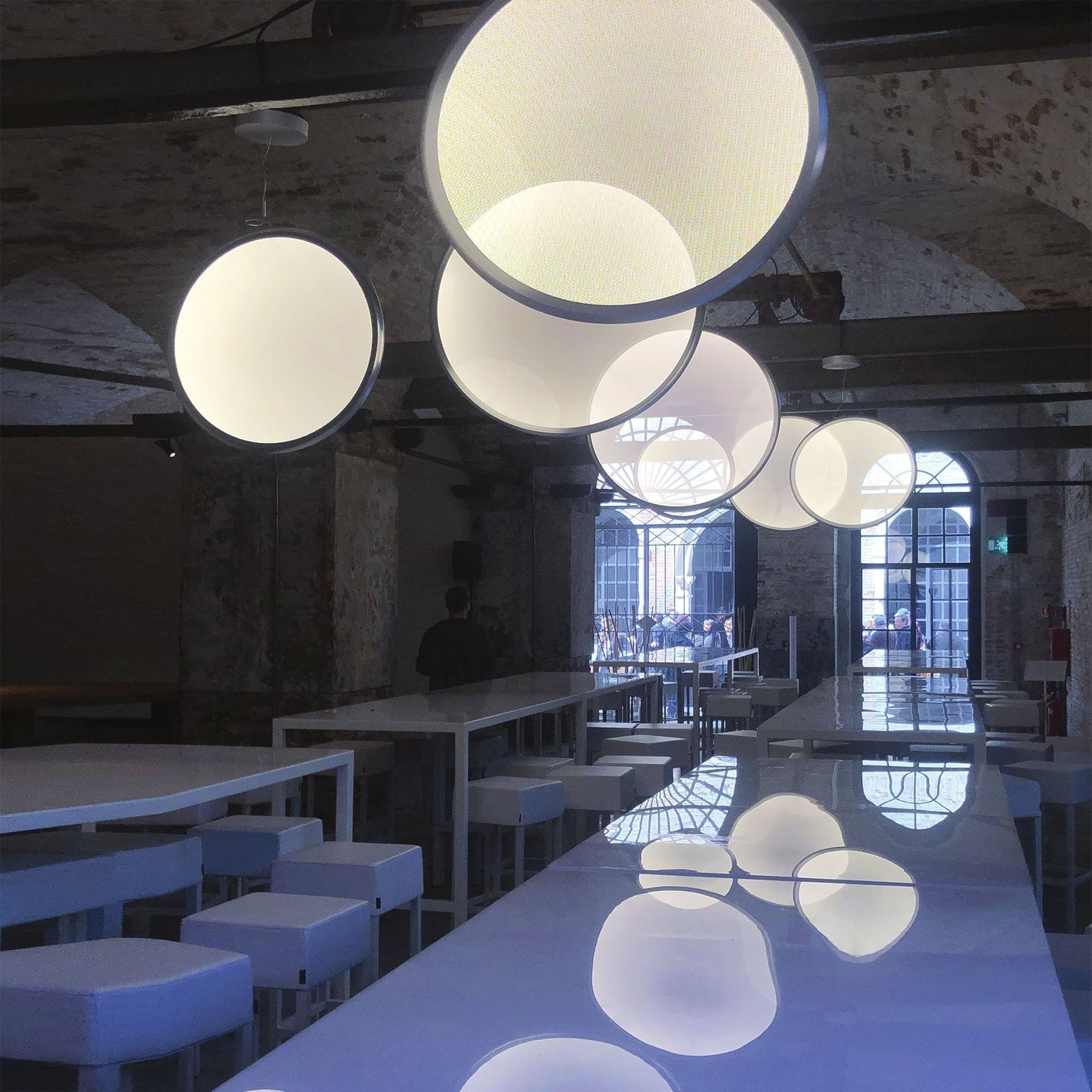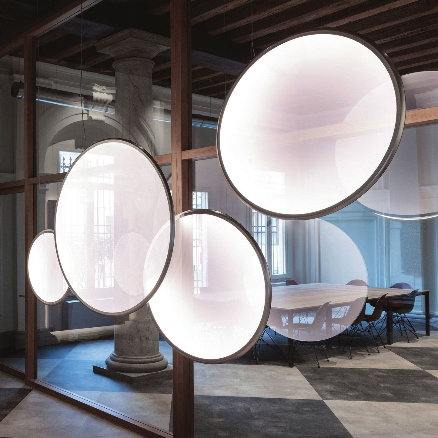 Turn convention on its side with the vertical disc silhouette featured in the lovely, glowing Discovery LED Vertical Suspension Light from Artemide.