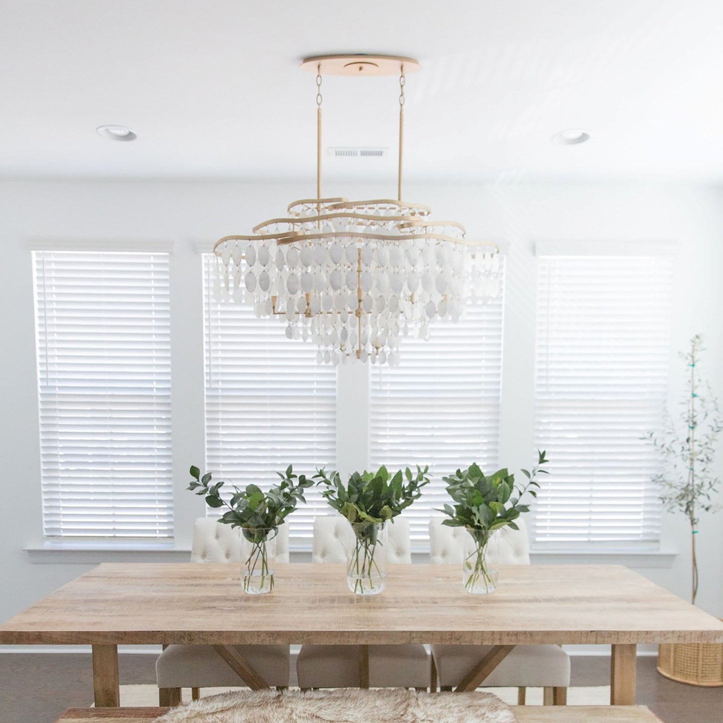 Light up a custom space with the Dolce Linear Pendant Light from Corbett Lighting, adding a glam touch with a champagne leaf finish wavy multi-tier metal frame and dangling capiz shells and crystals that infuse an elegant dose of sophistication.