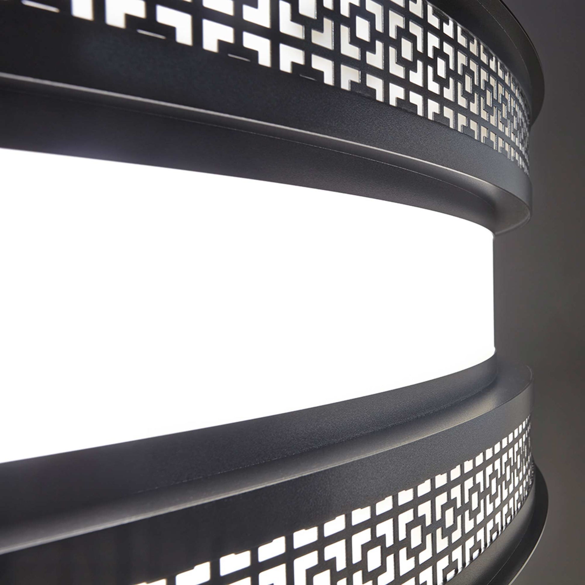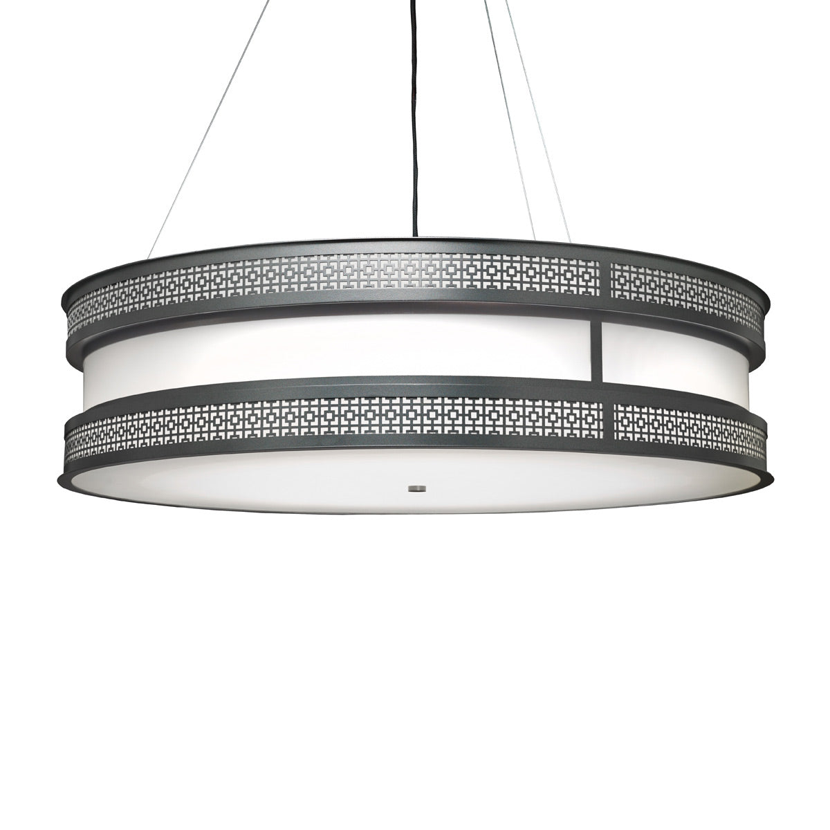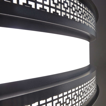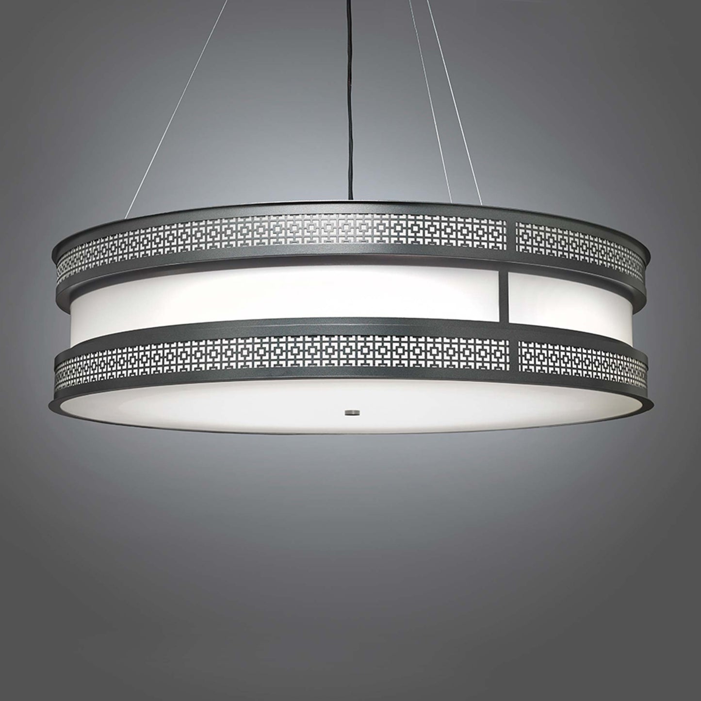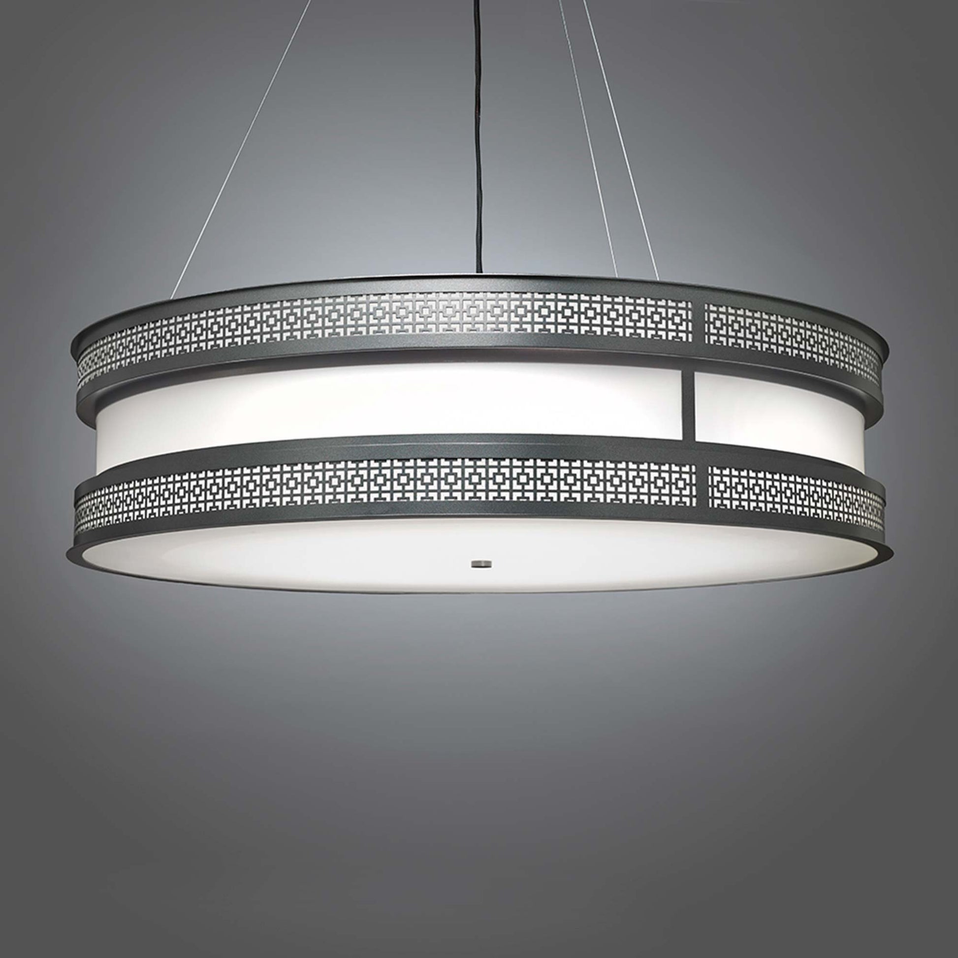 Vintage attitude follows a chic Art Deco theme with circular elegance, creating a powerfully ornate décor element with the Duo Drum LED Pendant Light from UltraLights. Decadence blends a banded metal circular frame showcasing precision-cut patterning at each edge of its delicate drum shade.