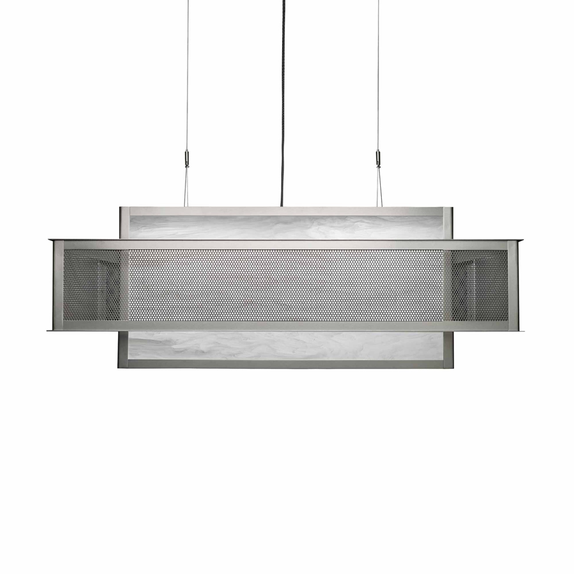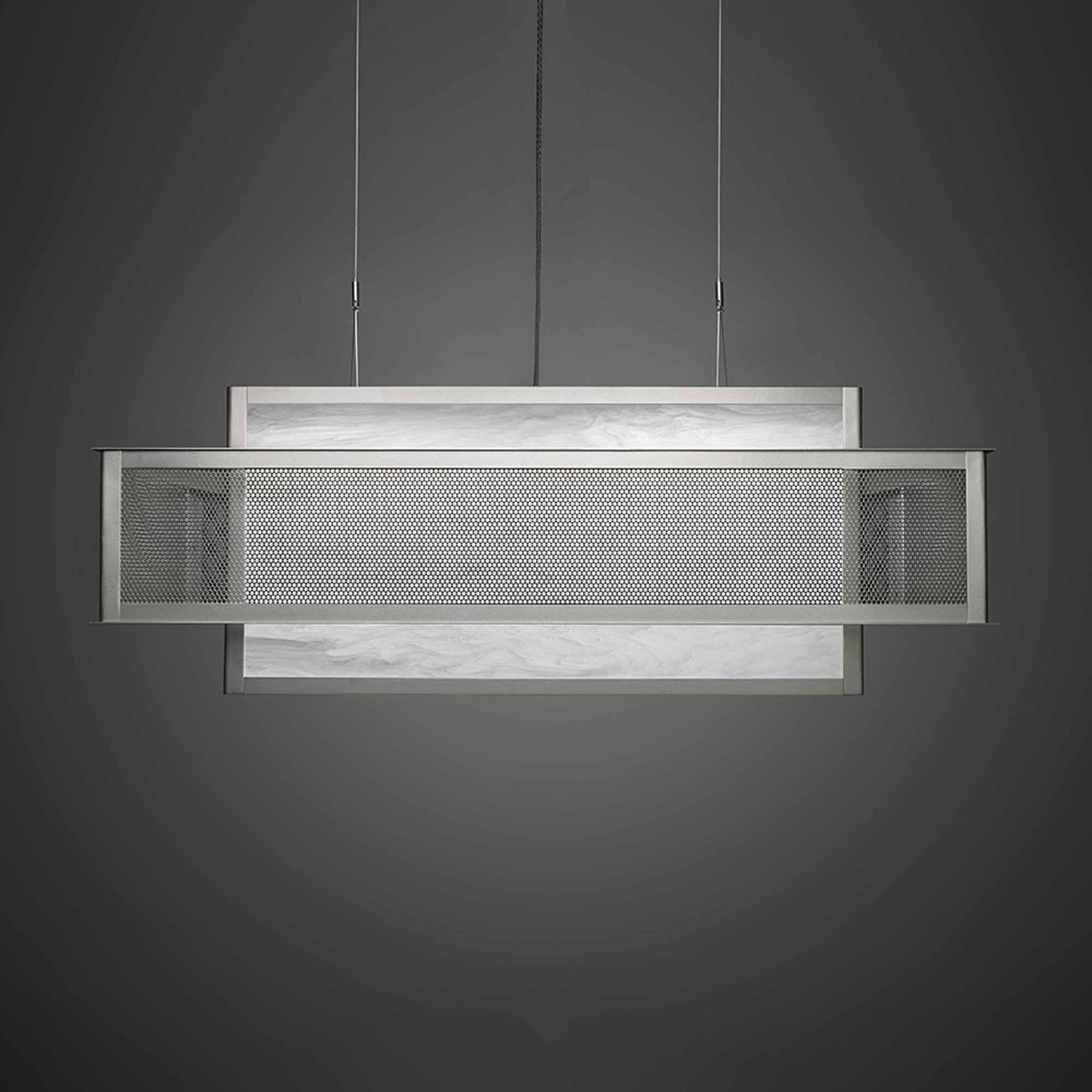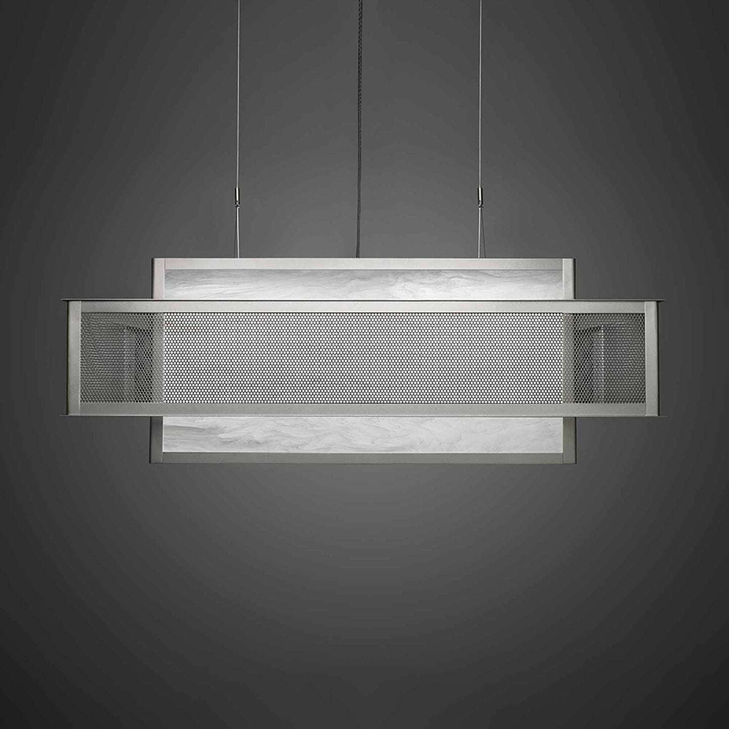 Gritty industrial inspiration adds classic themed energy to a modern space when the Duo LED Linear Pendant Light from UltraLights captures attention in a living or dining space. Artistry adopts a mechanical approach with a layered configuration of a screen over a diffuser, all presented in framed silhouetting of rectangles suspending from slender cables.