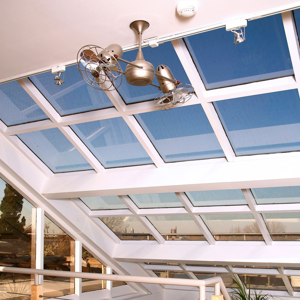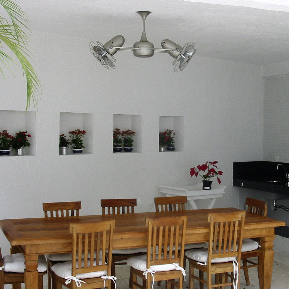 Few designs can match the timeless and sophisticated aesthetic of the Duplo-Dinamico Indoor / Outdoor Ceiling Fan from Matthews Fan Company. Other manufacturers have tried to reproduce this unique design, though all have proven to be of lesser quality and durability. The fan heads can be infinitely positioned in 180-degree arcs for optimum air movement; the greater the angles of the motors to the horizontal support rods (up or down), the faster the axial rotation. A slow, controlled axial rotation is achieved by both fan head position and fan blade speed.