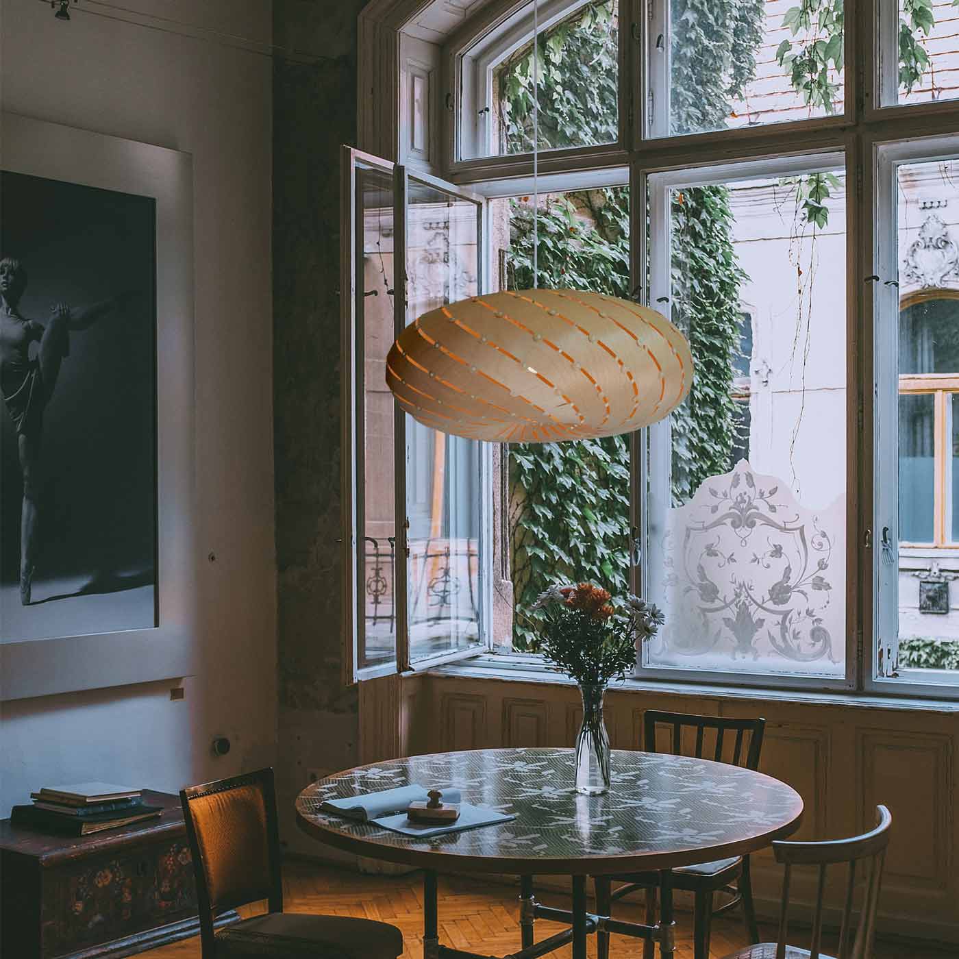 Sustainability and organic elegance are at the forefront in the Ebb Swell Pendant Light from David Trubridge. Instantly eye-catching over an entry or in a breakfast nook, it pairs slender slices of natural birch veneer to create a graceful curvature that imparts accessible sophistication in any room.