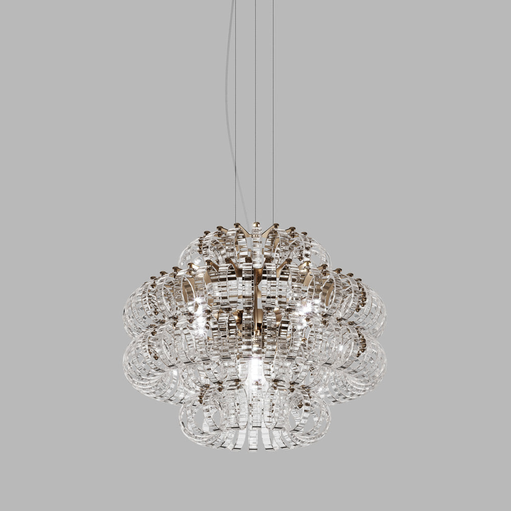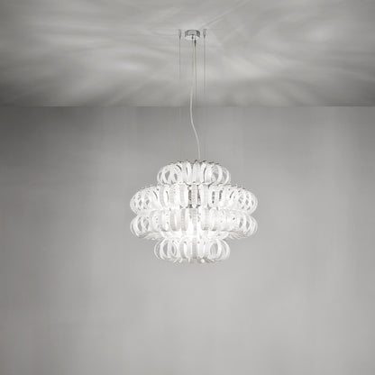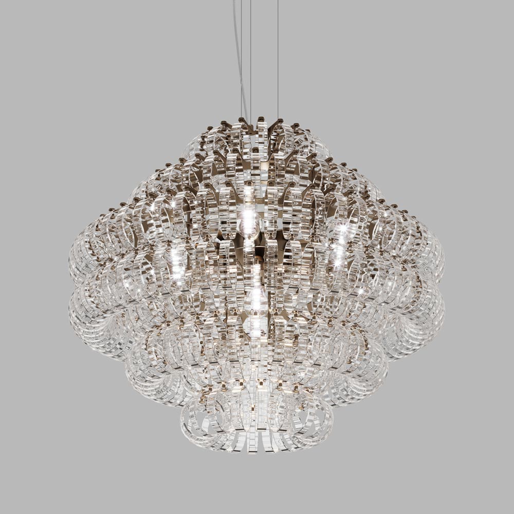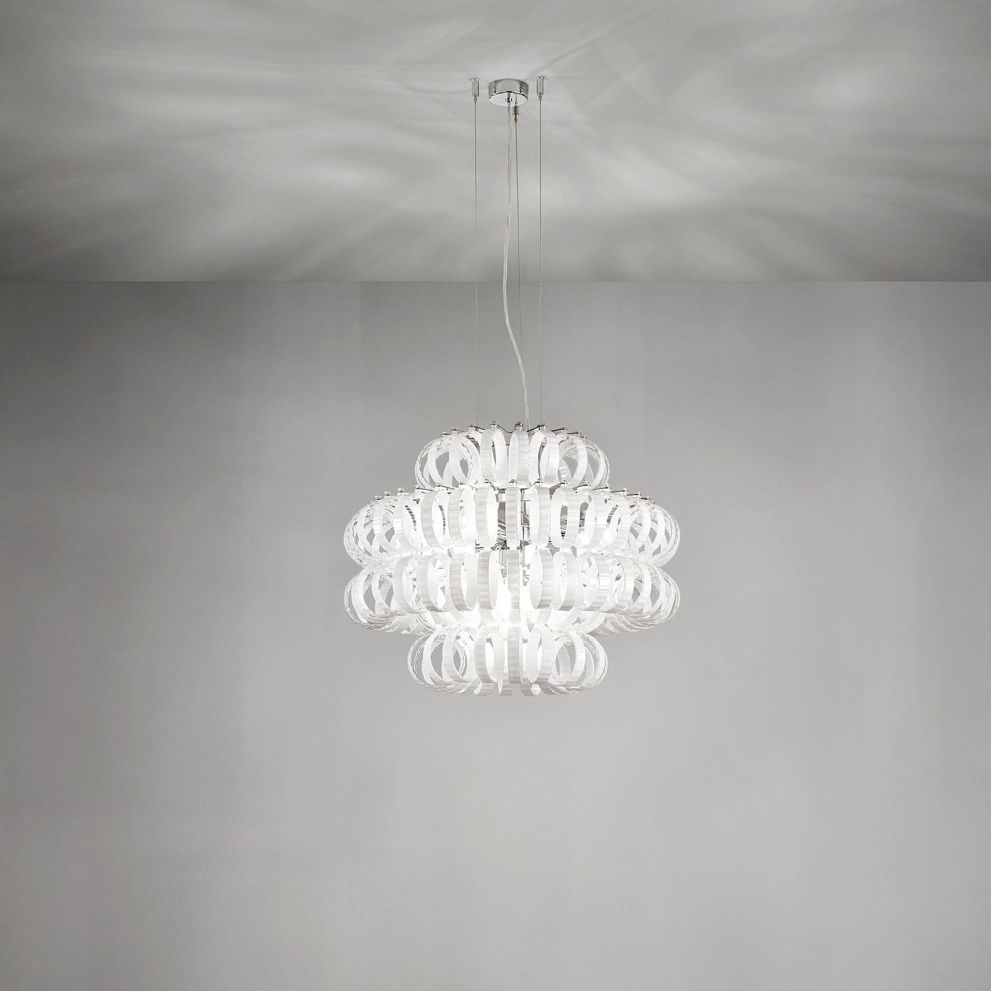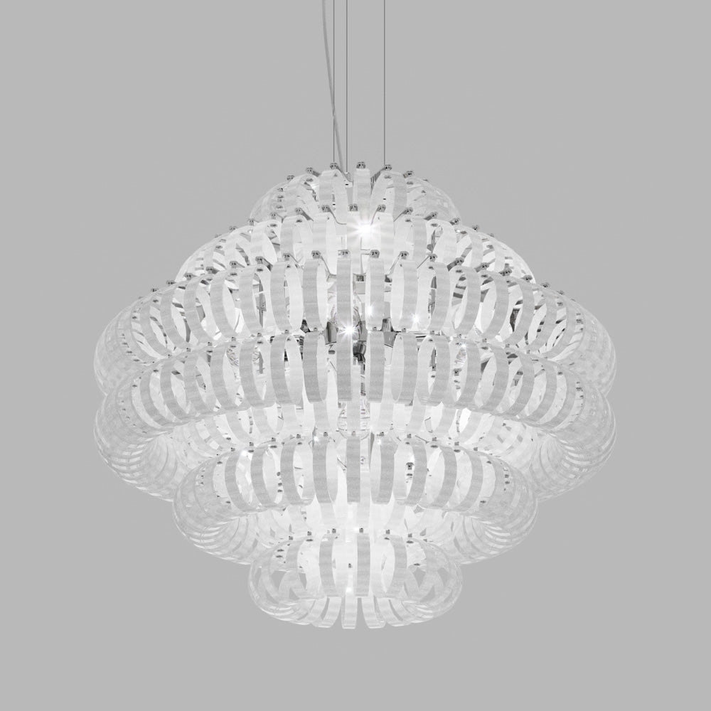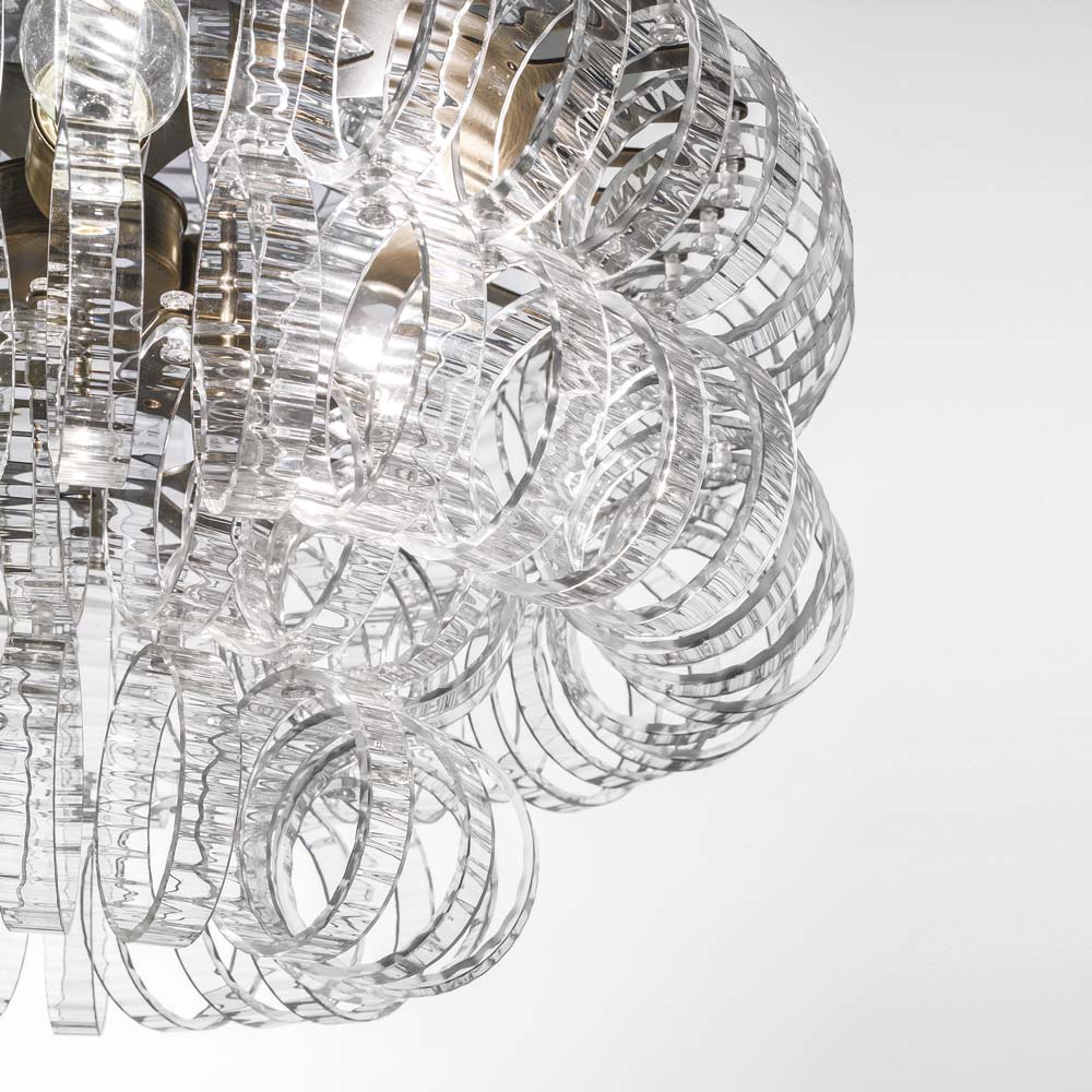 Create an experience of gratuitous glam in a formal space craving gallery-inspired artistry in lighting. Radiant textured glass showcases the Ecos Chandelier from Vistosi, offering a symmetrical display of layers featuring ribbon-like bands created to capture and reflect illumination with the ultimate in elegance.