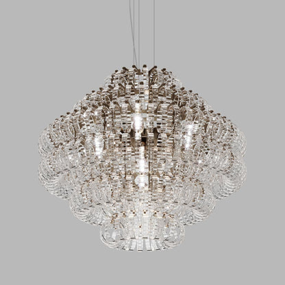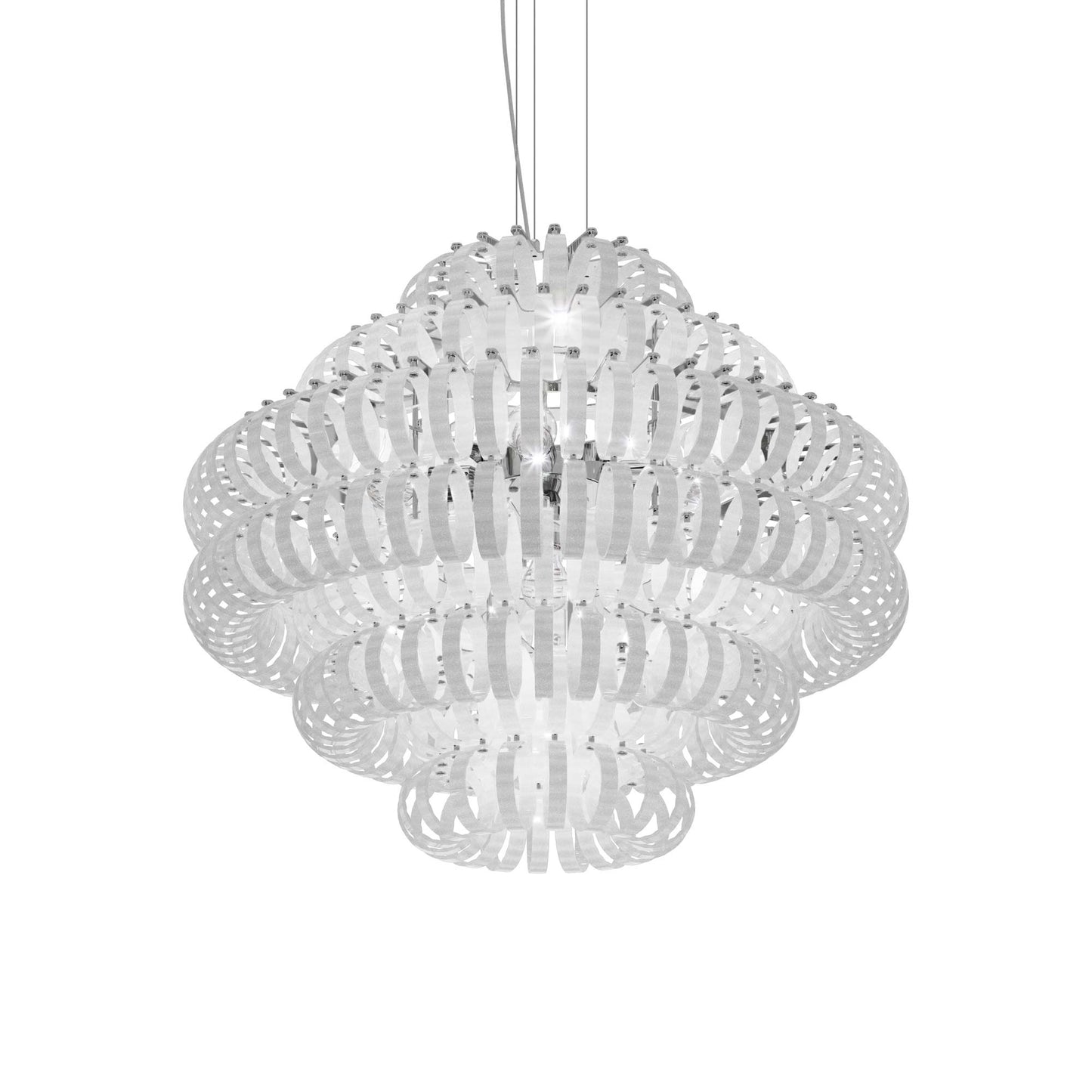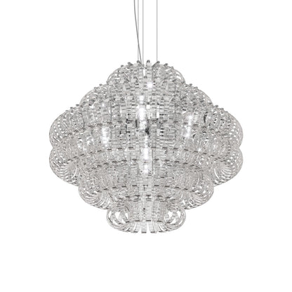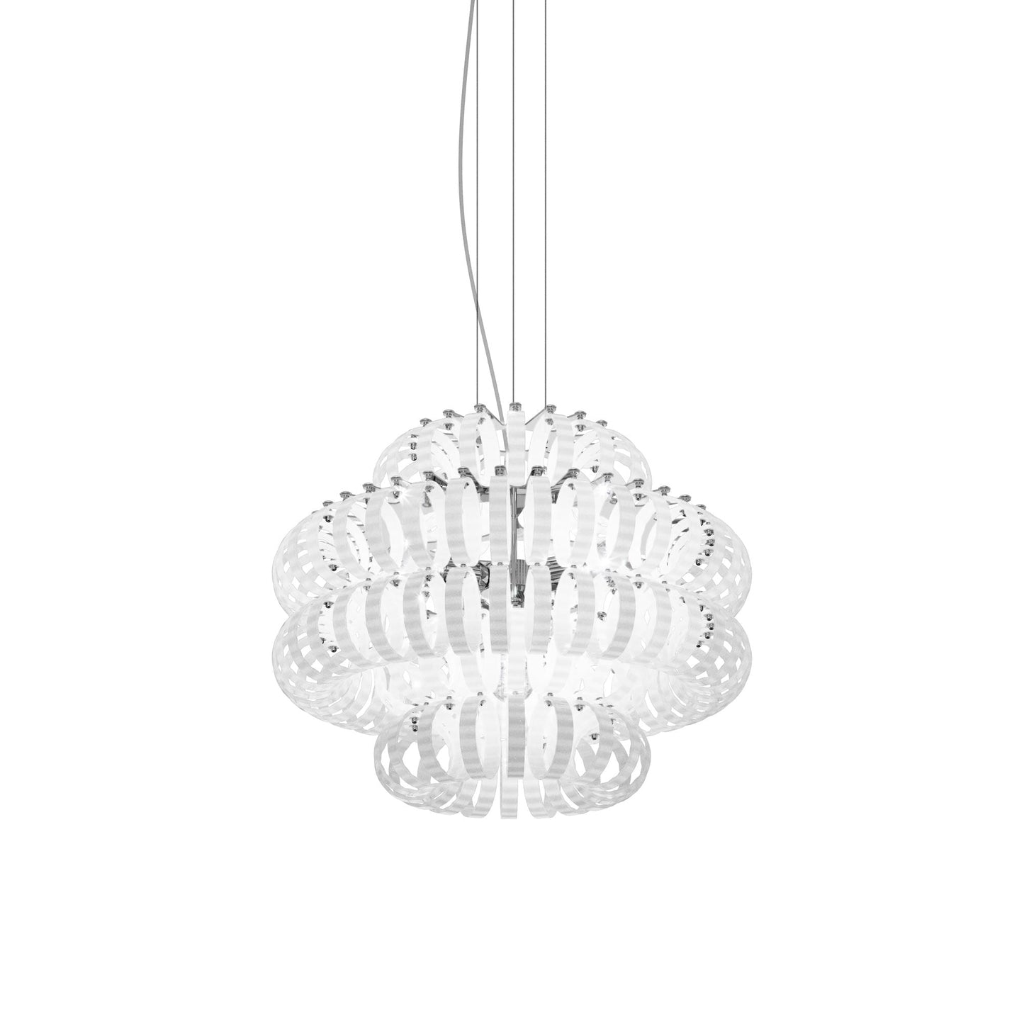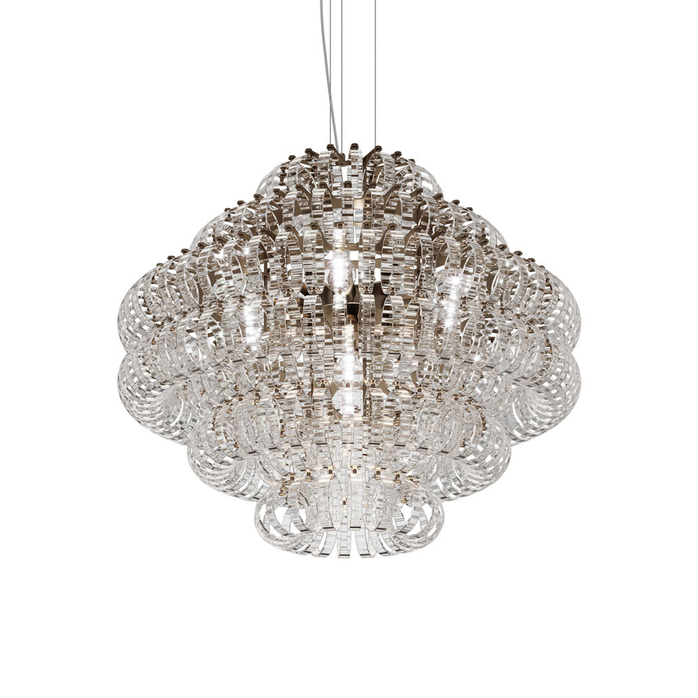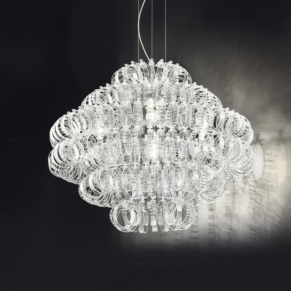 Create an experience of gratuitous glam in a formal space craving gallery-inspired artistry in lighting. Radiant textured glass showcases the Ecos Chandelier from Vistosi, offering a symmetrical display of layers featuring ribbon-like bands created to capture and reflect illumination with the ultimate in elegance.