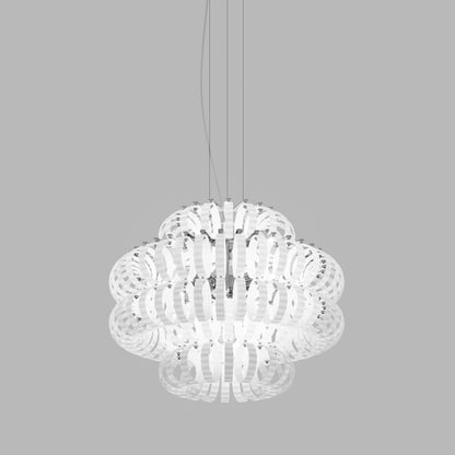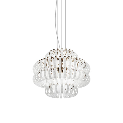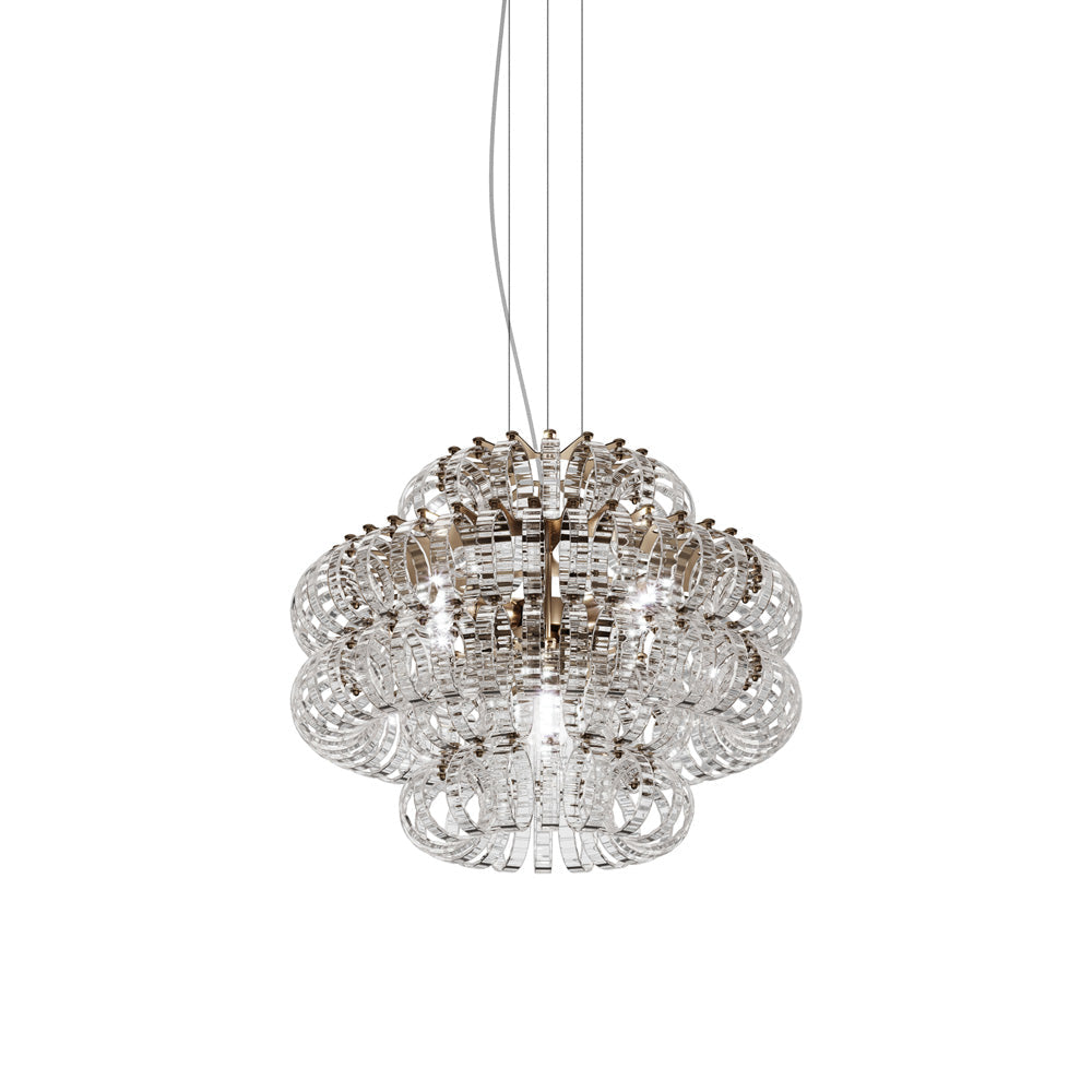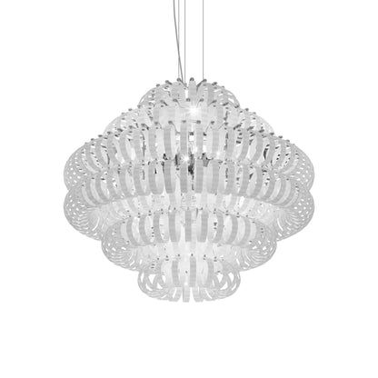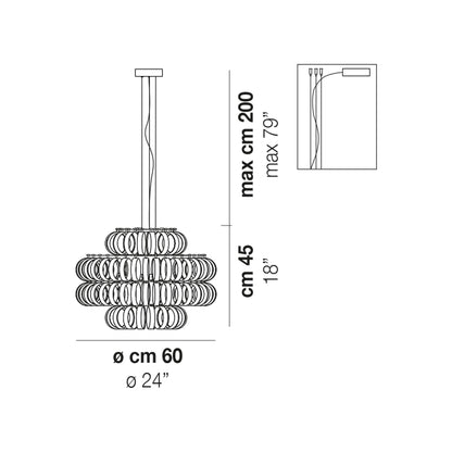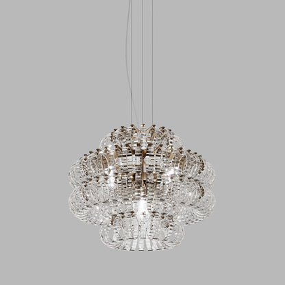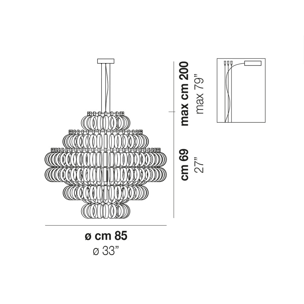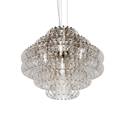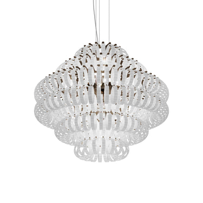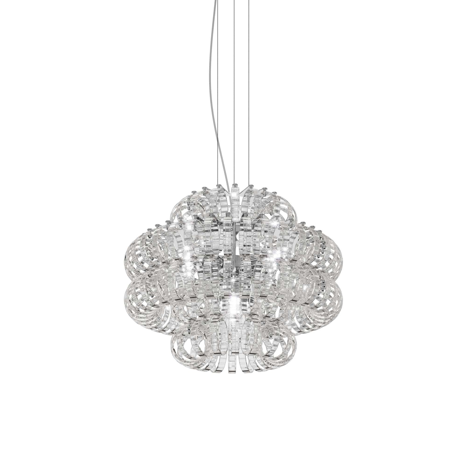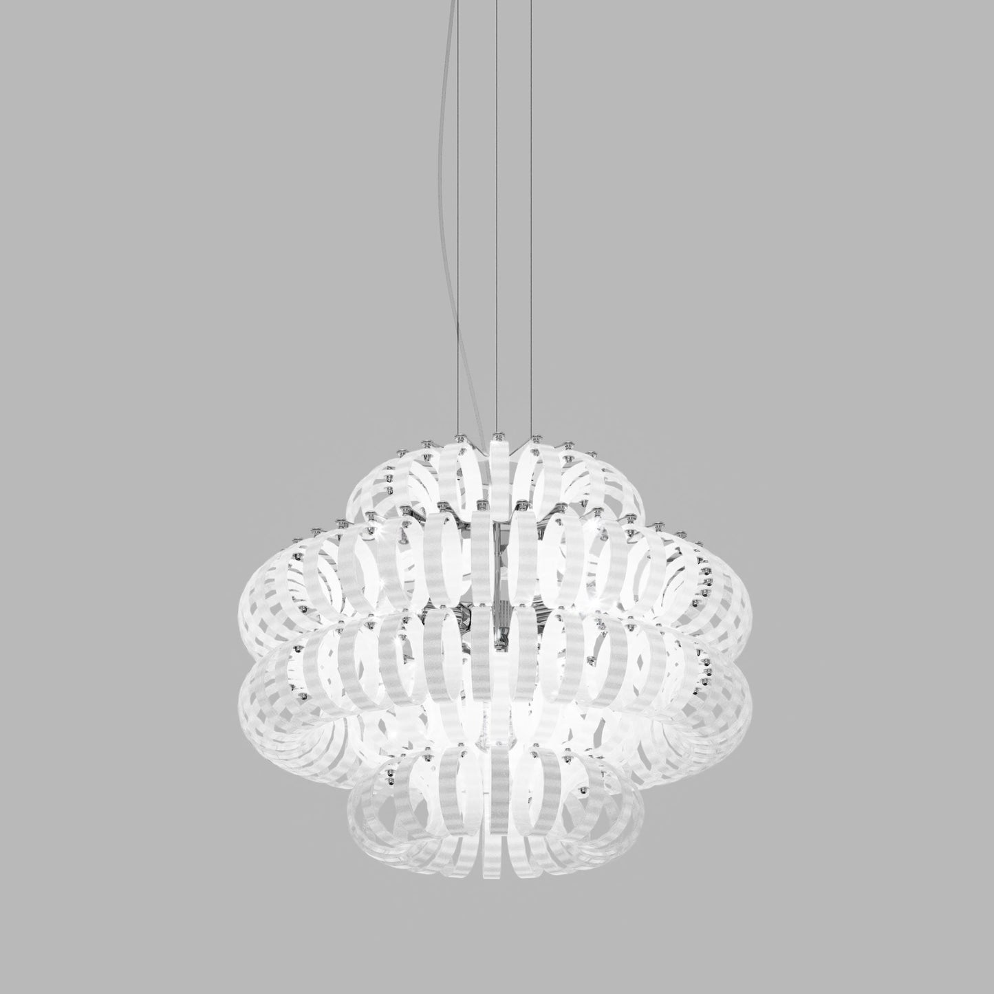 Create an experience of gratuitous glam in a formal space craving gallery-inspired artistry in lighting. Radiant textured glass showcases the Ecos Chandelier from Vistosi, offering a symmetrical display of layers featuring ribbon-like bands created to capture and reflect illumination with the ultimate in elegance.