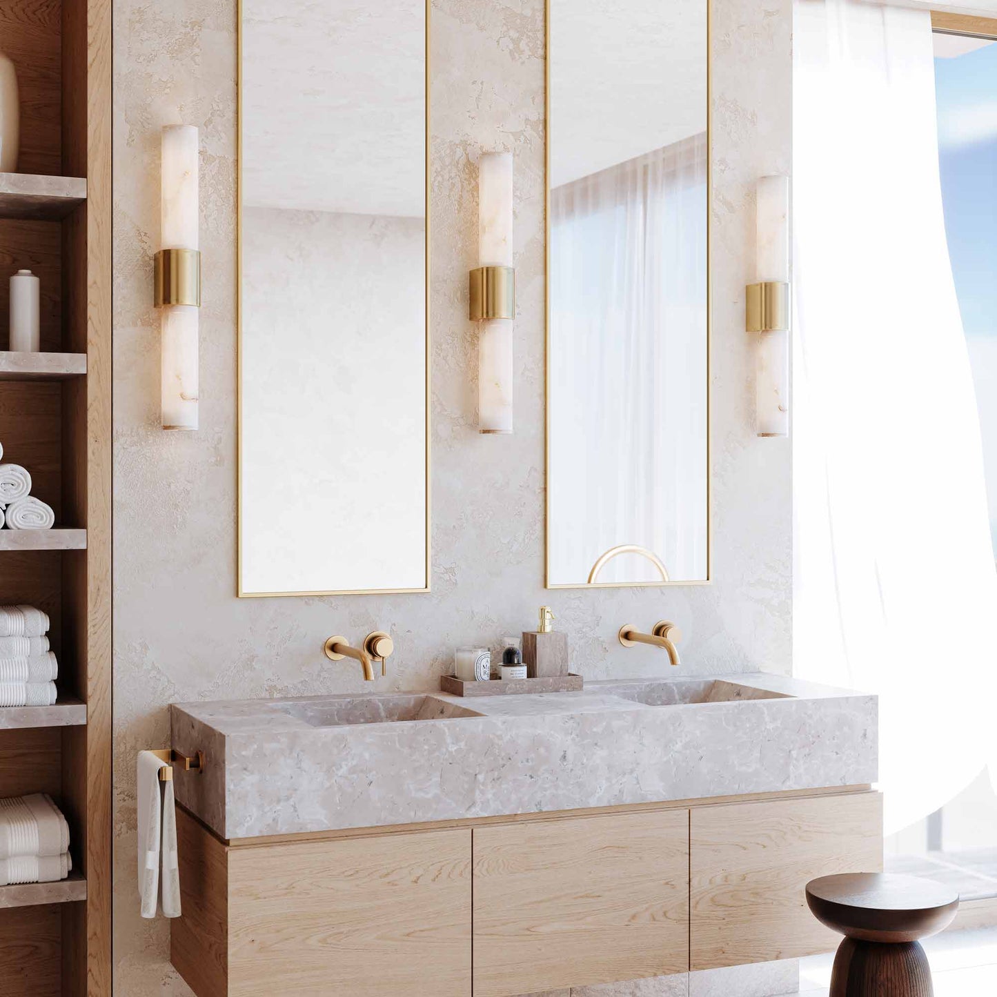 Elegant simplicity creates a soothing visual element to the Ellington Vanity Wall Light from Hudson Valley Lighting, embellished with a lush Spanish Alabaster cylinder shade and a gleaming metal wall plate.