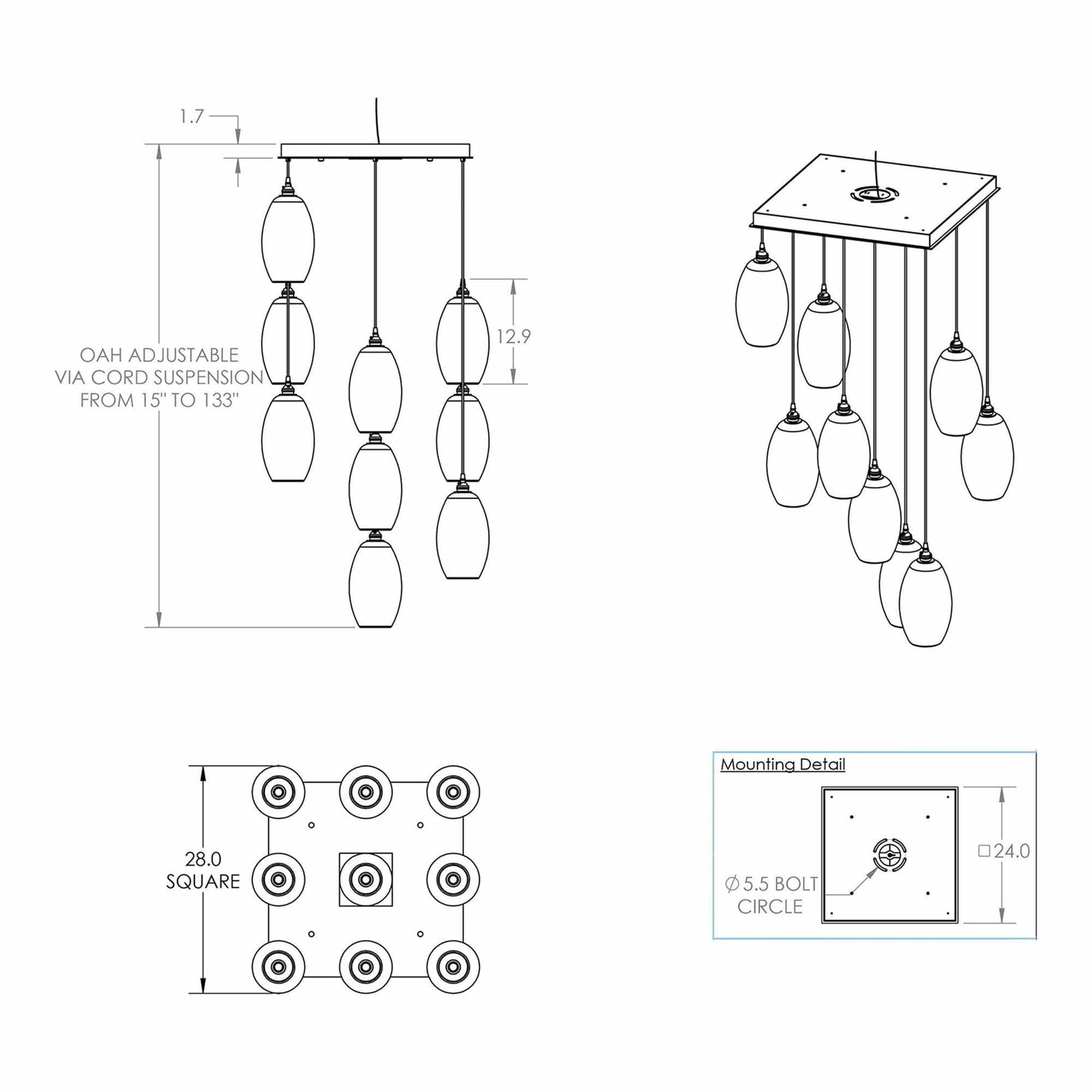 - 9-Light: 28.1"W X 15"H; 133" max height