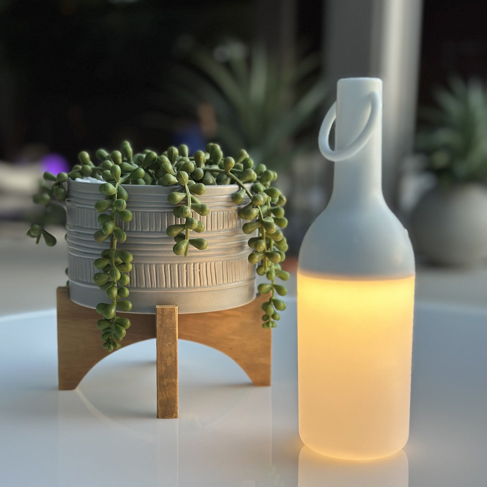 Gorgeously glowing with warm, ambient illumination, the ELO Nomad Portable Outdoor LED Table Lamp from DesignerBox is sure to become an icon in your backyard living space. A classically contoured bottle silhouette includes a ring at its apex, perfect for hanging in a tree or from a wire. It adjusts with just a touch and is both non-glare and weather resistant.