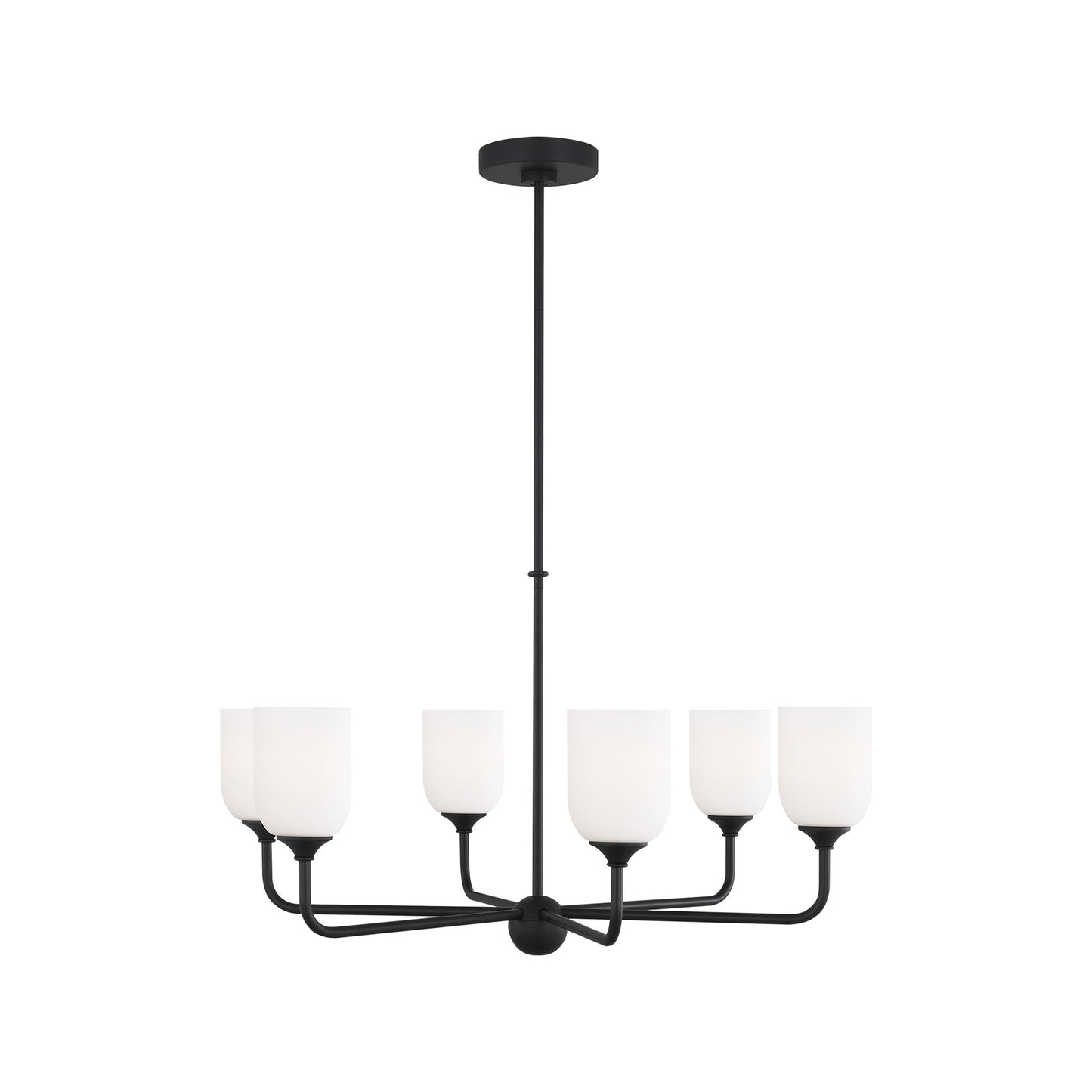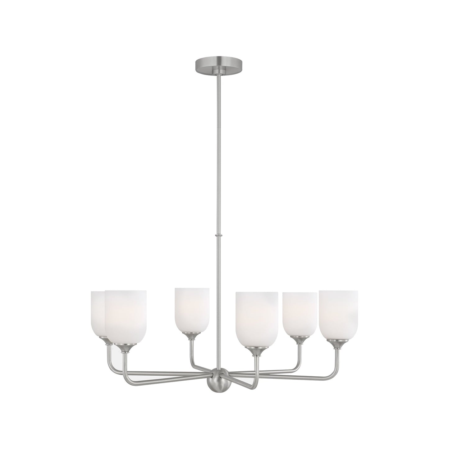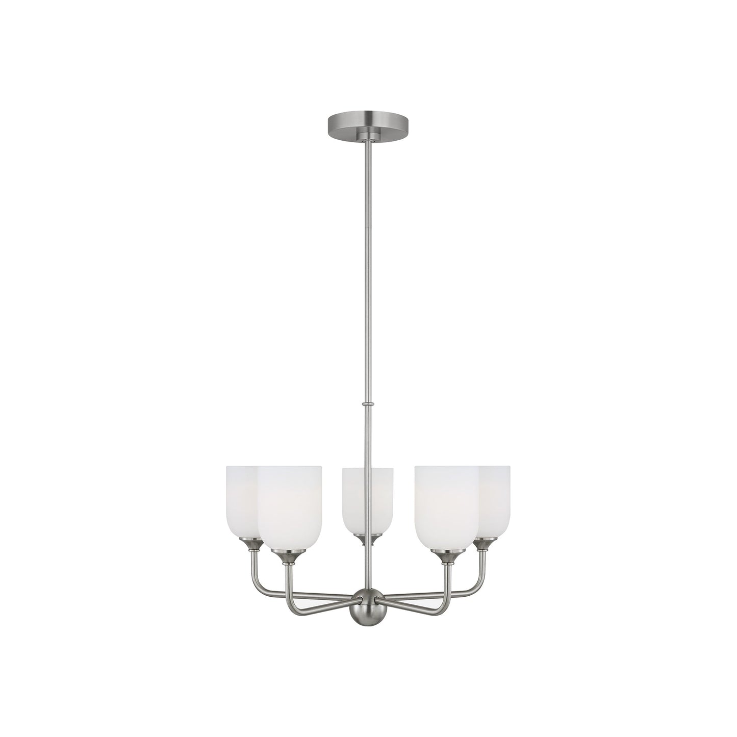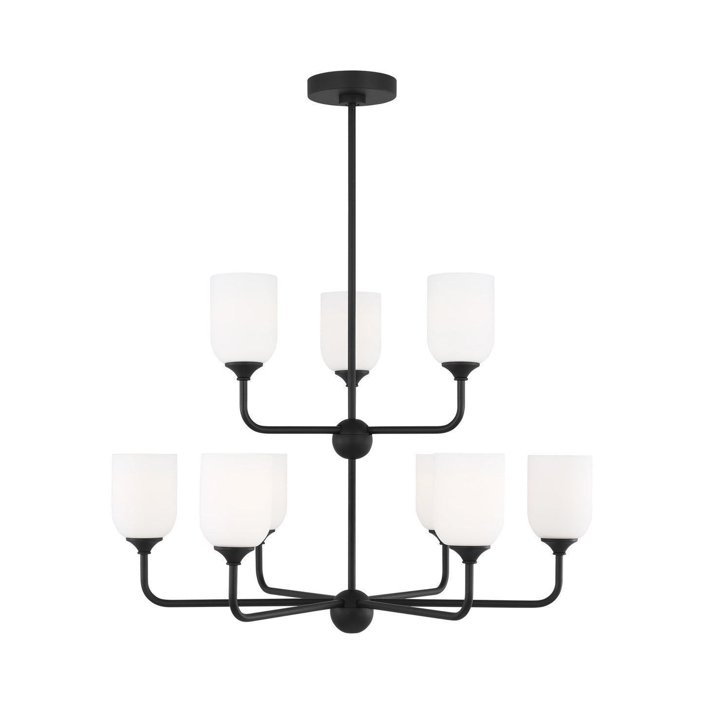 The Emile Chandelier from Generation Lighting delivers a provocative look of sophistication with modern styling. Milky white goblet shades and metal framing mix masterfully, with a bit of industrial-inspired elements emulating linear piping. This epic fixture is a must-have for dining rooms and foyers.