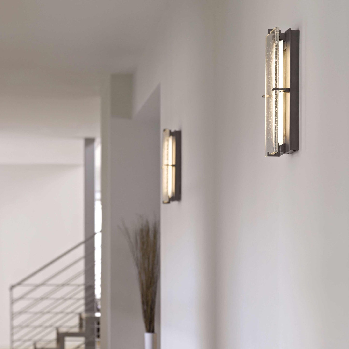 Layering opaque and thick, seedy glass panels is an effervescent choice for the Ethos LED Outdoor Wall Light from Hubbardton Forge.