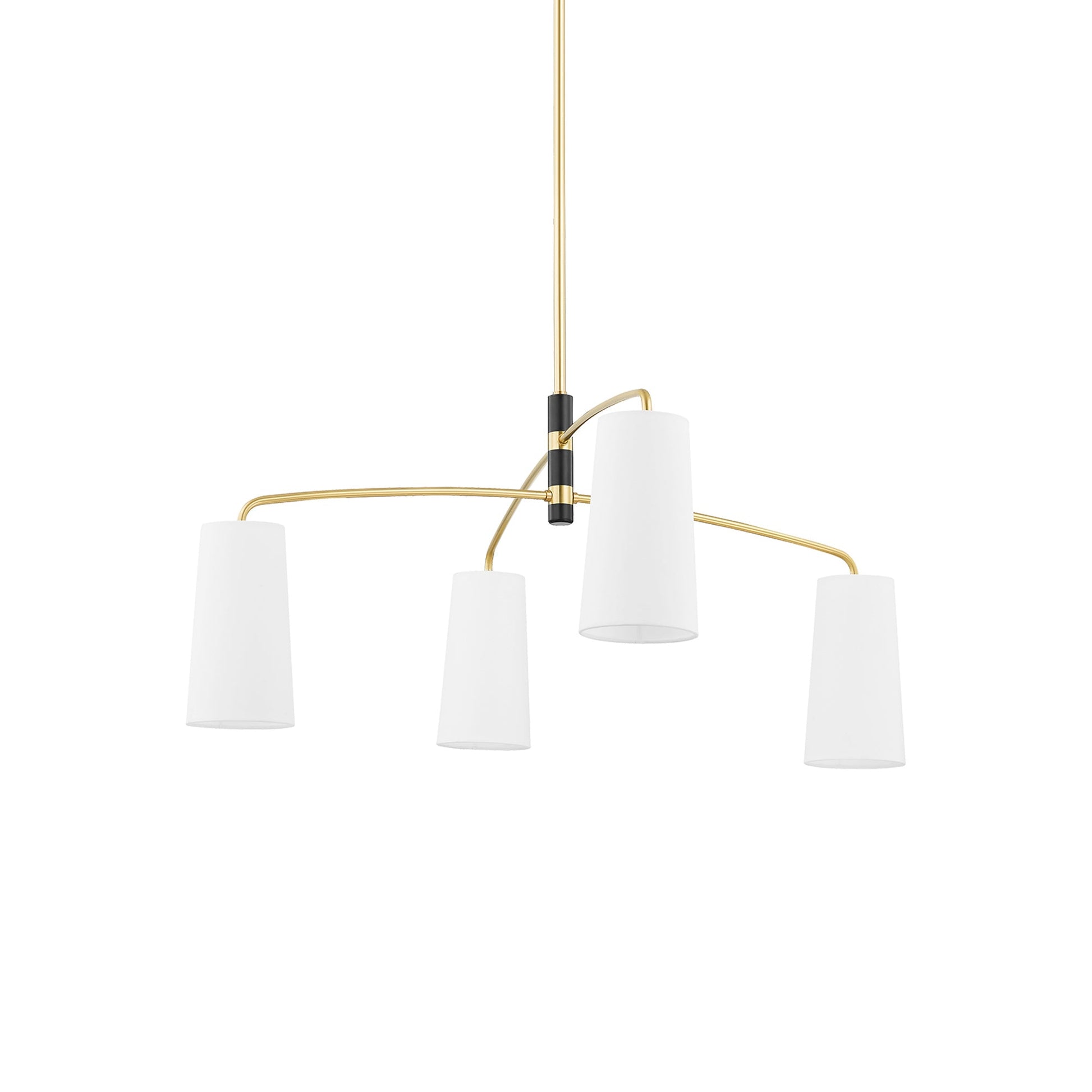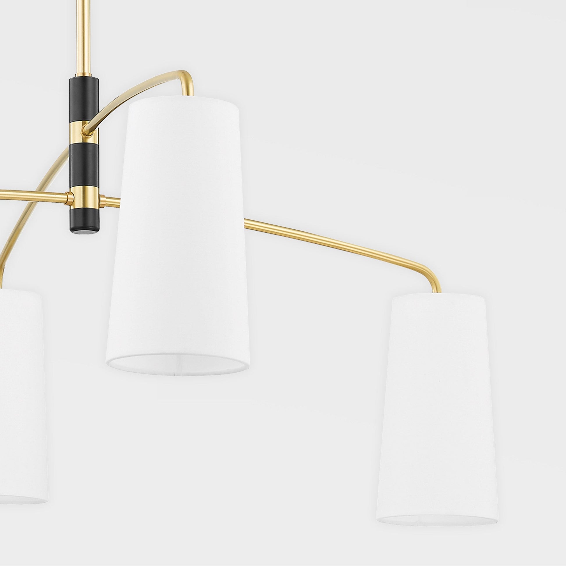 Dual cantilever style arms transform the sleek contemporary modern Evelyn Chandelier from Mitzi into a refined statement piece. Each elegantly curved arm is counterbalanced by crisp white Belgian linen shades, lending a bright glow across tablescapes, dining areas and more. Aged brass and soft black accents and catches the eye.