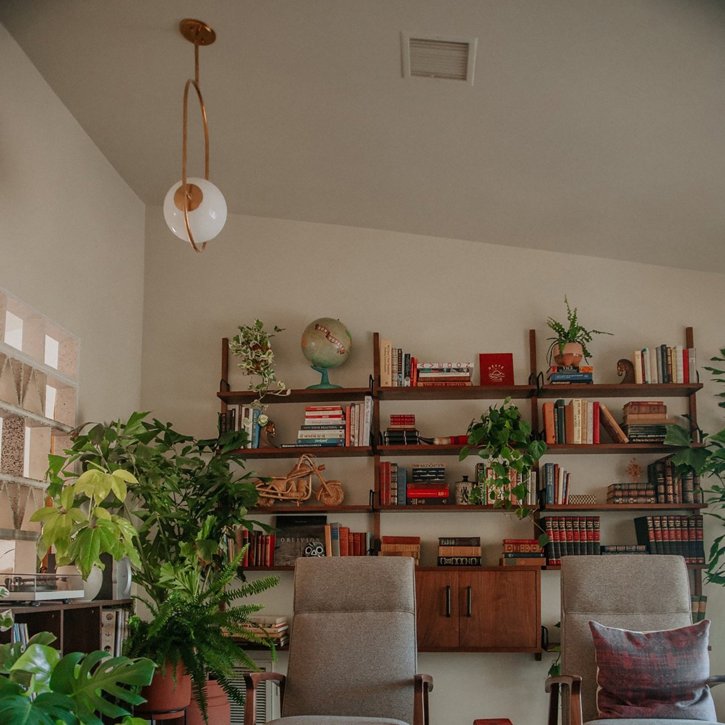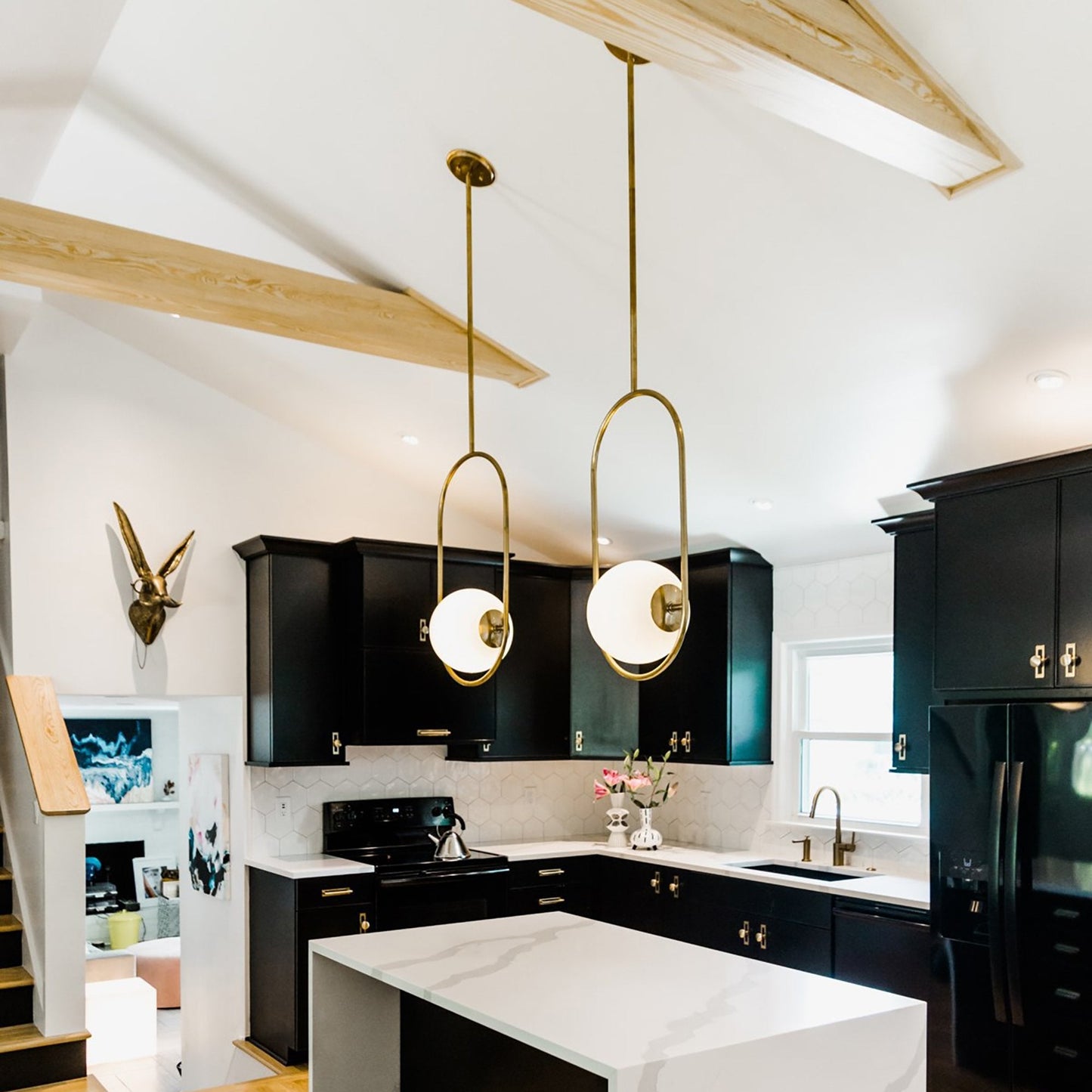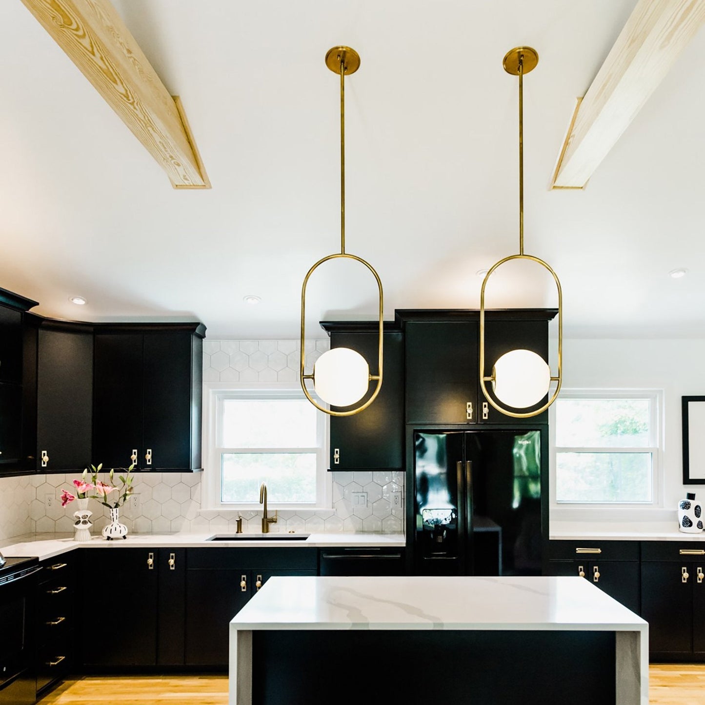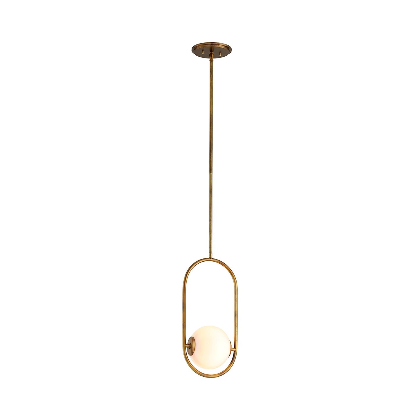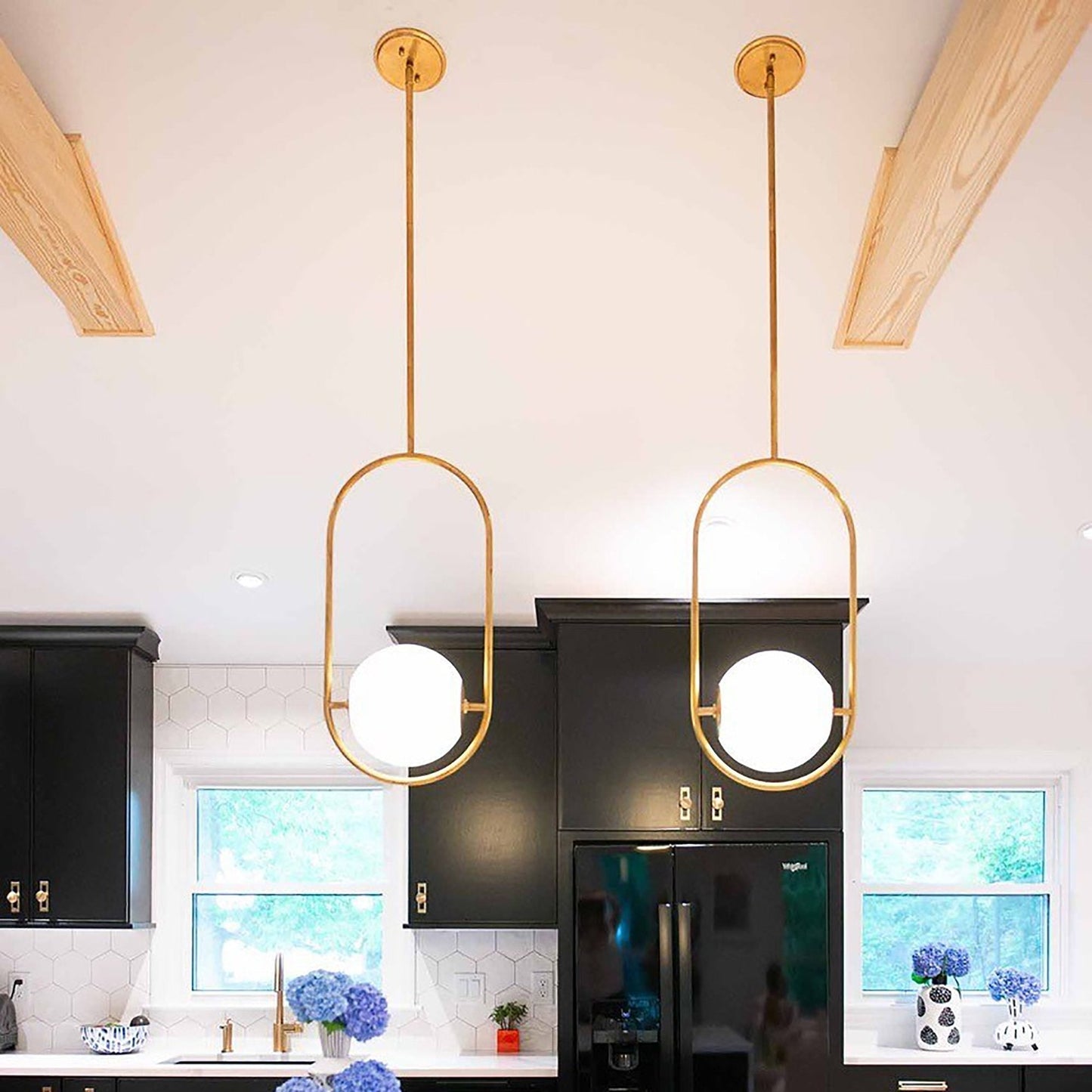 With an open concept design and retro feel, the Everley Pendant Light from Corbett Lighting creates a delightful aesthetic mixing vintage brass finish metal with a charming opal white glass orb shade.