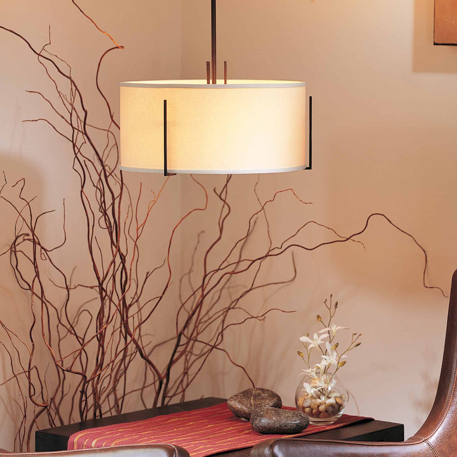 A drum shade is held in place with hand-forged steel bars that add the barest hint of dimension to this Exos Single Shade Pendant Light from Hubbardton Forge.