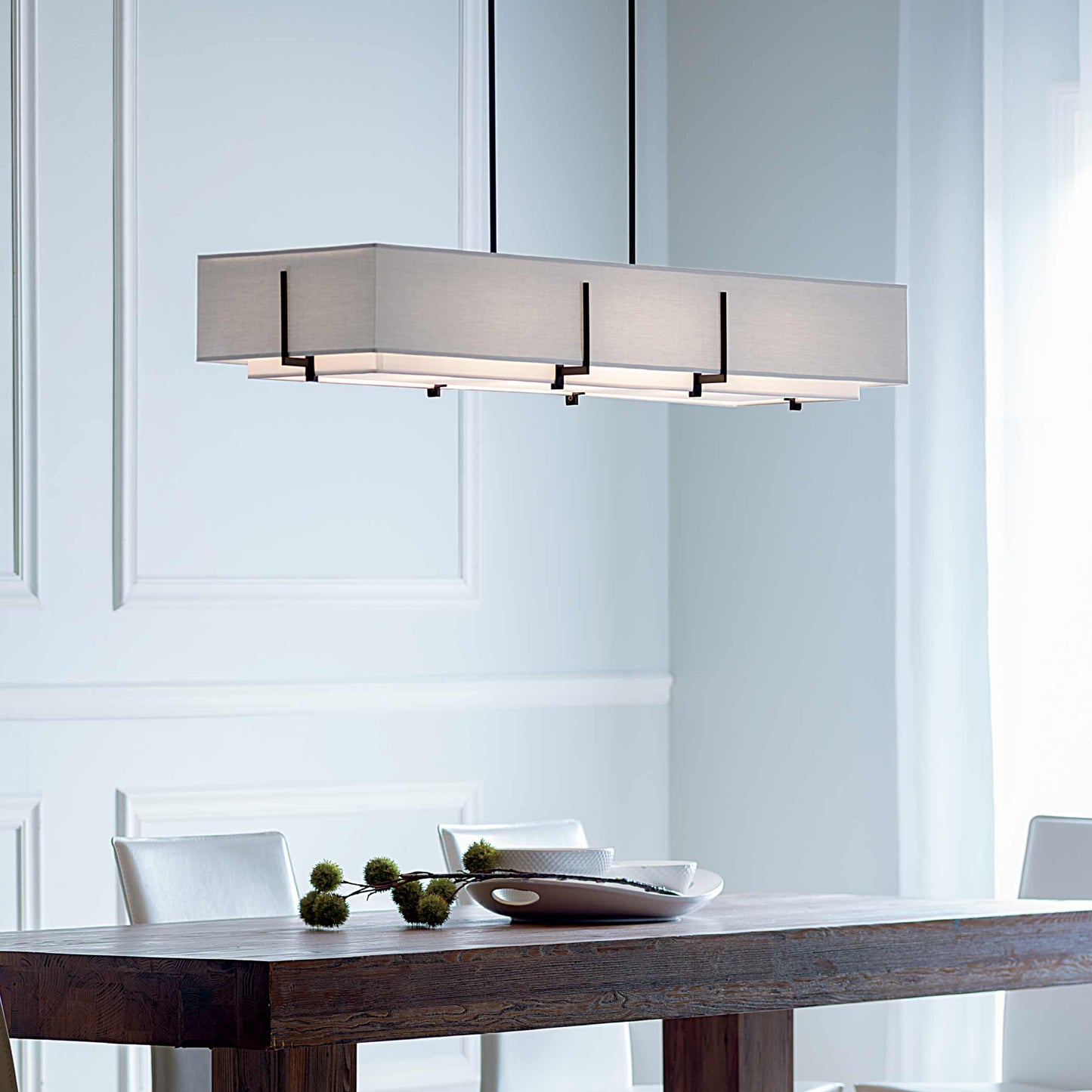 A layered shade and hand-forged bars create a compelling combination when paired on the Exos Standard Rectangular Pendant Light from Hubbardton Forge.
