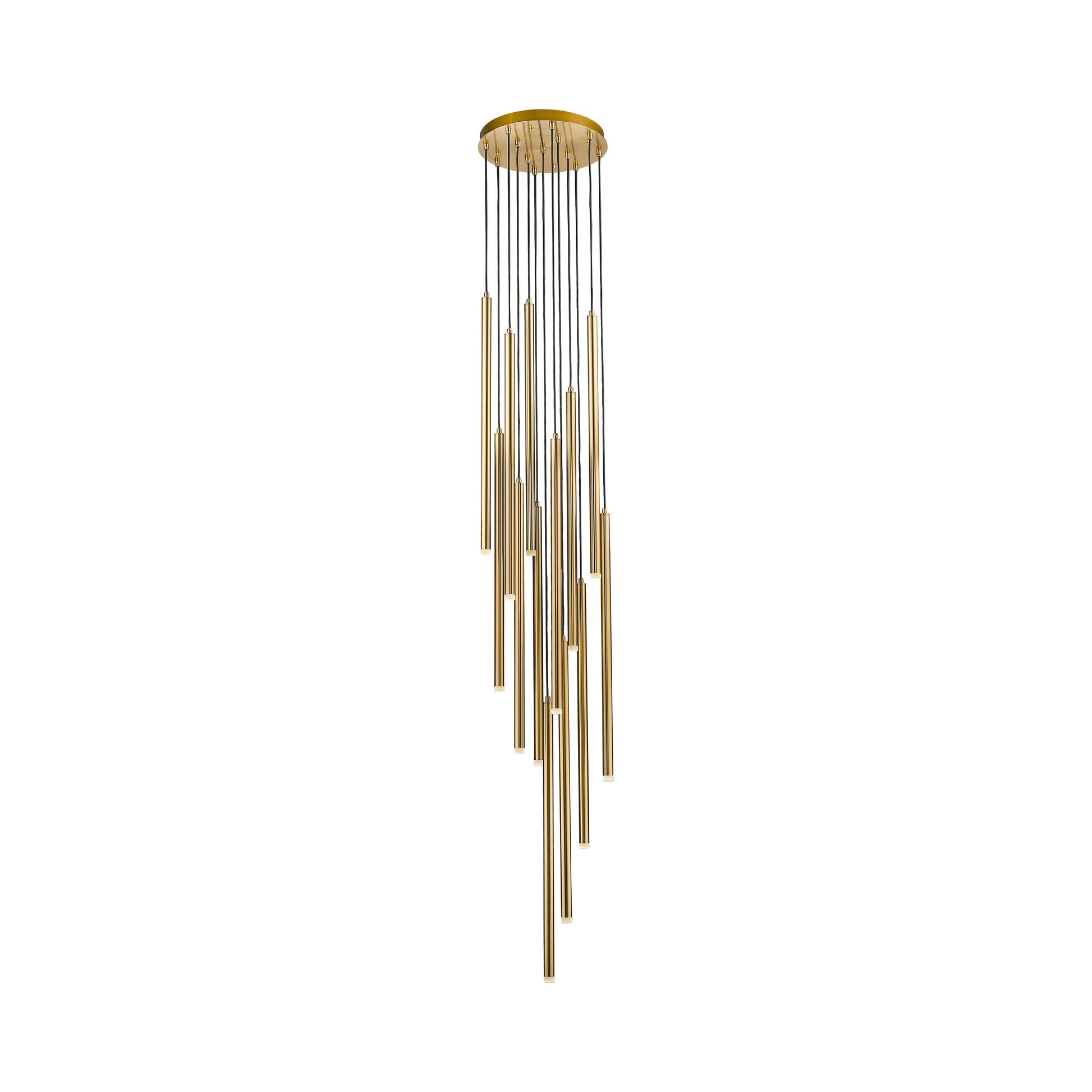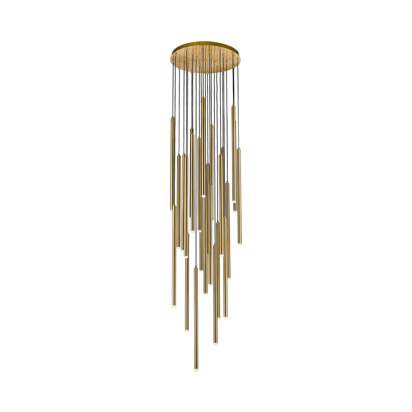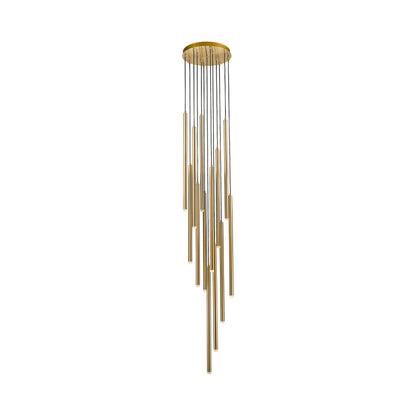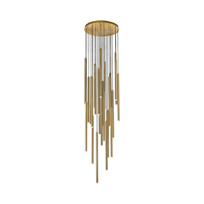 The casacding antique brass rods give the Filmore Multi-Light Pendant Light a dramatic effect. Artfully evoking rainfall, 13 or 25 slender tubes that are suspended asymmetrically from a sleek canopy, casting a dramatic glow.