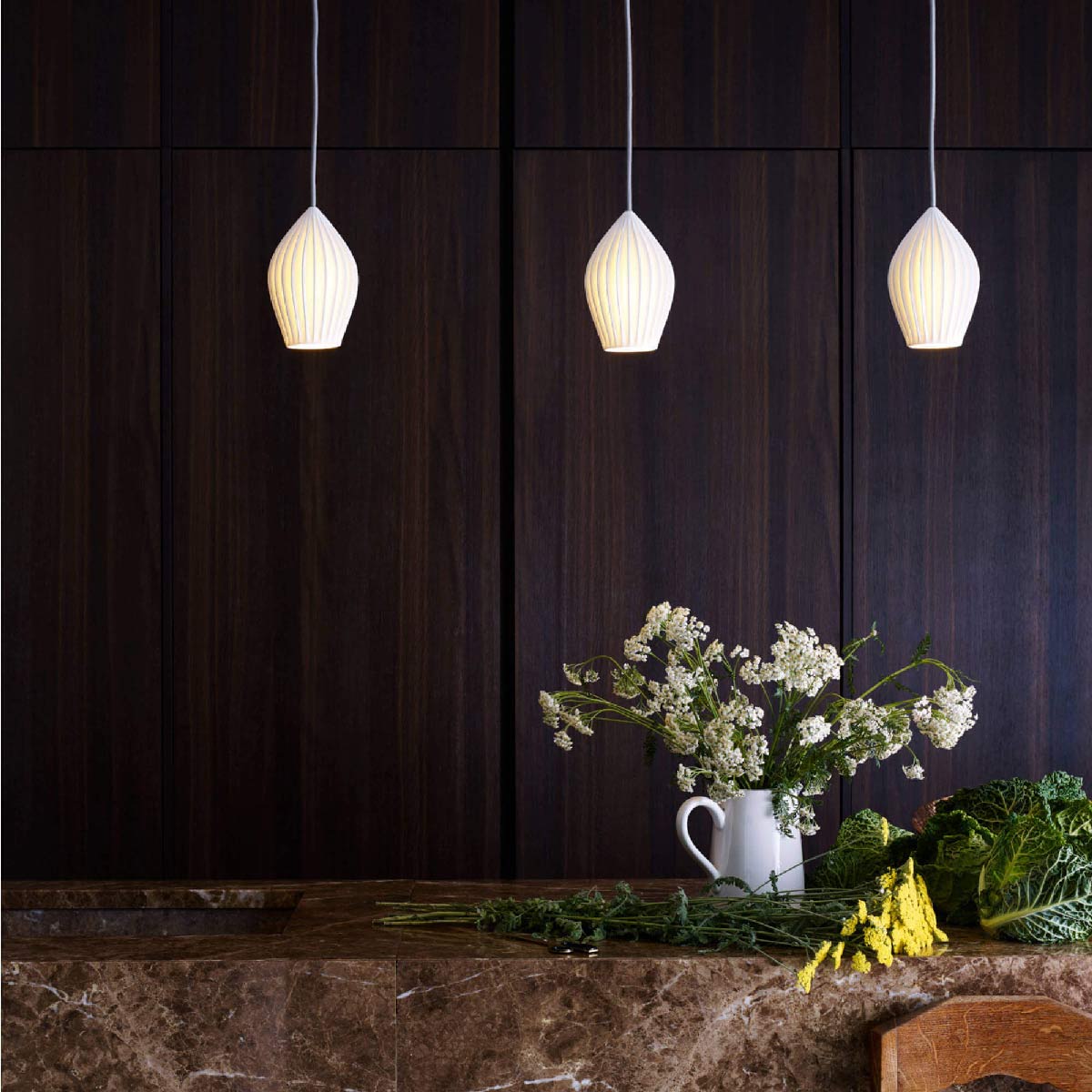 Beginning with its delicate ceramic construction and sleek, slender silhouette, the Fin Pendant Light from Original BTC is the clear favorite for celebrating elegance with organic impact. Sculptural glam results from ridges on natural white bone china in a tulip shape shade, with a cotton cord adding measured earthy style. Place this fixture as a solo piece, or arrange in a row to illuminate a horizontal space.