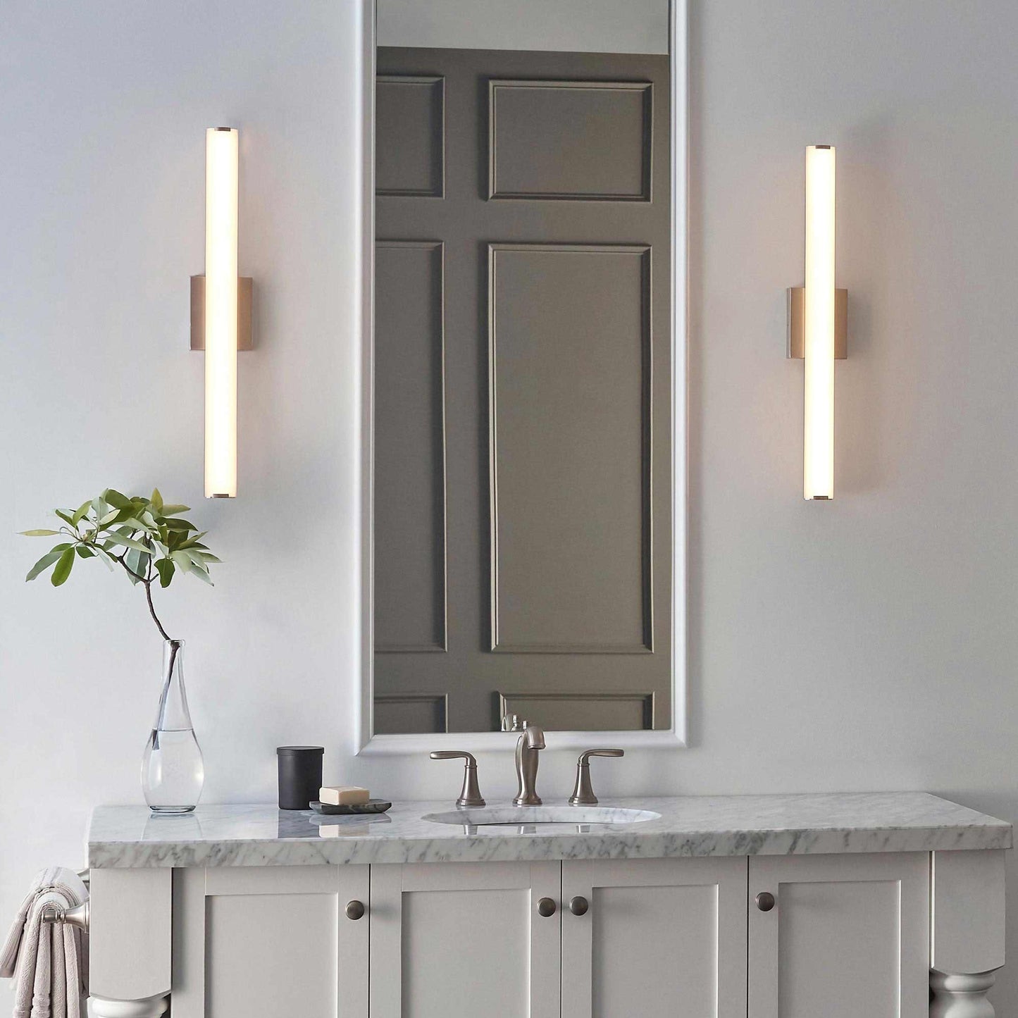 The Finn LED Bath Vanity Light from Visual Comfort Modern is simply sophisticated with its sleek dome shaped acrylic diffusor. The Finn provides an ample amount of wide-angled task and ambient light though the acrylic diffuser. The Finn is available in two on-trend hardware finishes, Antique Bronze and Satin Nickel, each finish further enhances the modern beauty of the Finn bath light. The Finn Bath ships with your choice of efficient LED lamping both options are fully dimmable to create the desired ambiance in your unique space. The Finn scales at 24" in length and 4.3" in width making it ideal for bathroom lighting and vanity lighting.