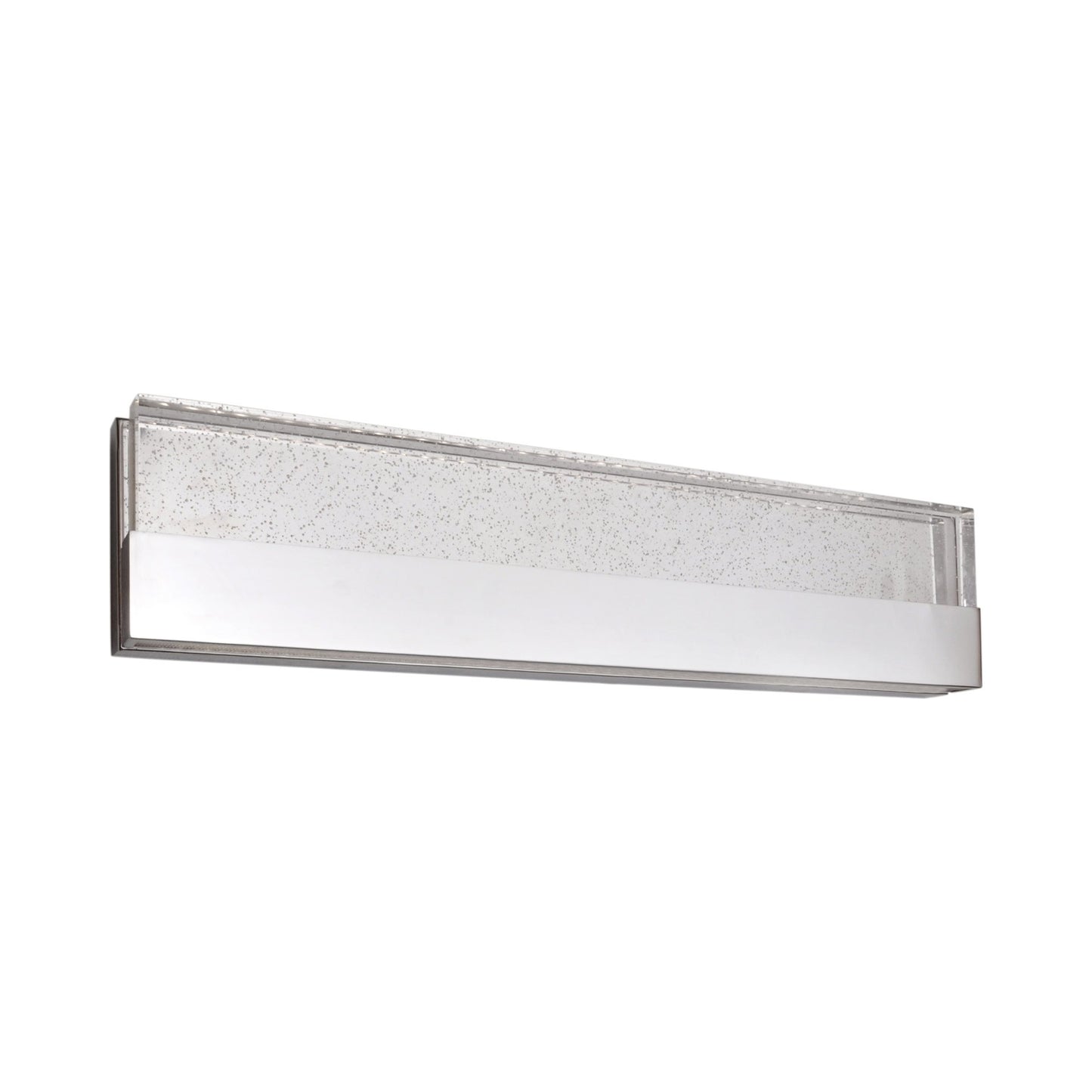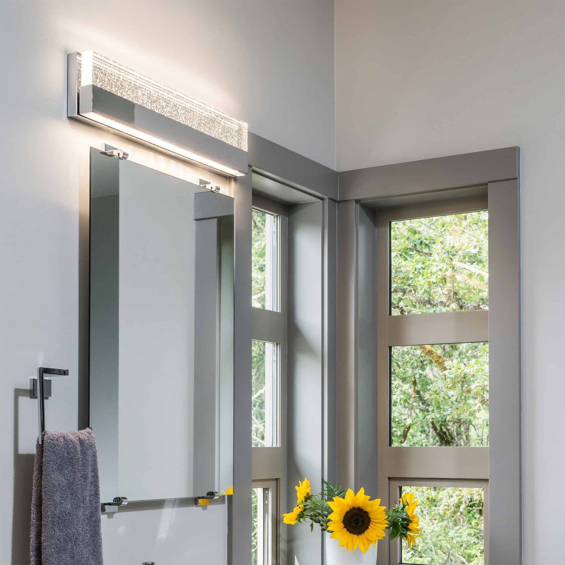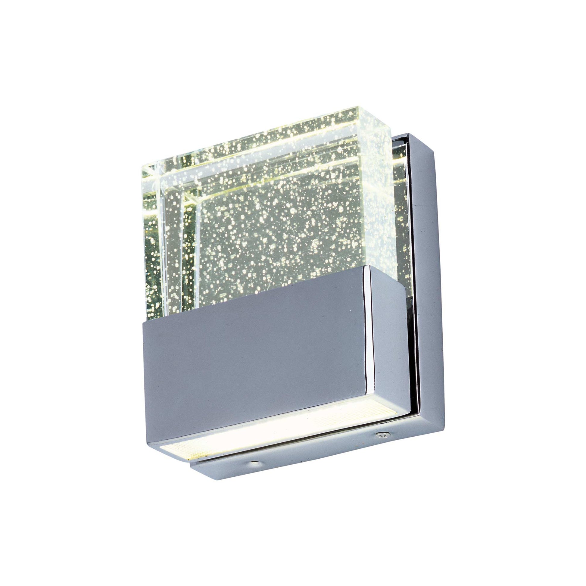 The Fizz Collection's effervescent bubbles encased in rectangular glass cubes come to life when illuminated by high output LEDs. The etched lines add linear detail as they extend from the Polished Chrome fitters.