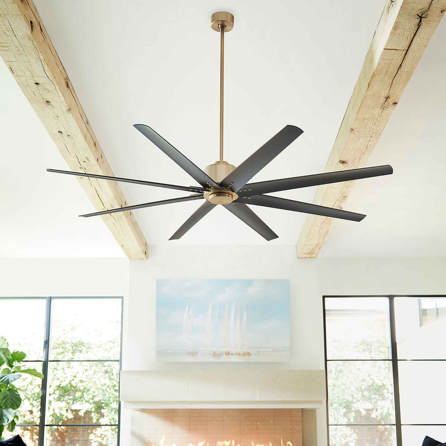 Contrasting rivet details highlight the eight blades of the boldly modern Fleet Ceiling Fan from Oxygen.