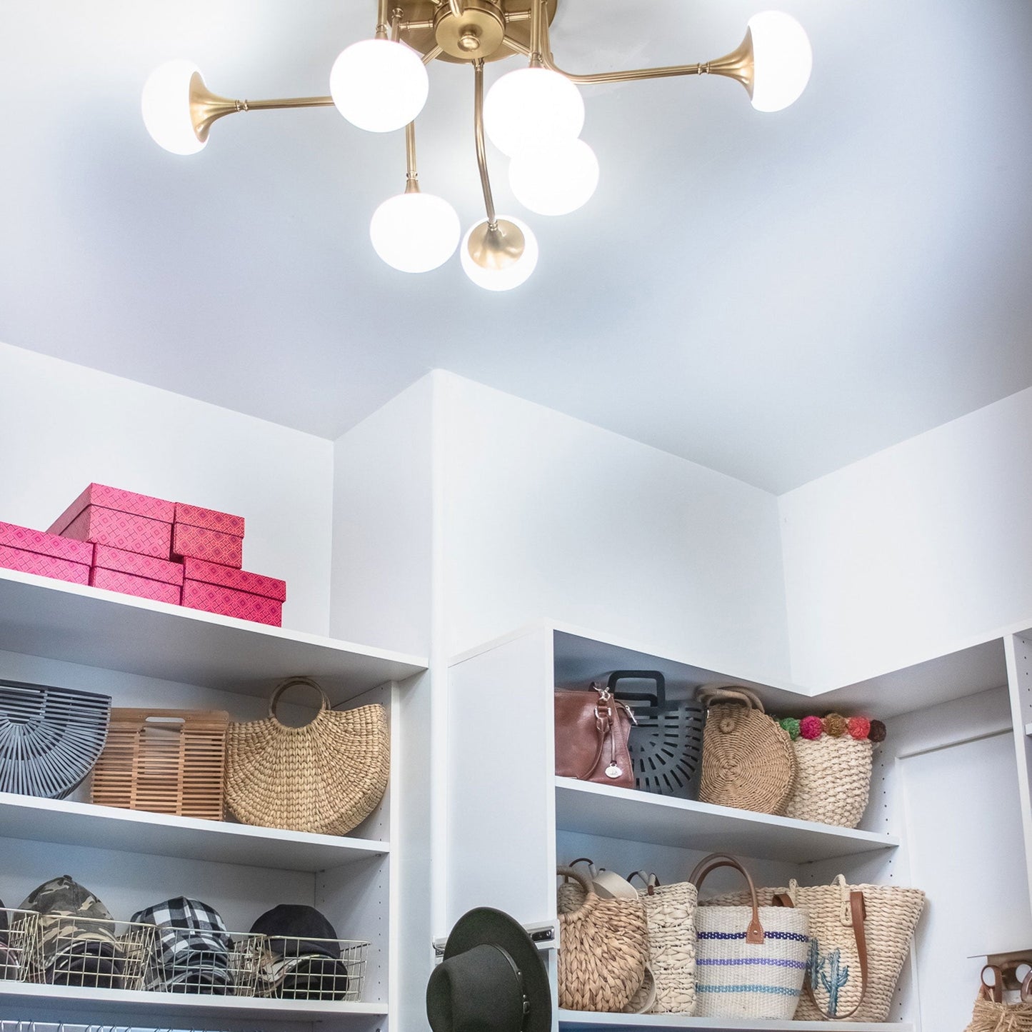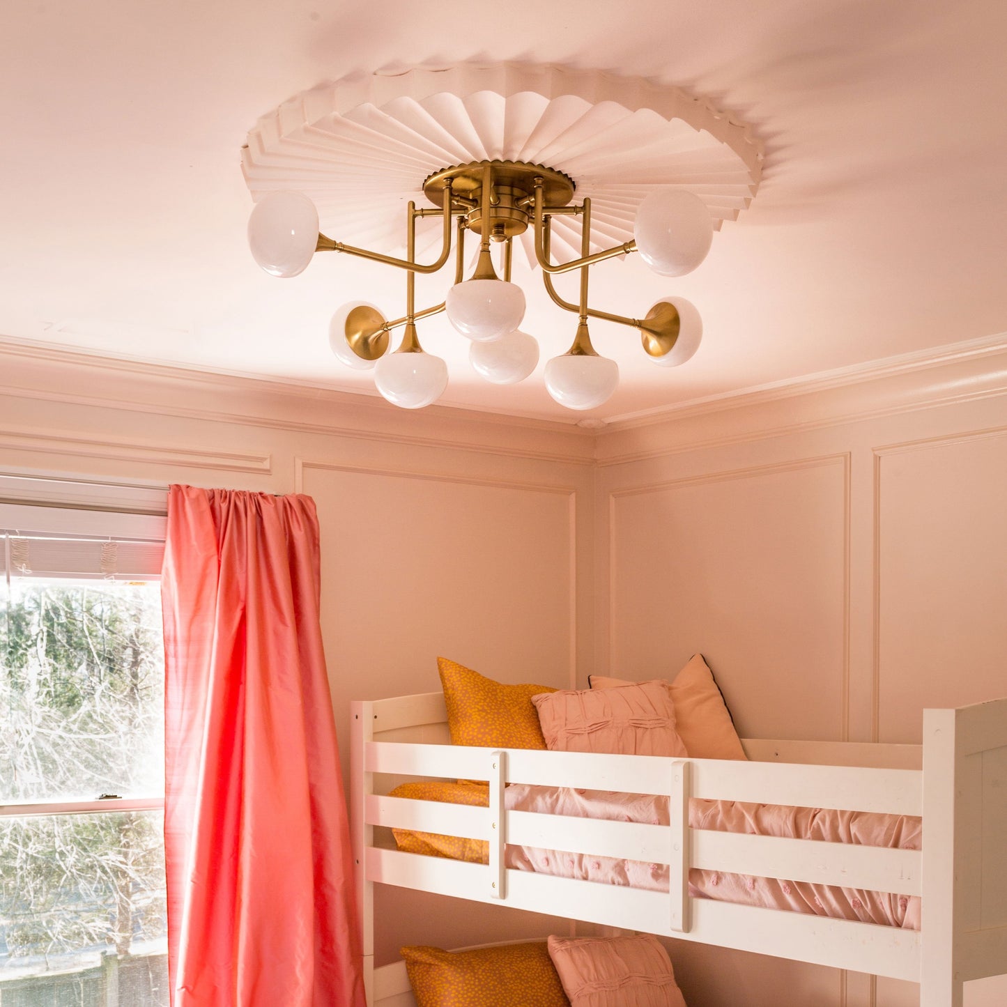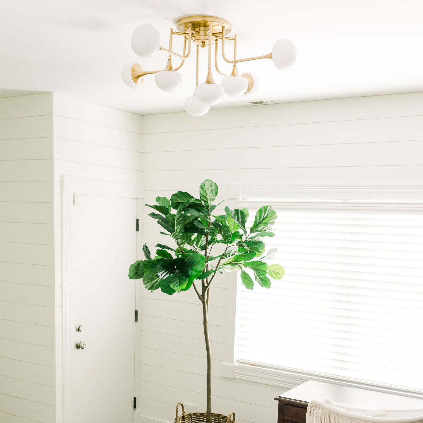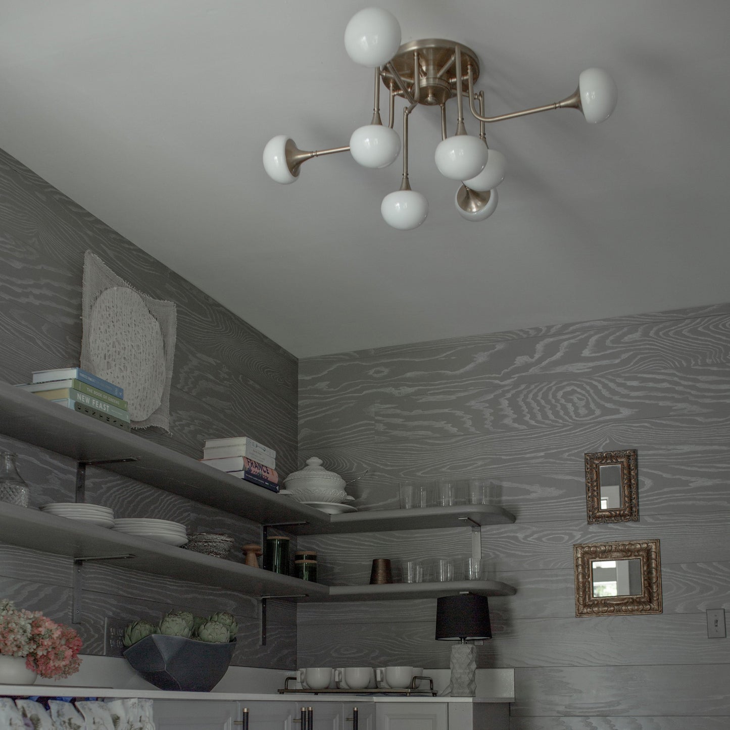 Artistic detailing takes a quirky turn that works in modern spaces when the Flemming LED Semi-Flush Mount Ceiling Light from Hudson Valley Lighting offers energy-efficient illumination through an arrangement of opal glossy glass shades and trumpet-like frame rods.
