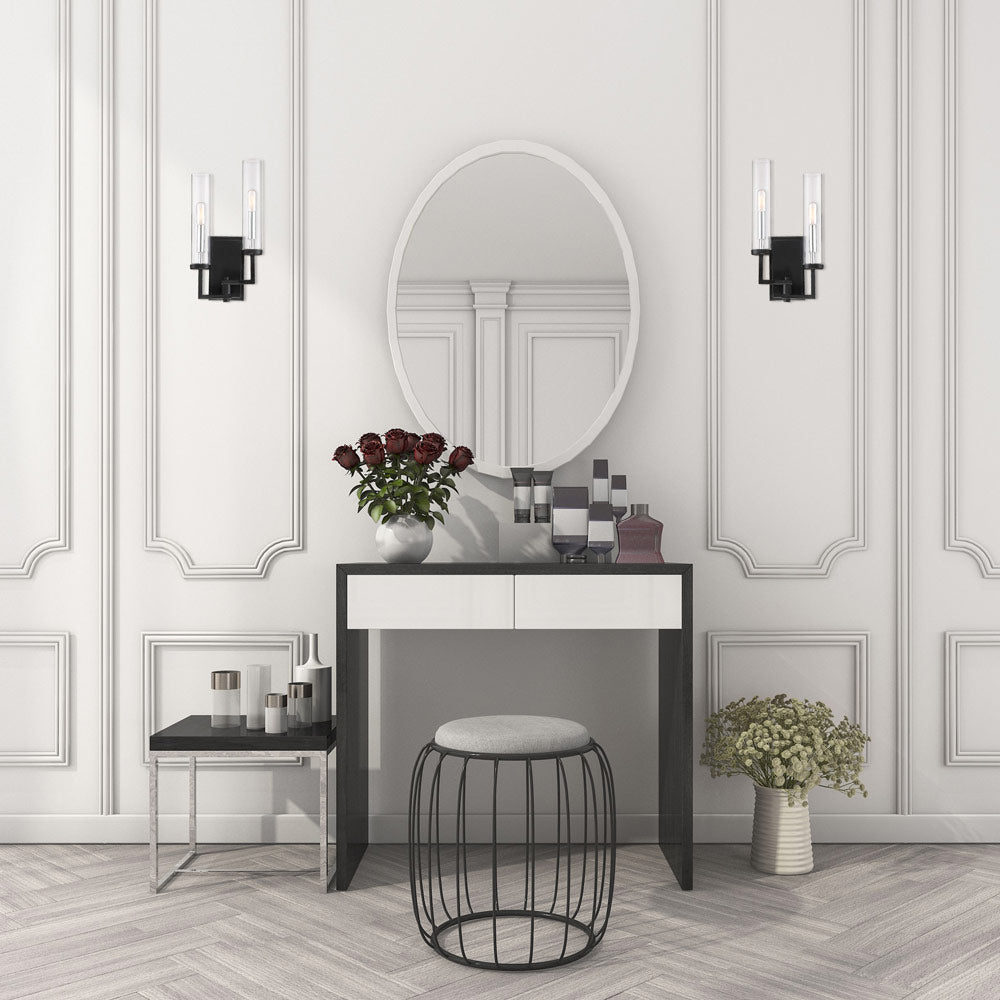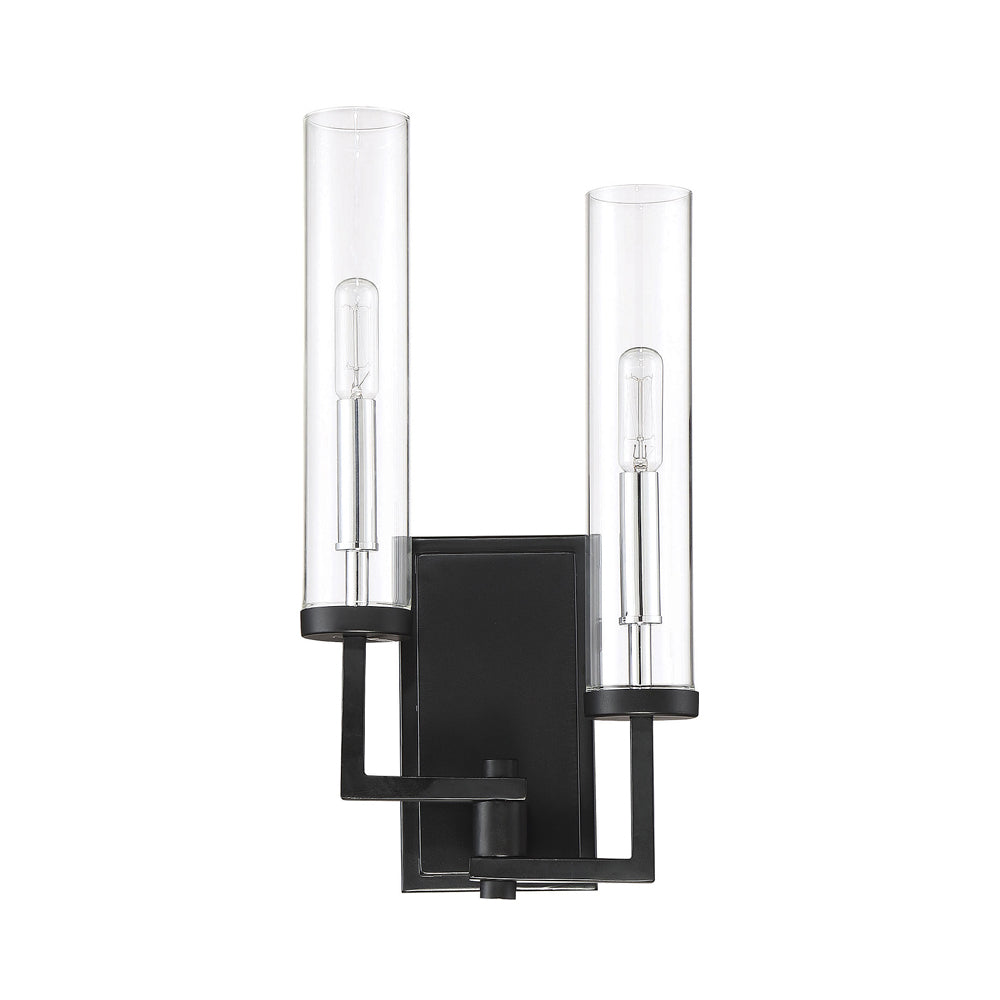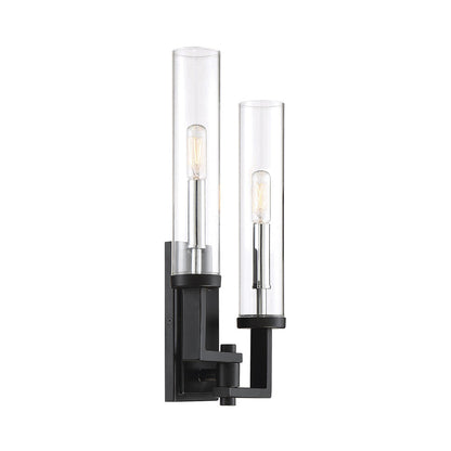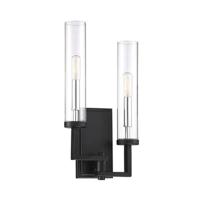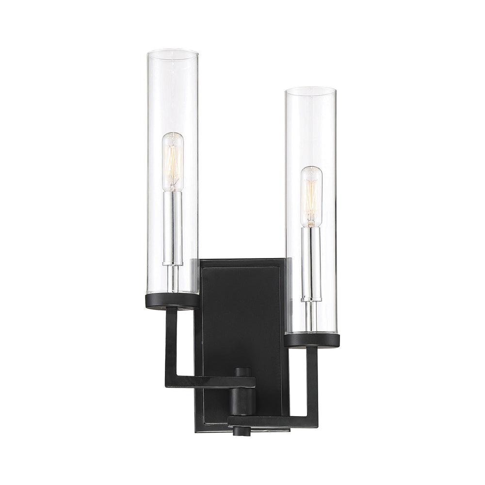 Classic with asymmetrical flavor, the Folsom Wall Light from Savoy House ups the ante with chic sophistication. An ideal choice for a variety of design schemes, this elegant fixture features cool matte black and chrome finish metal framing and accents. Delicate clear glass shades form cylinders to soften this sconce’s gritty aesthetic, transforming it into a truly versatile light source.