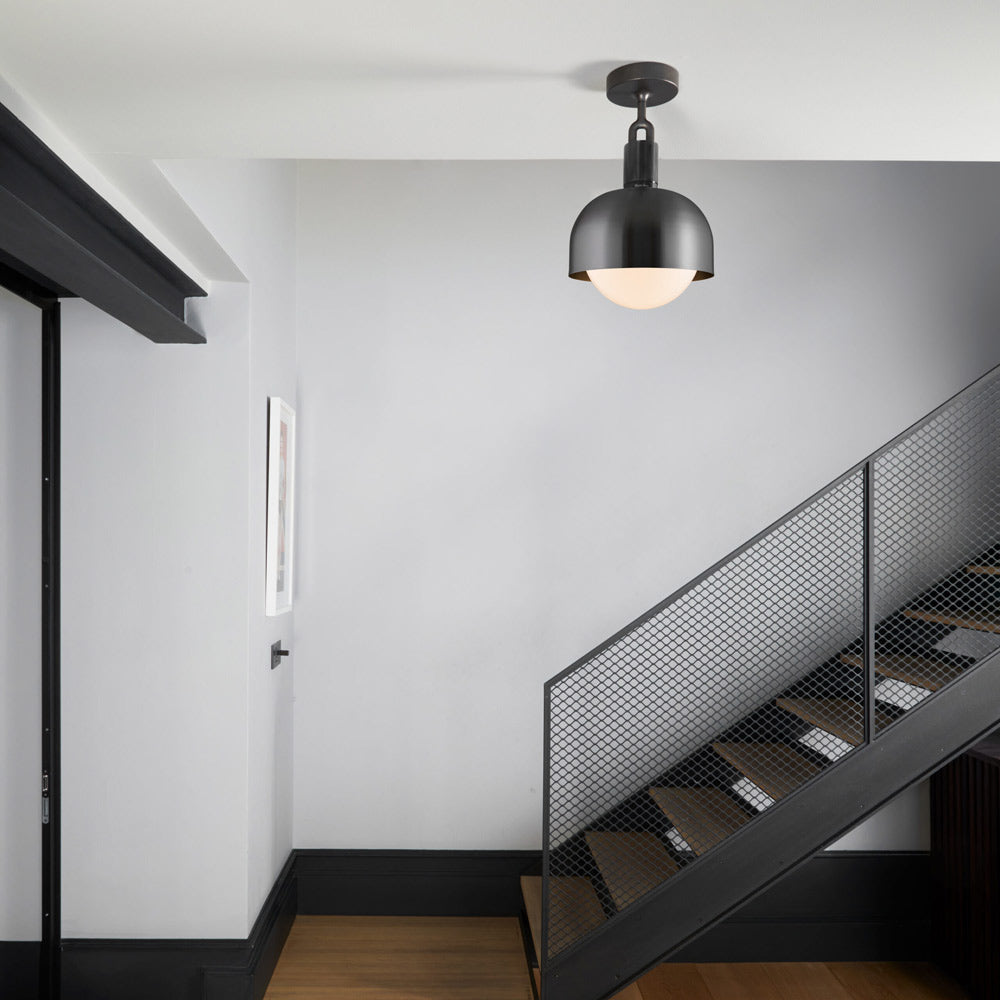 Make a statement consistent with a blend of industrial and farmhouse motifs. Adding energy-efficient illumination to a focal point, the Forked Shade Globe Semi Flush Mount Ceiling Light from Buster + Punch maintains a conventional sleek metal-constructed shade with ornate accents. A festive globe shade descends to glow with illumination.