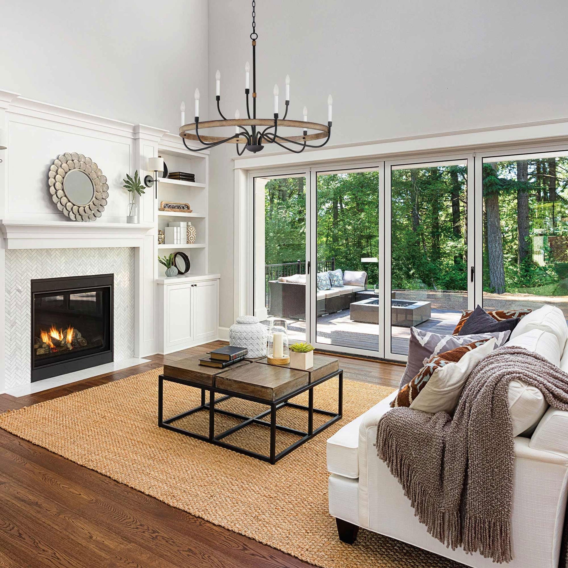 Rustic charm in an elegant, yet simple chandelier with warm distressed wood finishes and textured black metal arms. White candle covers evoke wax candles to complete the classic and transitional appeal of this series. The flush mount features a satin white diffuser to soften the lamps within.