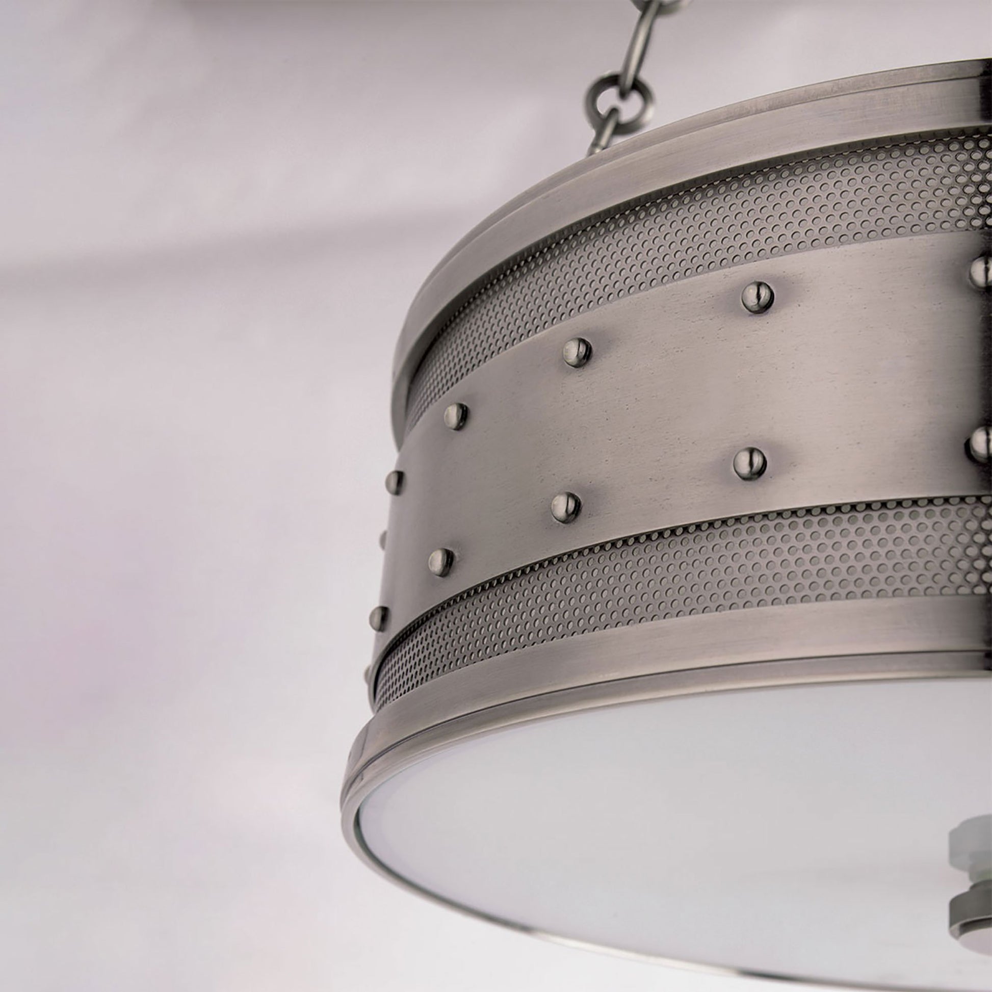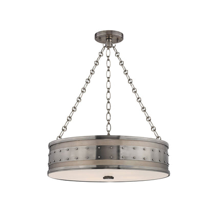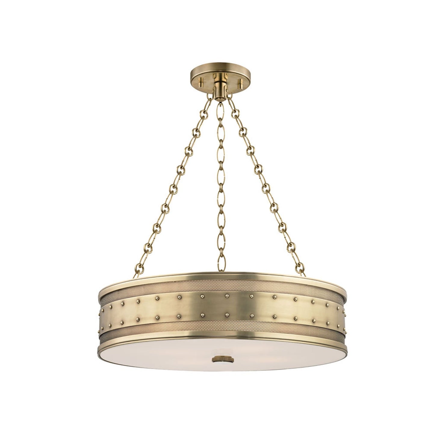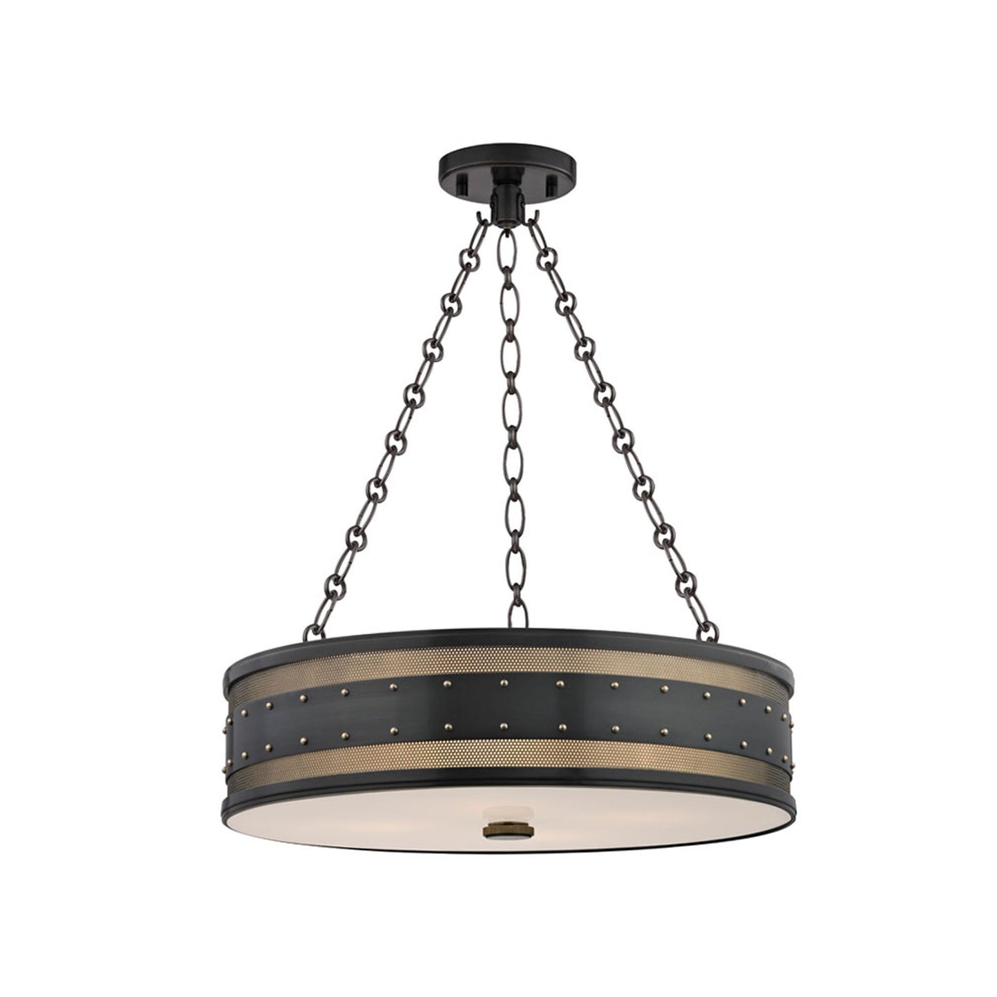 Design conformity is dressed up with charming accents in the Gaines Pendant Light from Hudson Valley Lighting, showing off a tasteful drum silhouette with chain link supports and a clear outside frosted shade.