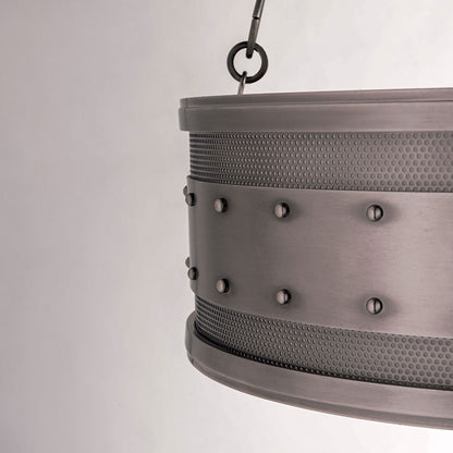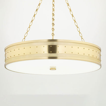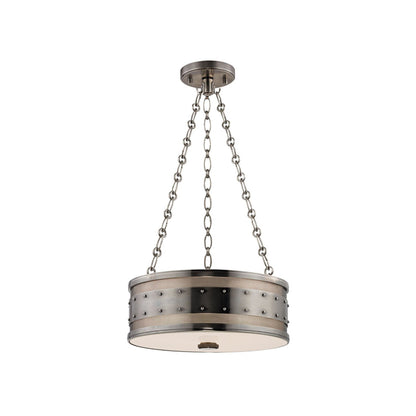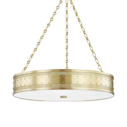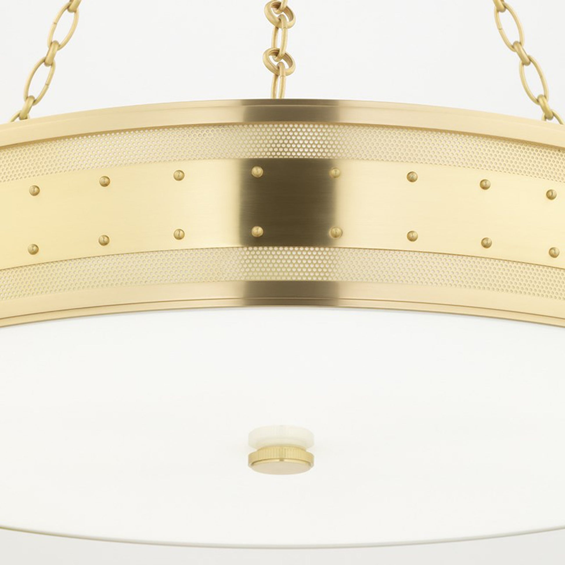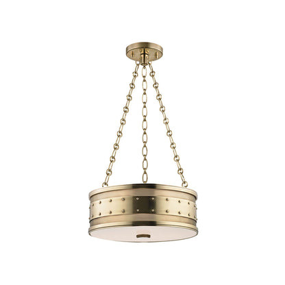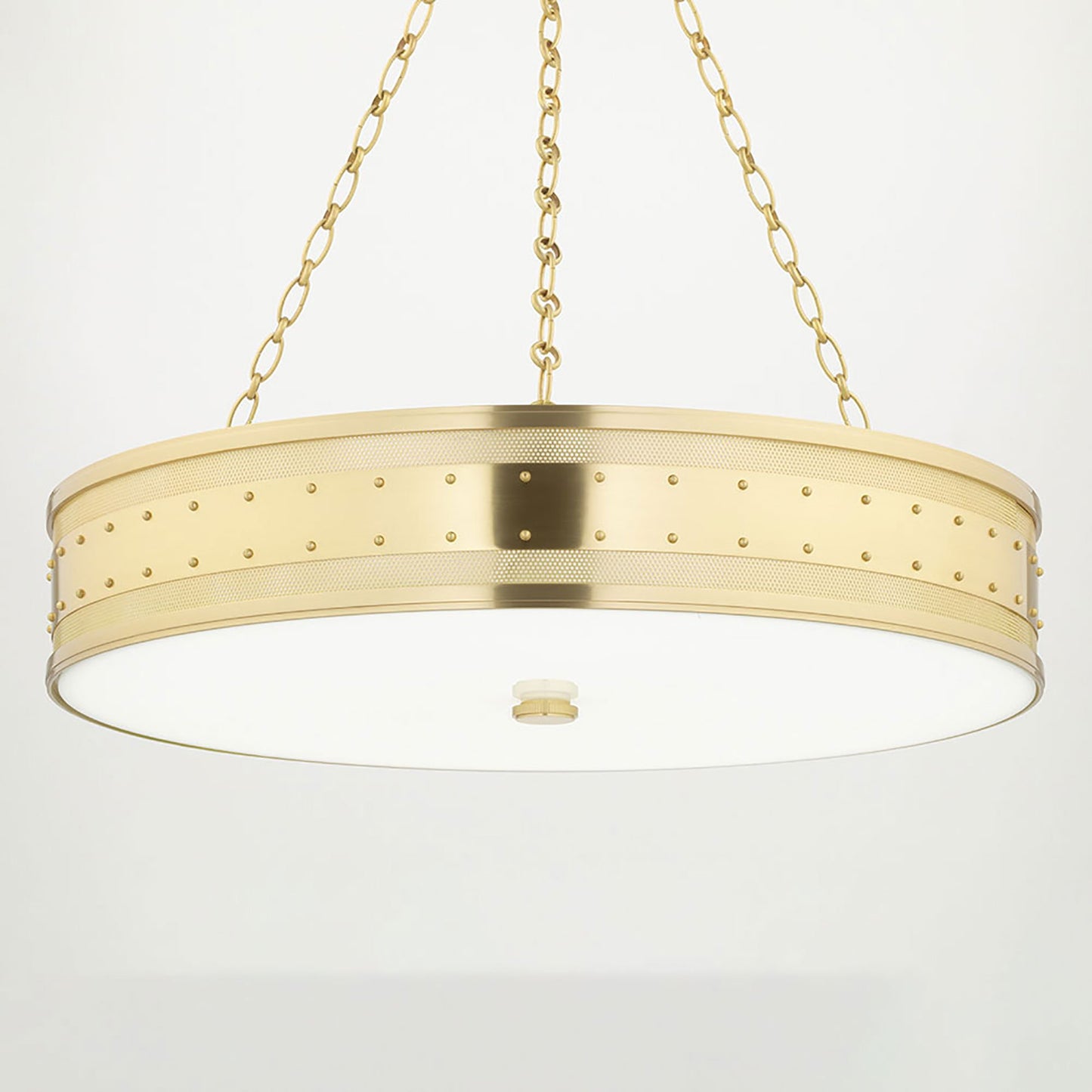 Design conformity is dressed up with charming accents in the Gaines Pendant Light from Hudson Valley Lighting, showing off a tasteful drum silhouette with chain link supports and a clear outside frosted shade.