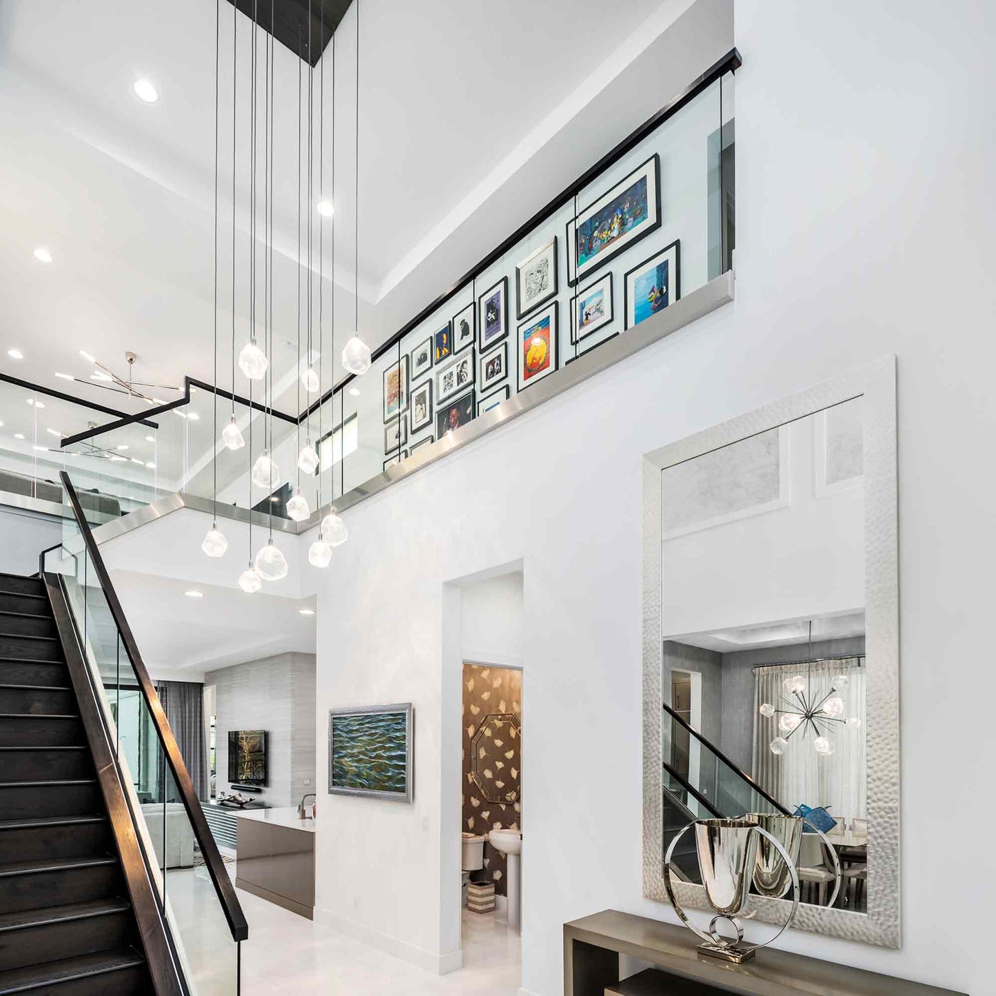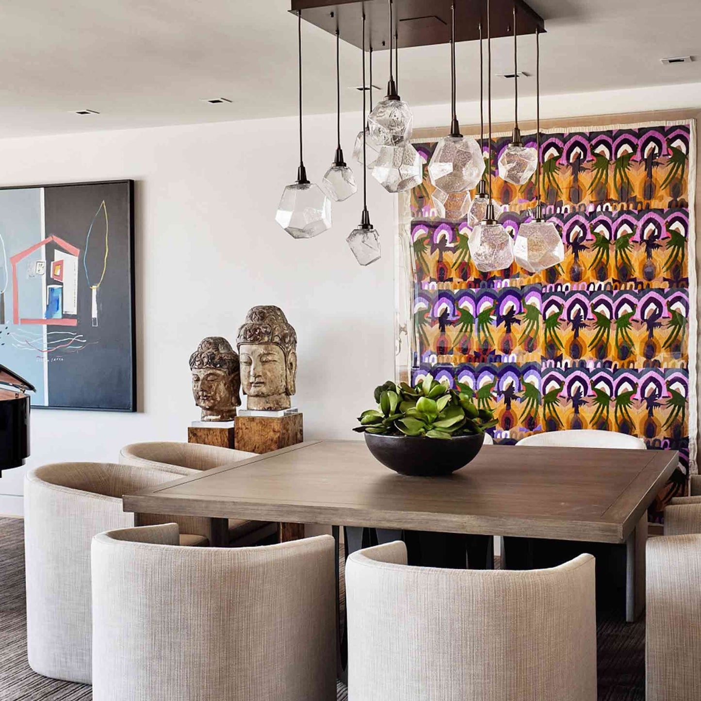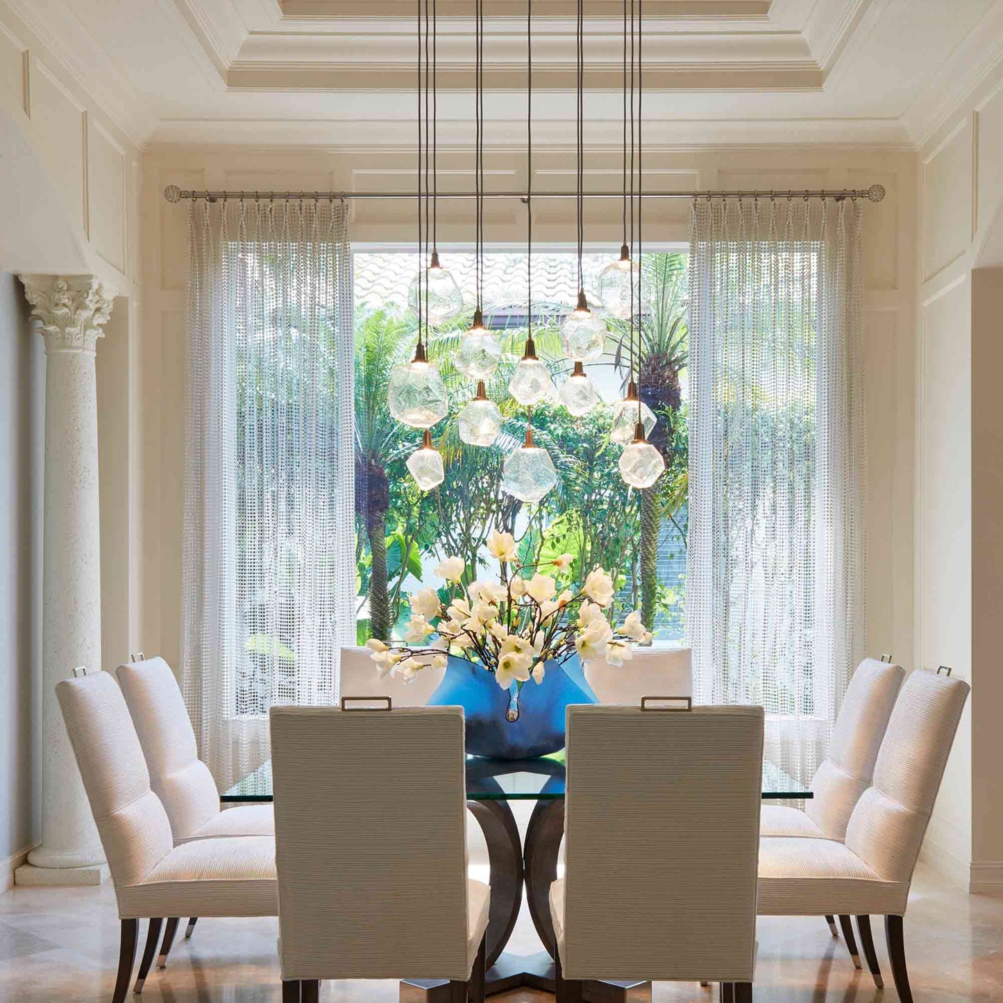 Blown glass shades are inspired by the rugged, organic shapes of gemstones mined from the earth. The Gem Grand LED Multi Light Pendant Light from Hammerton Studio creates a sparkling focal point as shades descend at varying lengths from a round ceiling plate over your entry, stairwell, or living room.